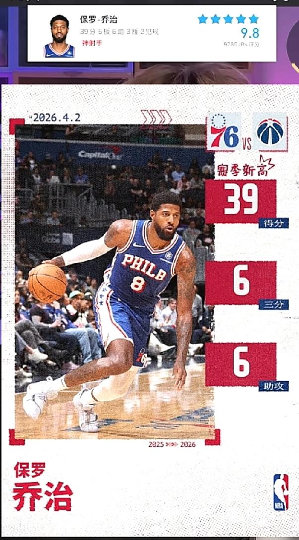 禁赛归来连爆四场,39+0失误打服全联盟,东部格局要变天! 对阵奇才一战,保罗乔治彻底打疯! 全场出战30分钟,22投15中、三分12中6,狂砍39分5篮板6助攻3抢断,全场0失误、正负值+26,攻防一体尽显巨星本色。 禁赛25场比赛复出后的4场比赛,乔治状态一路飙升,场均贡献28分7篮板3助攻3抢断,投篮命中率52%、三分命中率43%,攻防两端统治力拉满,完全看不出久疏战阵的痕迹。 曾经的乔大将军正式归来! 如此火热状态配上76人的阵容强度,这支球队无疑将成为东部最危险的搅局者,任何对手碰上都得心惊胆战。 你觉得,满血归来的保罗乔治,能带领76人在东部闯出一片天吗?