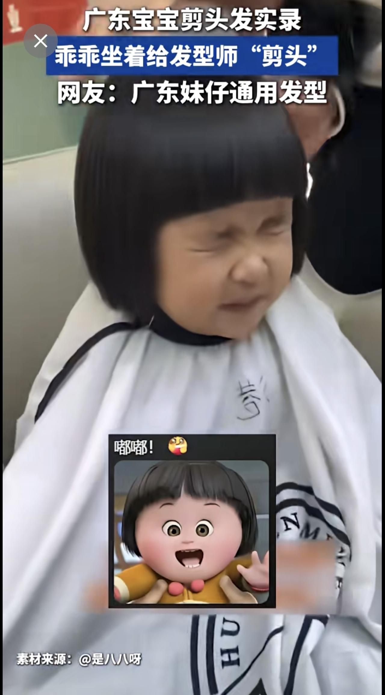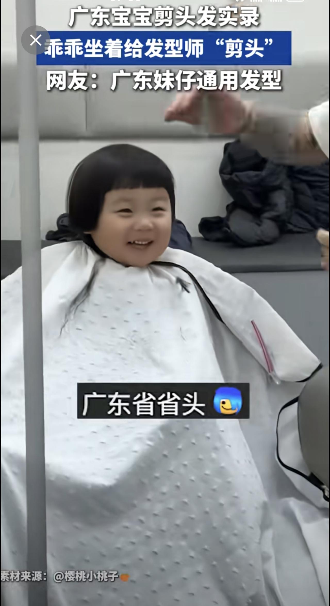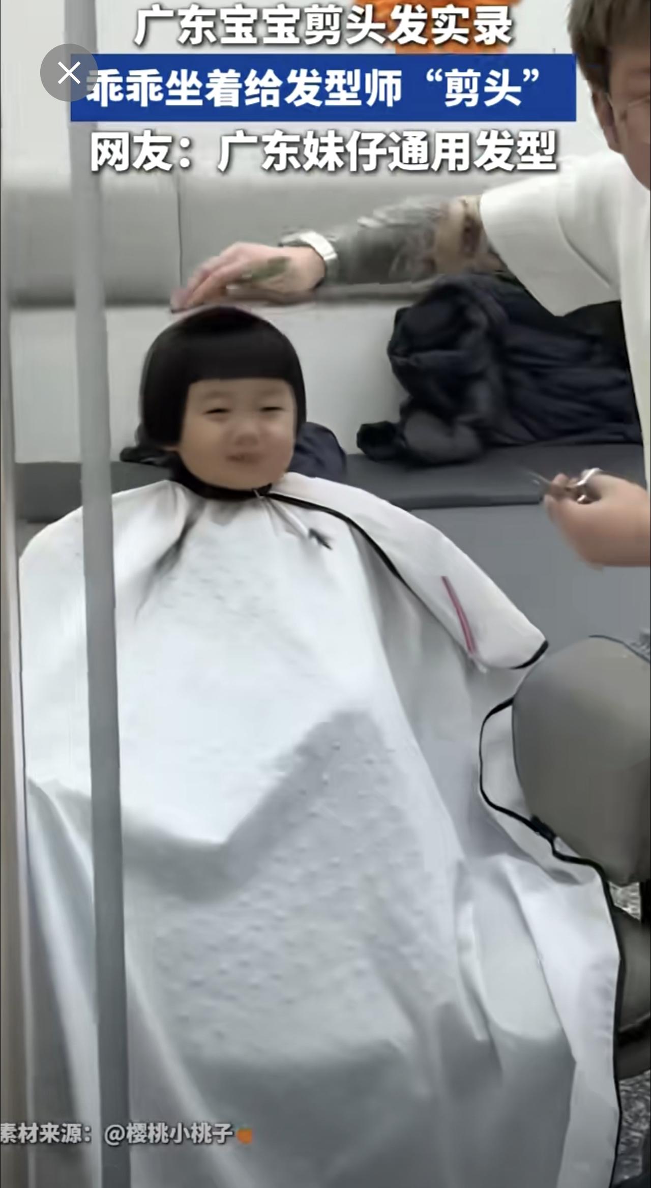 广东宝宝剪头发实录,乖乖坐着给发型师”剪头“,网友:广东妹仔通用发型。(视频来源: @樱桃小桃子) 广东 萌娃 搞笑