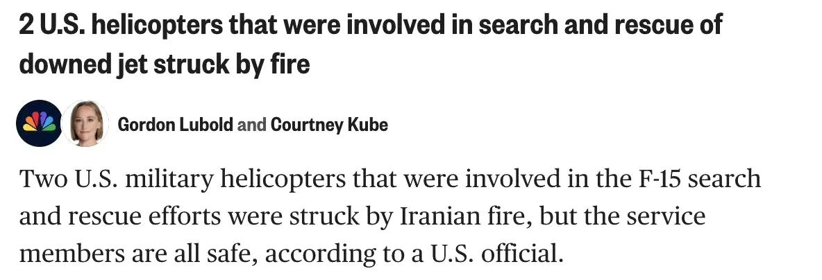 美国NBC新闻报道称,参与搜救F-15E飞行员的2架美军HH-60W战斗搜救直升机被伊朗地面防空火力击中,但是都挣扎着飞离伊朗边境,没有掉下去。稍早前发过第一架HH-60W被击中的照片,网友们可以参看。