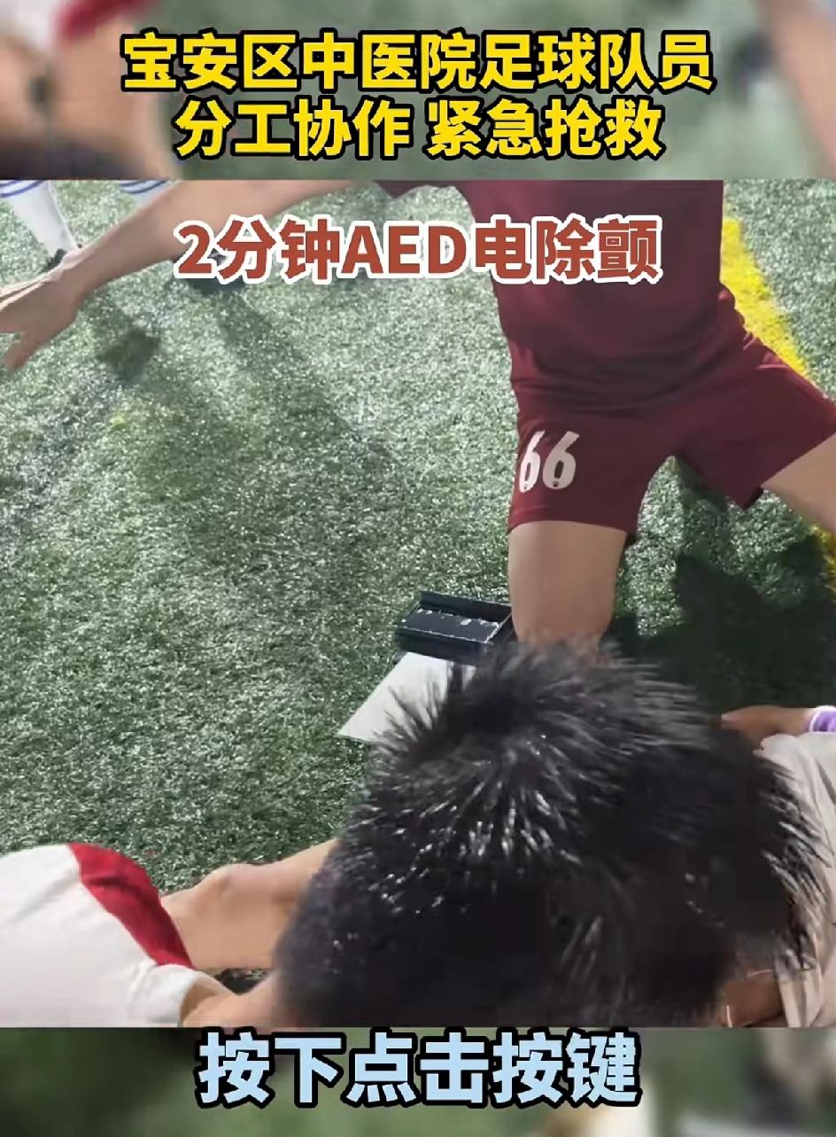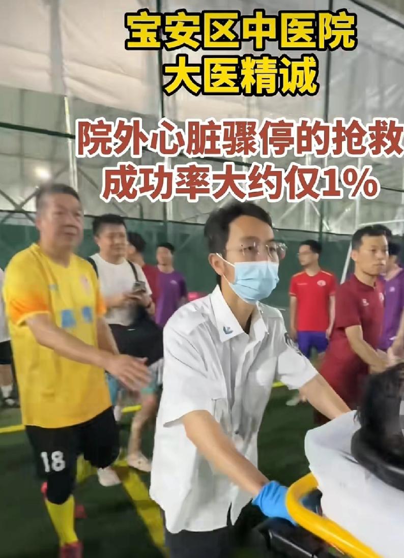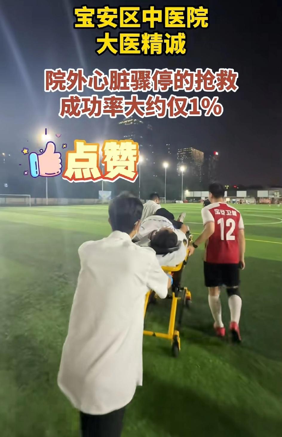 4月2日深圳宝安足球场有位球员在球场,19:14:20的时候,突发心源性猝死,出现意识丧失抽搐,倒地昏迷。本身他们这次参赛的队员全是宝安区中医院的医生们。那就有球员喊医生,医生快过来,这里有人晕倒了,也同时拨打了120,还有人跑去取AED。前后十几秒钟的时间,心血管科的彭明医生赶紧给他进行心肺复苏。2分半钟的时候,患者恢复了心跳。简直就是个奇迹,院外心肺复苏的成功率仅有1%。患者恢复意识后,大家都在那里欢呼,120的急救的担架也到了,迅速送到医院。这个人很幸运,天时地利人和。 但不是每个人都能这么幸运。有心脏方面问题的还是及时检查做心冠造影。