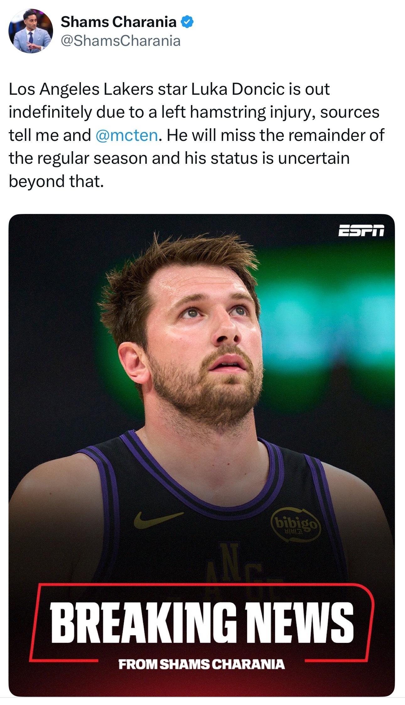 噩耗!东契奇被诊断为腿筋二级拉伤!二级拉伤又称部分撕裂或不完全撕裂,该类型损伤的平均缺阵时长为35天(约14.7场比赛)。
