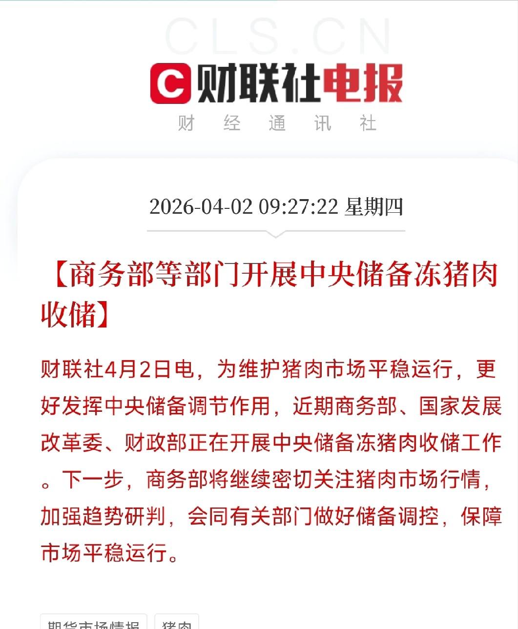 猪肉便宜到国家出手了,释放什么信号? 刚刷到一条消息,商务部等部门正在开展中央储备冻猪肉收储。翻译一下:猪肉太便宜了,国家看不下去了,开始进场托底。 老百姓餐桌上最常见的猪肉,正经历一场罕见的价格暴跌。 全国生猪收购价已经跌到每公斤 10 块出头,部分产区甚至跌破 10 元,换算下来一斤不到 5 块钱,这个价格水平直接创下 2018 年以来的最低记录。 养猪的农户和企业卖一头猪就要亏上三四百块,亏到连本钱都收不回来,整个行业已经连续半年处在深度亏损状态。 面对这样的行业寒冬,国家没坐视不管,商务部联合多部门出手,启动中央储备冻猪肉收储工作,想给持续下坠的猪价托个底。 这事看着简单,其实藏着不少门道,关系到养殖户的生计,也关系到咱们未来吃肉的成本,得掰开揉碎了讲明白。 猪价能跌这么惨,核心原因就是市场上的猪太多了,供给远远超过需求。 前几年猪价高的时候,不管是大企业还是小散户,都在拼命扩产能,能繁母猪的存栏量一直处在高位。 这两年养殖技术又不断提升,一头母猪一年能提供的仔猪数量比以前多了不少,规模化养殖场的效率也越来越高,生猪出栏量自然就跟着猛涨。 2025 年全国猪肉产量直接冲到 5938 万吨,创了历史新高。 到了 2026 年春节后,本该是消费淡季,生猪出栏量却没跟着降,2 月份屠宰量同比直接涨了 40% 多。 一边是源源不断的生猪涌向市场,一边是节后大家家里储备肉还没吃完,消费需求疲软,供需一失衡,猪价只能一路往下滑。 更让养殖户难受的是,猪价在跌,养殖成本却没降。 喂猪的玉米、豆粕价格一直居高不下,玉米每公斤比去年同期涨了近 6%,豆粕也维持在每公斤 3 块 4 以上的高位。 算一笔明白账,现在养一头猪到出栏,成本大概在 13 到 14 块钱一公斤,可猪价才 10 块左右,每卖一头就要亏 3 块多,养得越多亏得越多。 很多养殖户都陷入两难,继续养吧,每天都在烧钱;想放弃吧,前期投进去的本钱全打了水漂,只能硬着头皮扛着,整个行业都被裹在亏损的漩涡里出不来。 国家这时候启动冻猪肉收储,很多人觉得收个 1 万吨,对每天要消费几十万吨猪肉的市场来说,根本就是杯水车薪,拉不起价格。 这种想法只看到表面,没看懂政策的真正用意。收储的核心目的不是靠这点量把价格拉回去,而是给市场释放一个清晰的信号,国家不会任由猪价无底线下跌,已经到了政策托底的阶段。 这个信号能直接稳住养殖户的情绪,防止大家因为恐慌集体抛售生猪,更避免大家大规模淘汰能繁母猪。 要是真出现恐慌性杀母猪,短期看供应能减少,可到了明年后年,生猪出栏量会断崖式下跌,到时候猪肉价格肯定会报复性暴涨,咱们又要面临吃不起肉的局面。 收储就是给行业留口气,让产能慢慢调整,别一下子把行业根基毁了。 从实际效果看,收储能暂时止住猪价暴跌的势头,给市场一点喘息空间,但想短期让价格大幅回升根本不现实。 现在市场供应过剩的基本面没改变,能繁母猪存栏量还是比合理目标多,后续生猪出栏量依然会保持高位。 所以接下来一段时间,猪价大概率还是在低位震荡,不会立马反转。对养殖户来说,别指望收储能救市,还是得理性安排出栏,别盲目压栏赌行情,同时想办法降成本,慢慢调整产能,熬过这段寒冬期。 这场猪肉价格风波,本质上是市场供需规律和行业周期的必然结果,也是国家调控和市场运行相互作用的缩影。 国家出手收储,是在平衡短期和长期利益,既保护养殖户的基本生计,防止行业崩盘,也避免未来价格大起大落,守护咱们的民生饭碗。 对咱们普通人来说,当下能享受到相对便宜的猪肉,是短暂的红利,但也要明白,只有让养殖行业平稳度过低谷,未来才能一直有稳定、平价的猪肉吃。 行业的调整总会有阵痛,产能慢慢回归合理,市场才能重回平衡。 只要供需匹配上,价格自然会稳定下来,不管是养殖户还是消费者,都能从中受益。 稳住产业根基,才能守住餐桌幸福,这是猪肉市场给我们最实在的道理。