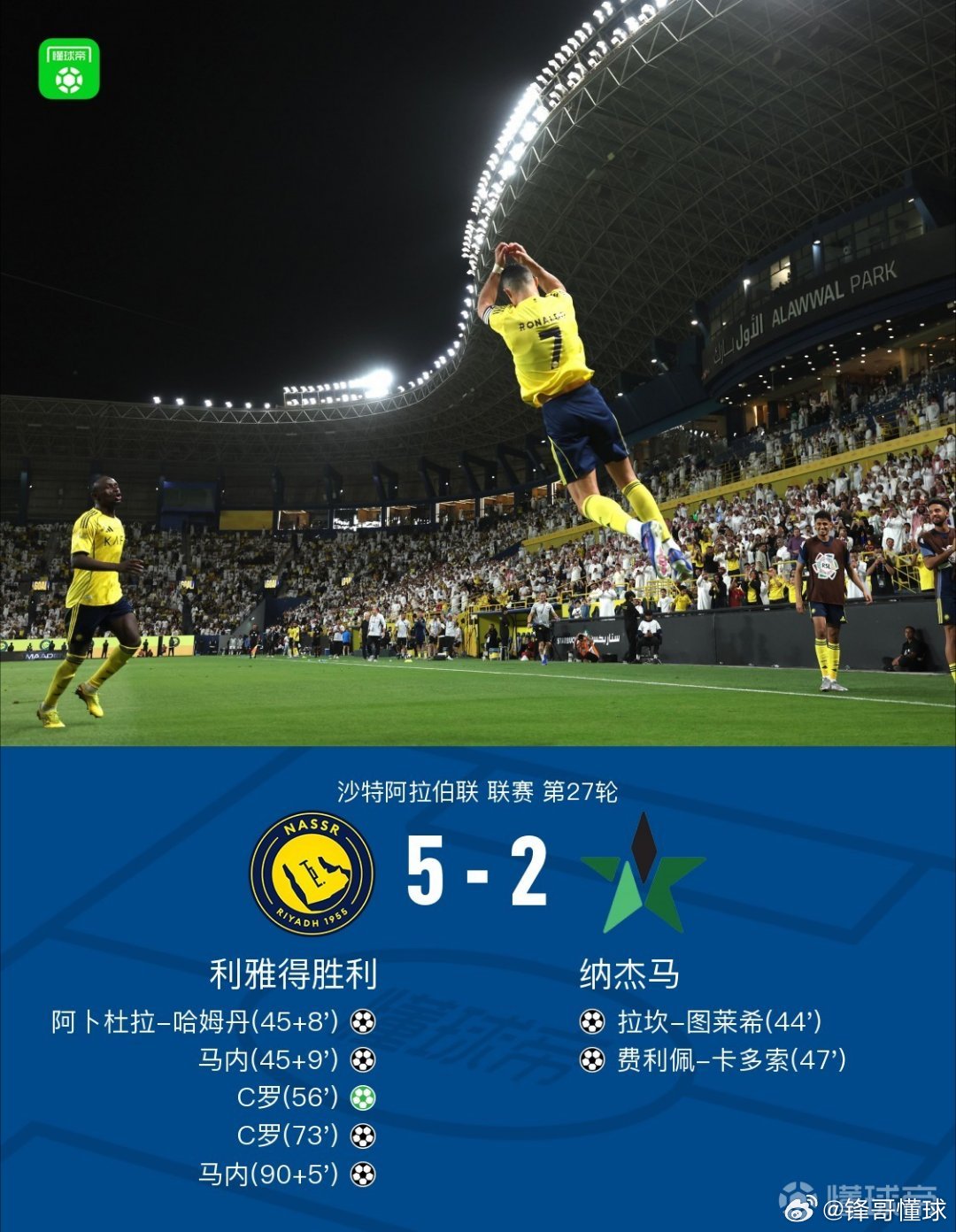 利雅得胜利c罗马内 利雅得胜利5-2纳杰马,C罗、马内各自双响建功。