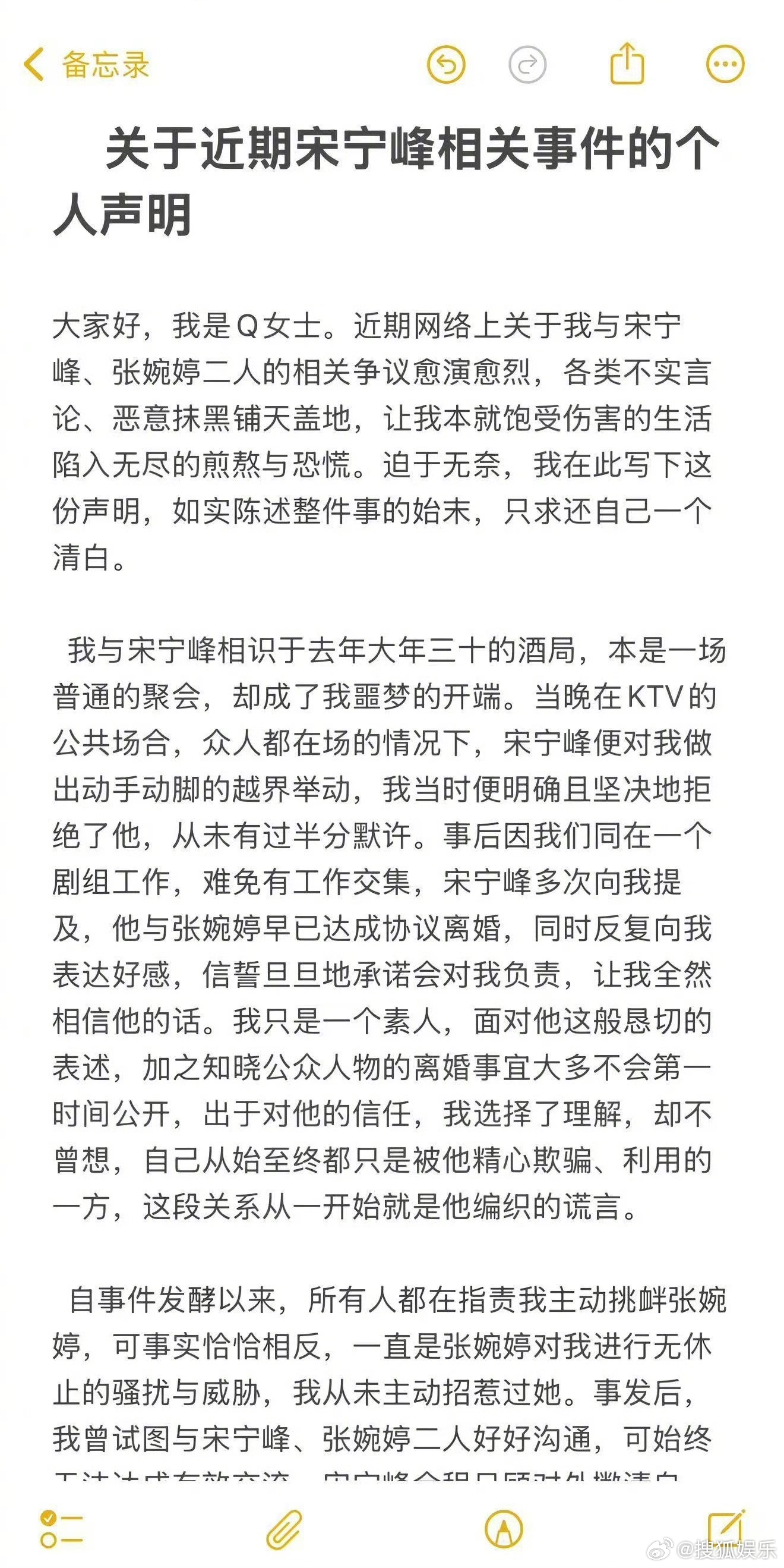 Q女士声明 昨晚,宋宁峰出轨对象Q女士在社交账号发布长文,回应自己和宋宁峰的出轨事件: