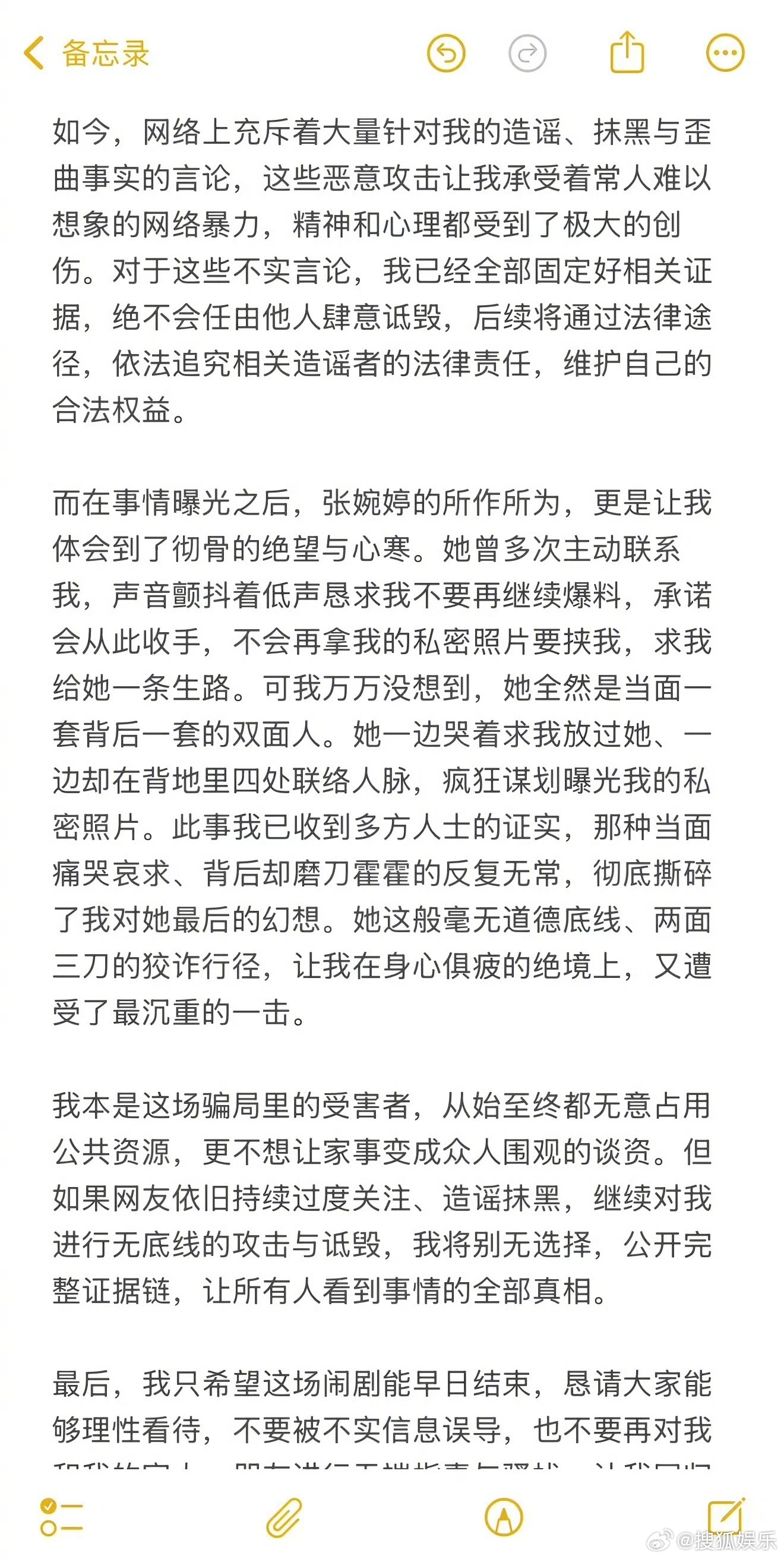 ⑤爆料发出后,张婉婷多次主动联系Q女士求放过,承诺不再拿私密照片做要挟,背地里却四处联络人脉想要找人曝光Q女士的私密照片,当面一套背后一套的做法让Q女士不想再忍。