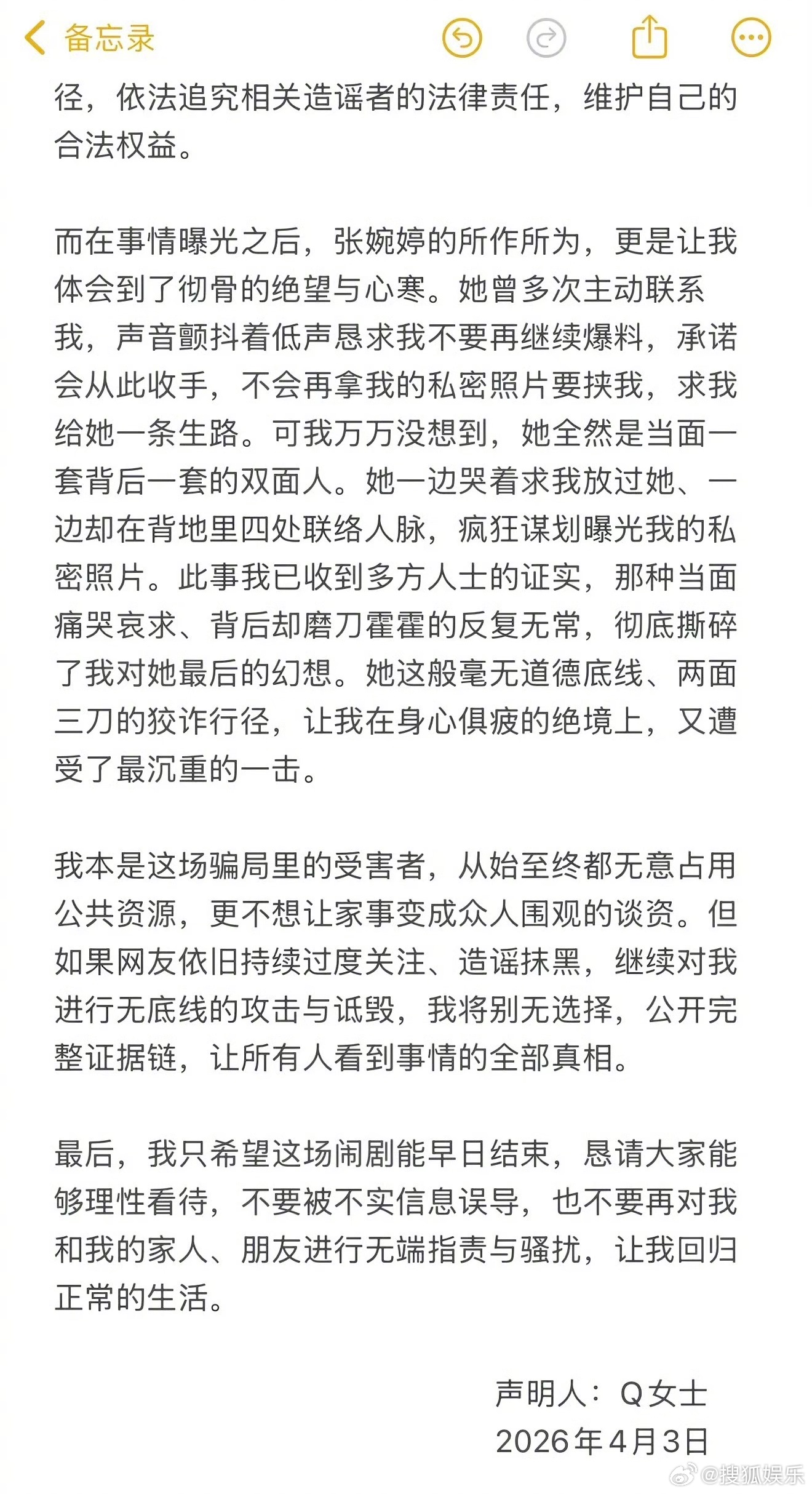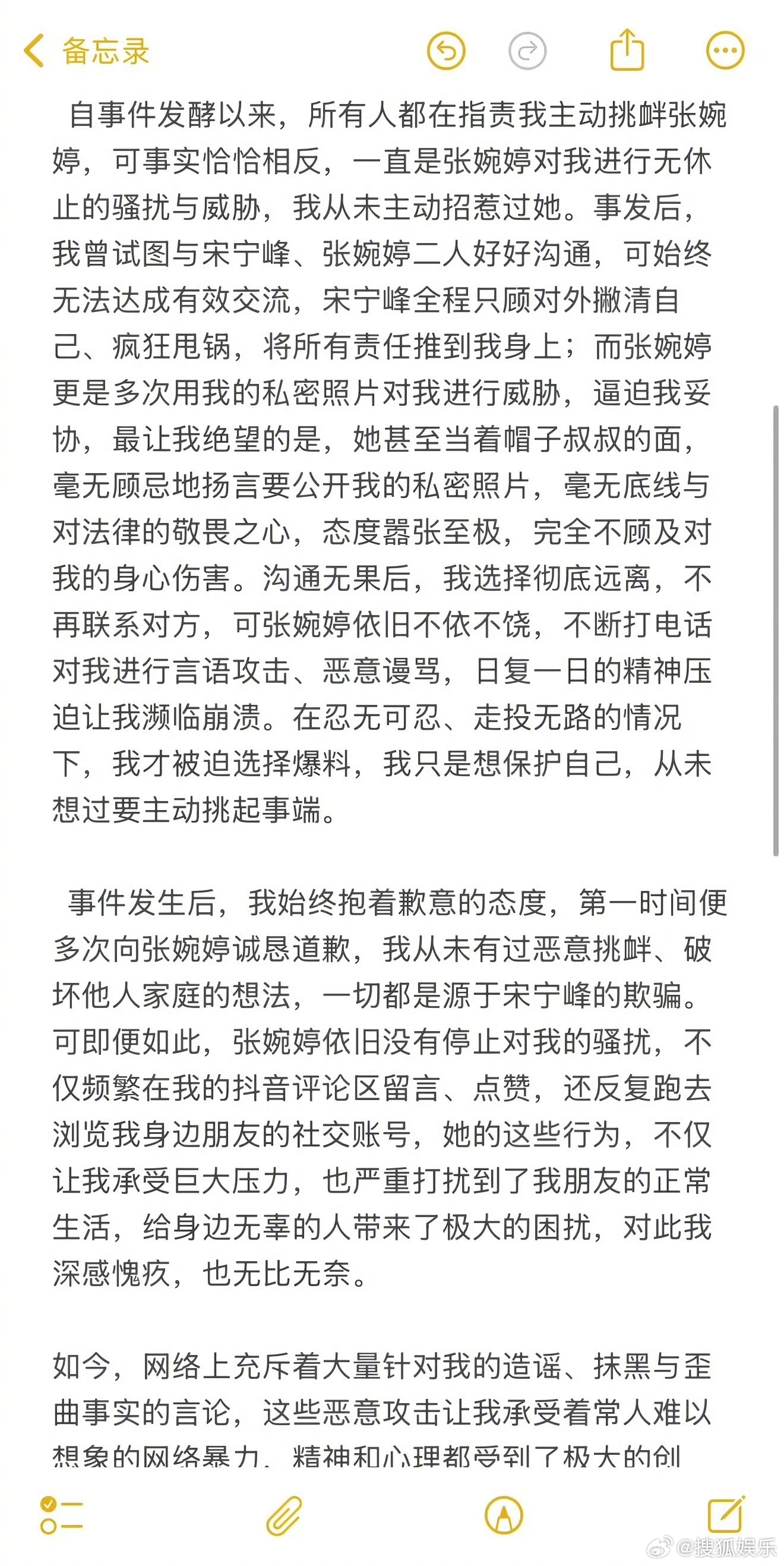 ③Q女士没有主动招惹张婉婷,是私情暴露后宋宁峰将所有责任推到Q女士身上,张婉婷又反复要拿私密照片做威胁。双方沟通无果后,张婉婷持续对Q女士进行言语攻击,无奈之下Q女士才选择爆料自保;