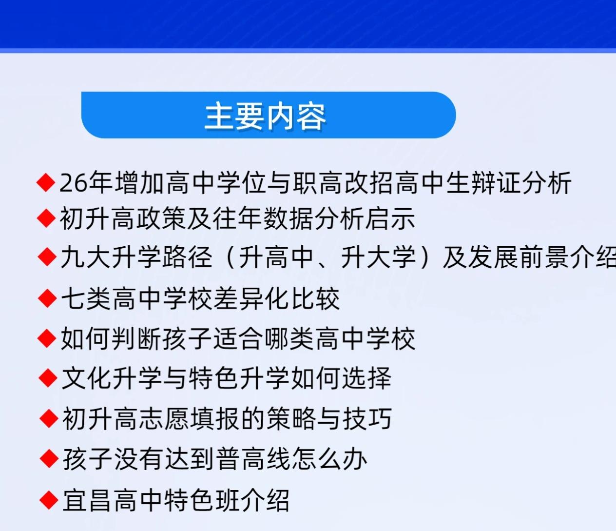 大宜昌市初升高如何择校? 今天是2026年4月4日,清明节三天假期的第一天。宜昌中考还有两个多月,不少九年级家长开始为孩子的未来,做起了规划。 俗话说,凡事预则立不预则废。提前做好相关准备,对于孩子的未来无疑是百利而无一害。2026年的中考,从大的政策来说,还是出现了一些变化,普高扩充学位,高职院校进一步拓展高考班,对于很多初三家长来说,多了一些思路,也多了一些纠结。 为了让大家全方面了解宜昌升学的诸多细节,清明节假期的最后一天,也就是4月6日上午9点半,新华书店举办了一场公益讲座,有需要的家长们可以留言。 我是@湖北宜都李老师,常年关注湖北高中联考和湖北升学规划,期待您的关注和点赞!