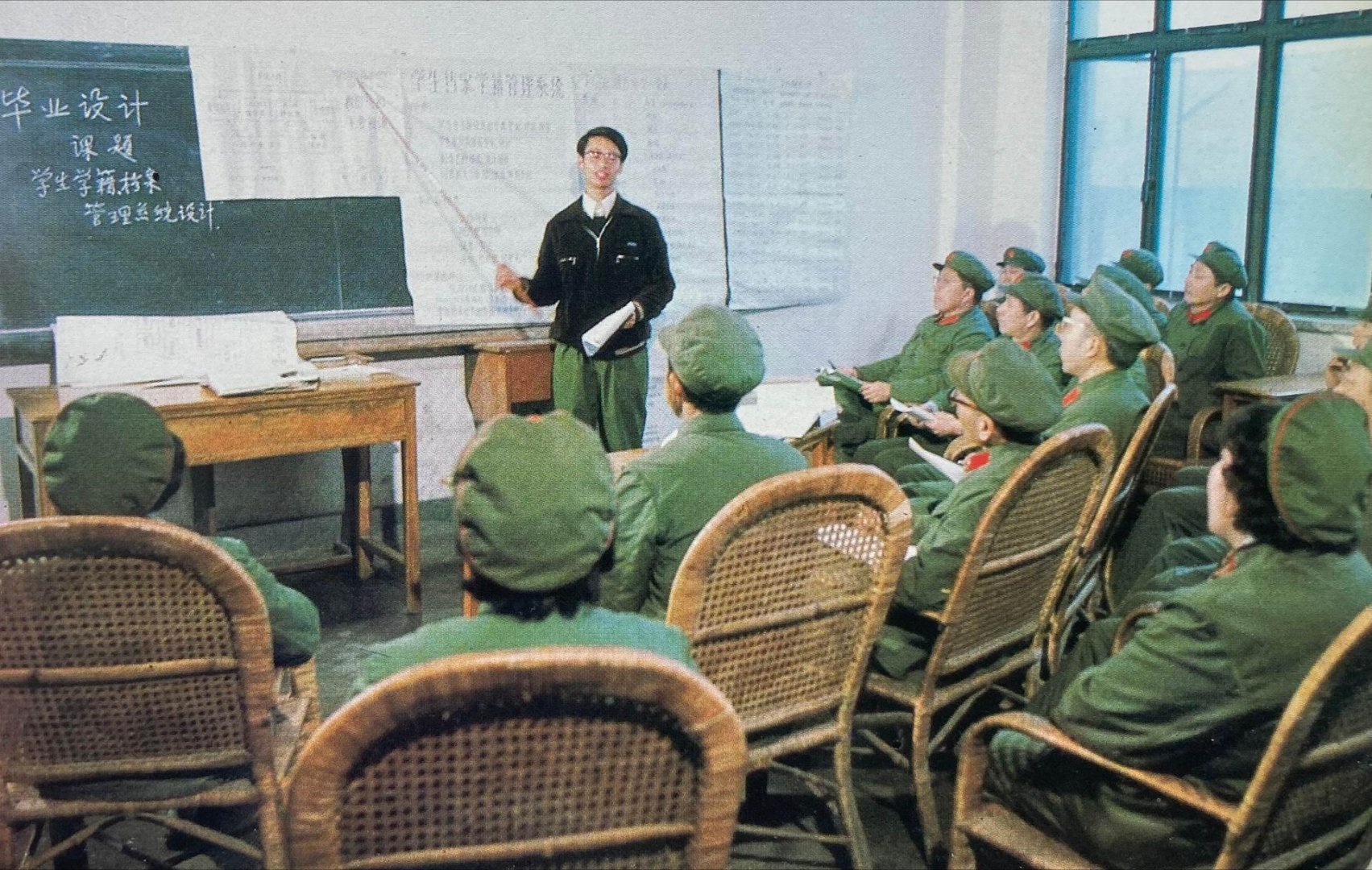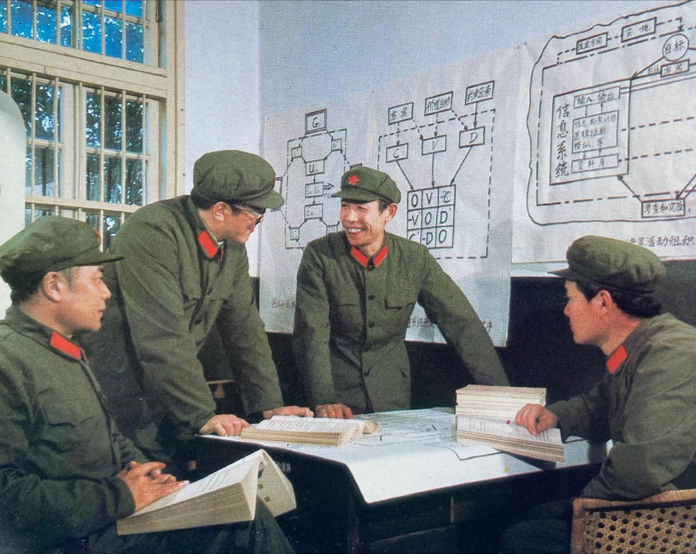 八十年代|科研风采。图一:毕业答辩图二:汪浩教授与系统工程系教师研究系统工程原理图三:卫星振动特性测试