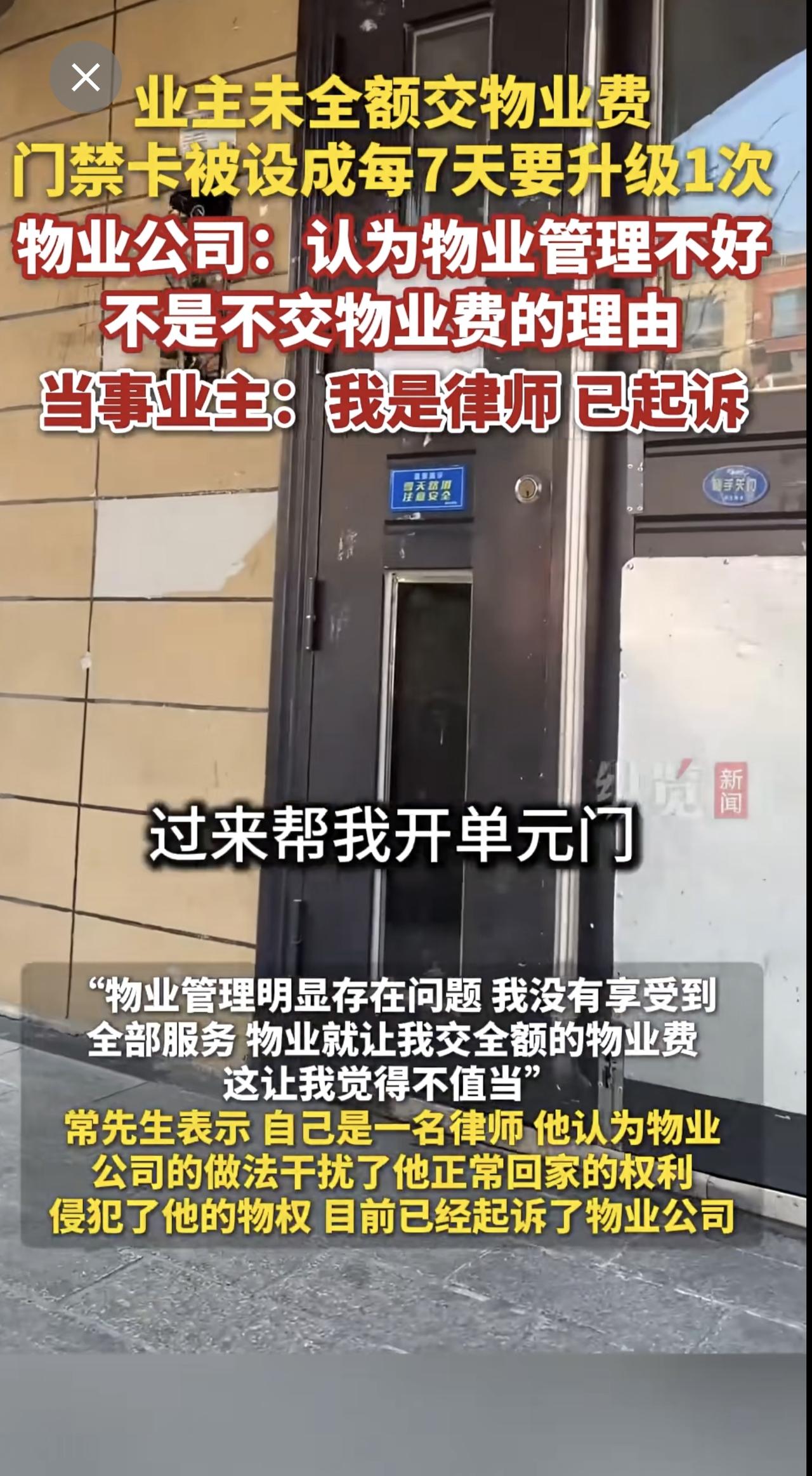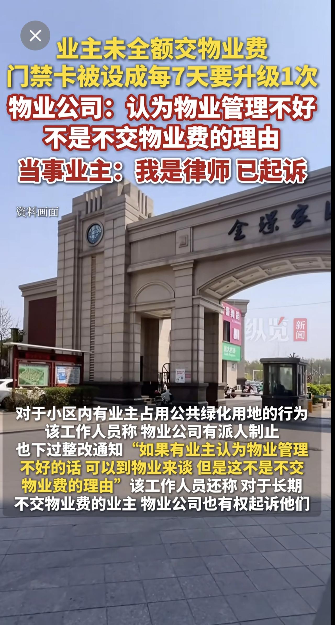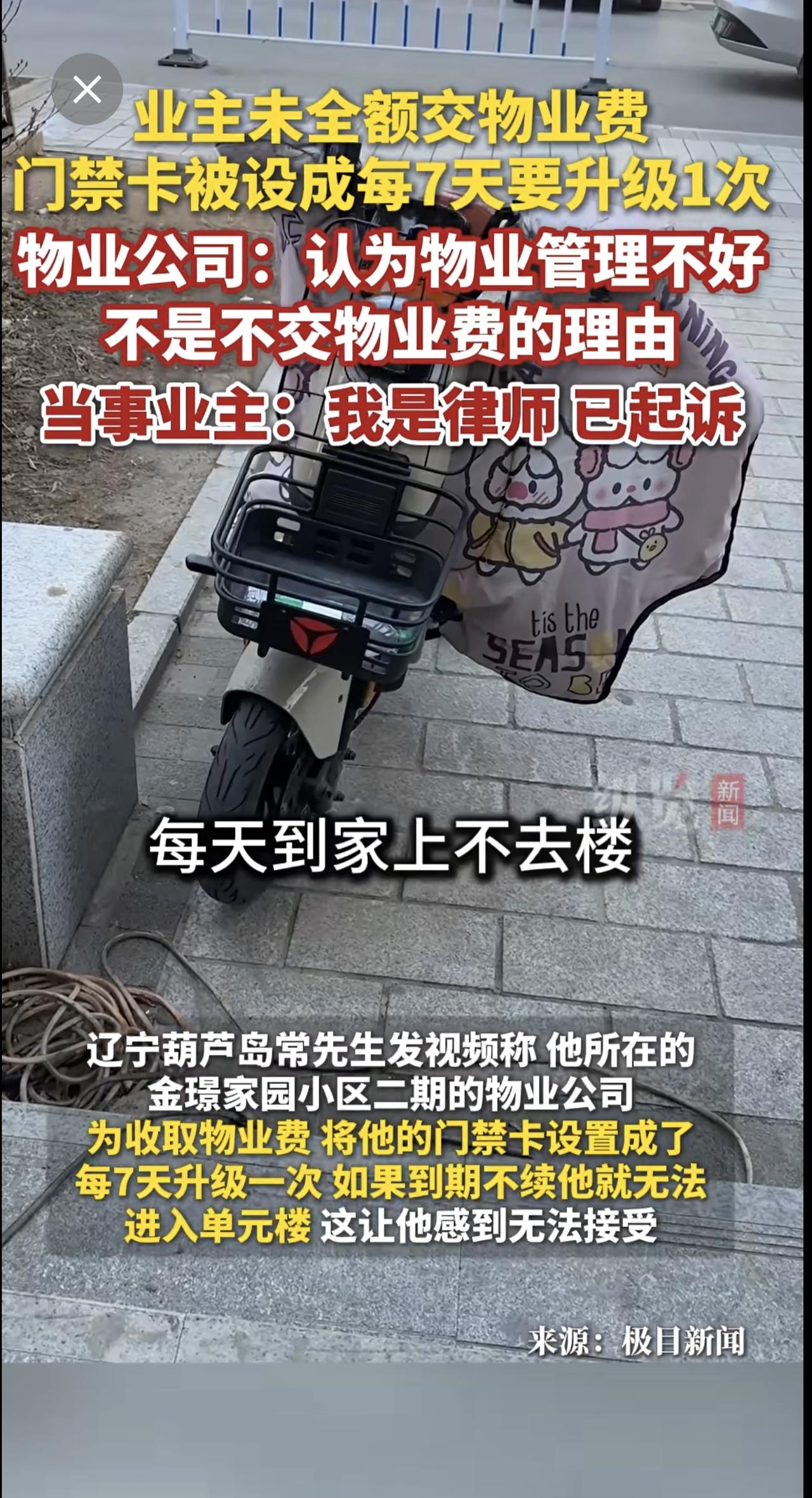 4月3日,辽宁葫芦岛,物业公司回应“业主未全额交物业费,门禁卡被设成每7天要升级1次”:认为物业管理不好,不是不交物业费的理由。当事业主:我是律师,已起诉。