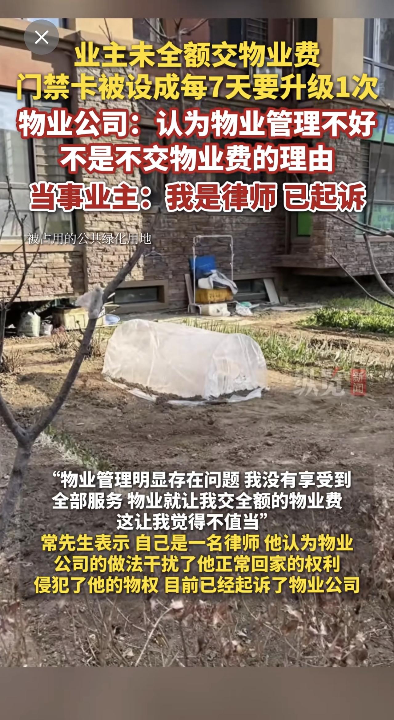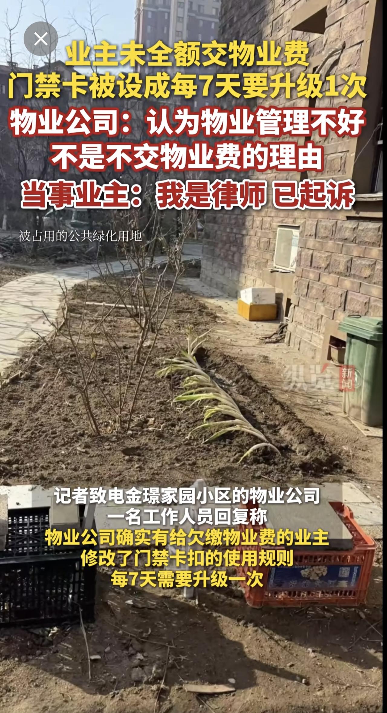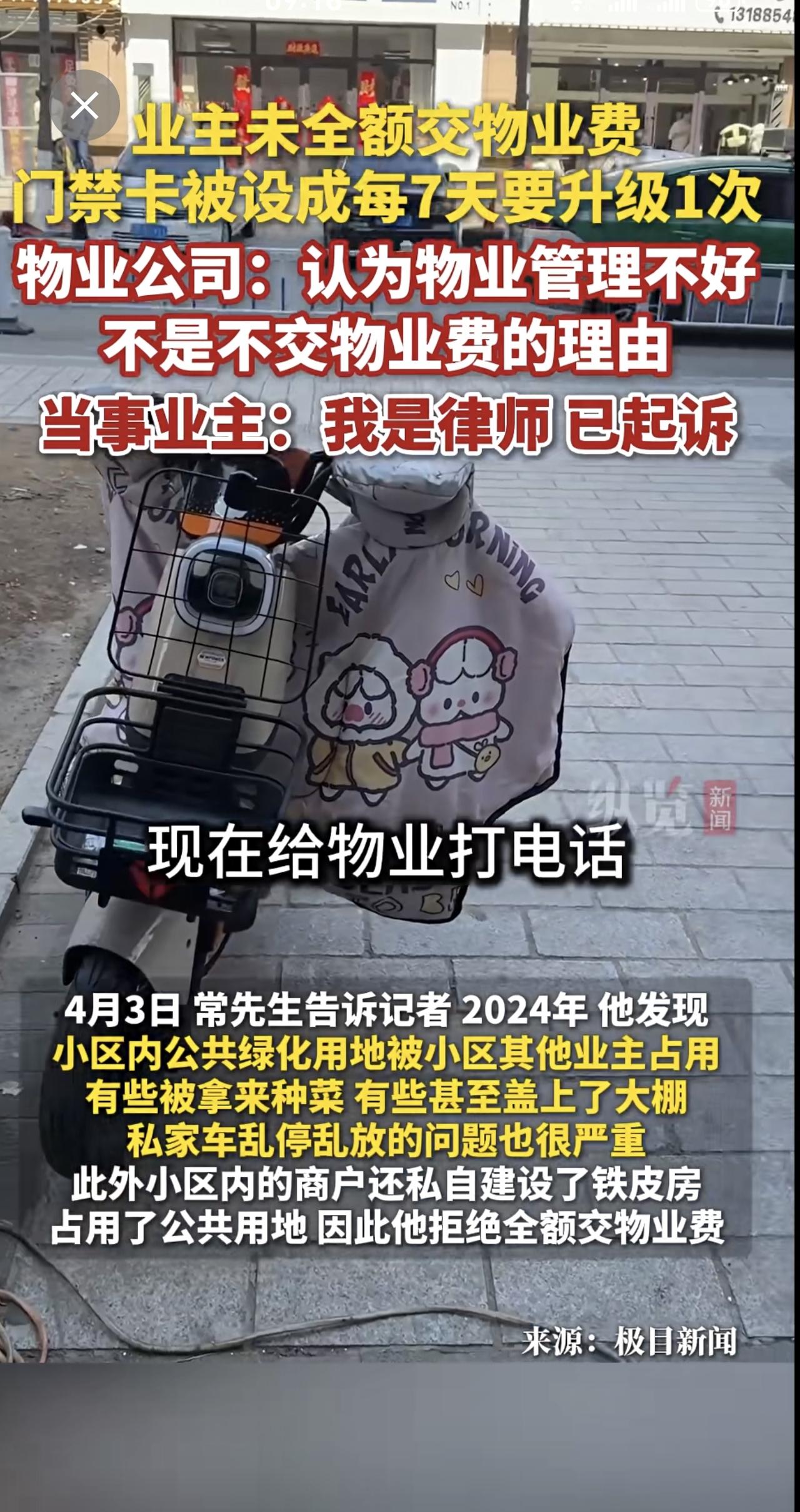 4月3日,辽宁葫芦岛,物业公司回应“业主未全额交物业费,门禁卡被设成每7天要升级1次”:认为物业管理不好,不是不交物业费的理由。当事业主:我是律师,已起诉。