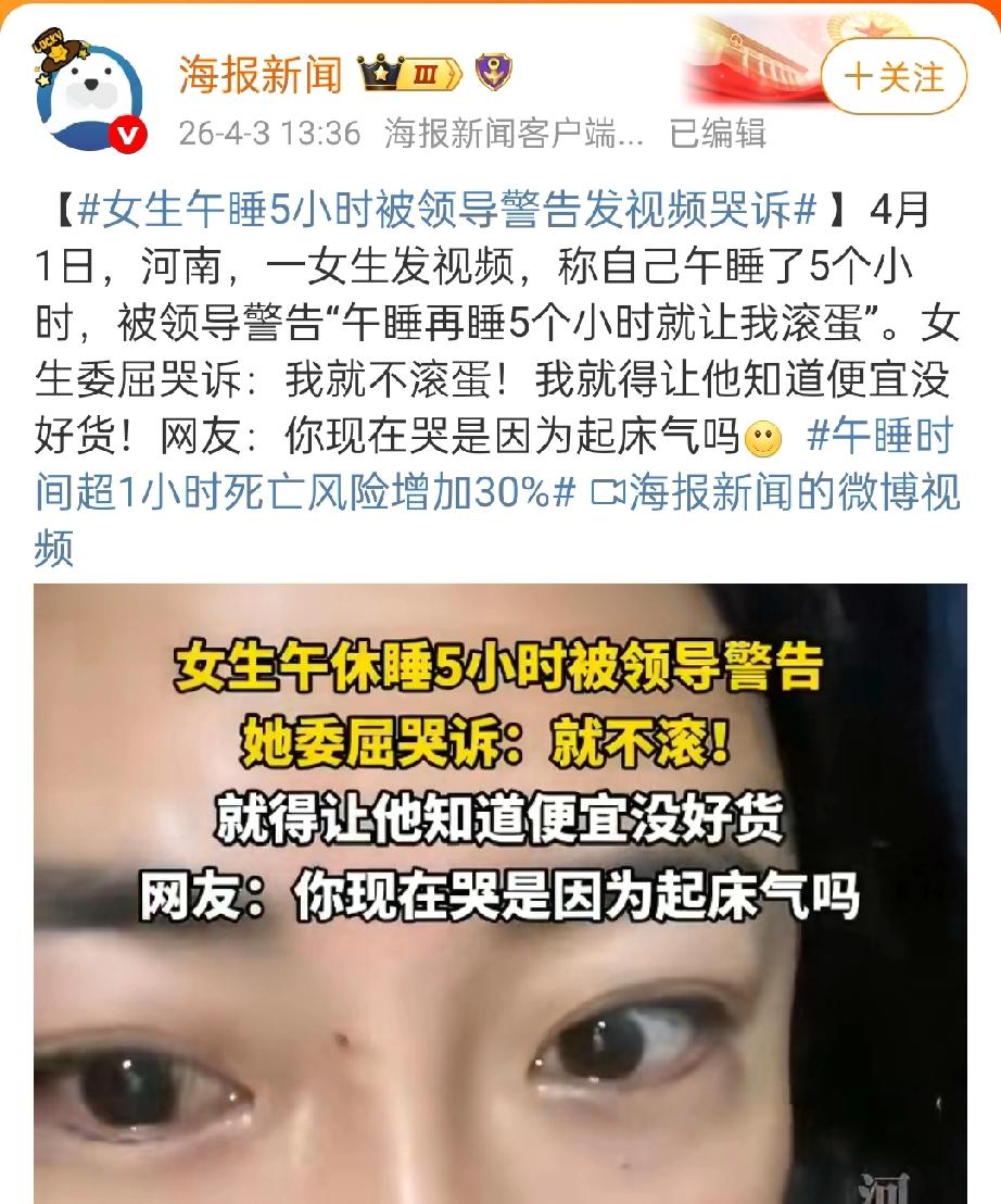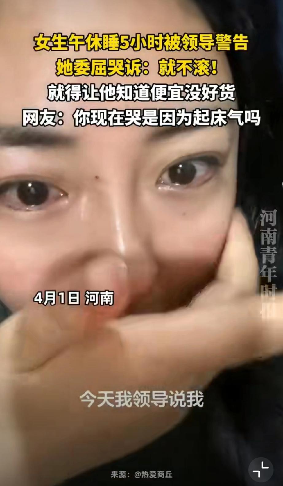女生午睡5小时被领导警告发视频哭诉。女生委屈哭诉:我就不滚蛋!我就得让他知道便宜没好货![憨笑][憨笑][憨笑][憨笑] 请假员工遭辞退 女员工越级举报 员工被误解