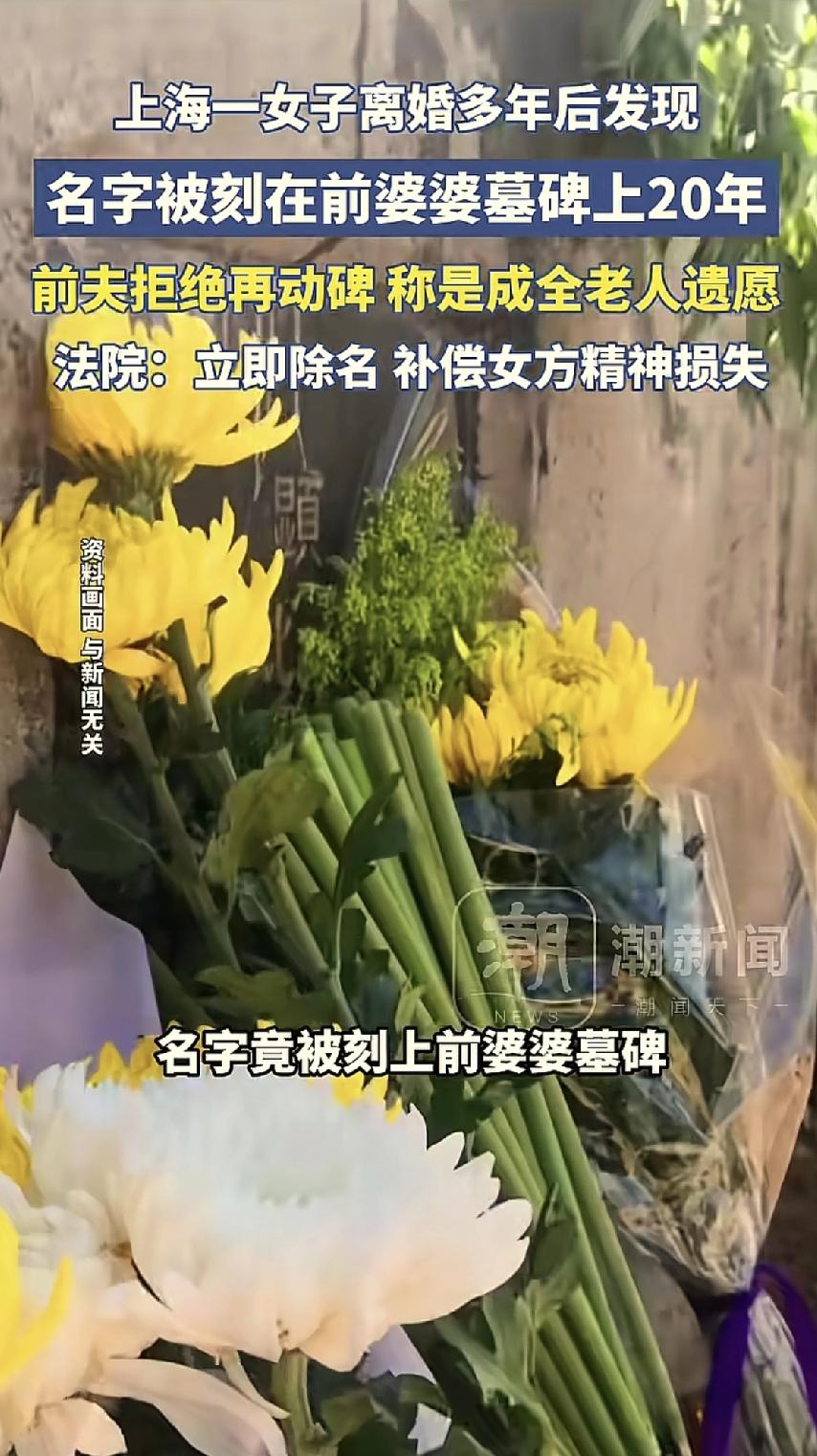 上海,一女子与前夫离婚多年,最近陪女儿扫墓时,偶然路过前婆婆的墓地,竟发现墓碑上赫然刻着自己的名字,身份一栏还标注着“儿媳”,女子火冒三丈,找到前夫要求去除名字。 女子和前夫结婚近30年,最后还是离了。离婚后,前婆婆去世,前夫按照母亲的遗愿,把女子的名字刻在了墓碑上,身份还写着“儿媳”。这事女子一直不知道,直到最近,她女儿去扫墓才发现,然后告诉了她。 她觉得自己早就和前夫离婚了,离婚就是两家人了,对方没经过同意就用她的名字,还把她和过去的身份强行绑在一起,不仅侵犯了她的姓名权,还让她心里很膈应,怕亲友议论、影响现在的生活。 女子找前夫要求把名字去掉,对方却不愿意,说墓碑立了二十多年,重新刻碑会打扰逝者安宁,双方谈不拢,女子就把前夫告上了法院,要求除名还得赔偿精神损失。 最后法院调解,男子答应一个月内把女子的名字从墓碑上去掉,还自愿给了一笔钱赔礼道歉,双方这事才算解决。 以前老一辈可能觉得,只要生了孩子,哪怕离婚了,也算是他们家的人。但现在时代变了,离婚在法律上就是“一别两宽,各生欢喜”。 不过老人生前肯定非常认可这个儿媳,前夫的初衷也没恶意,就是想完成老母亲的遗愿,让老人走得安心,这份孝心和念旧情的心意能理解。而且墓碑立了二十多年,老一辈本就讲究动碑不吉利,这事其实可以好好商量,没必要闹上法院。 不管是亲情还是旧情,相处的底线都是互相尊重,哪怕是出于好意,也不能替别人做决定。离婚了就该理清身份边界,你的心意再好,也别越界打扰别人的生活。