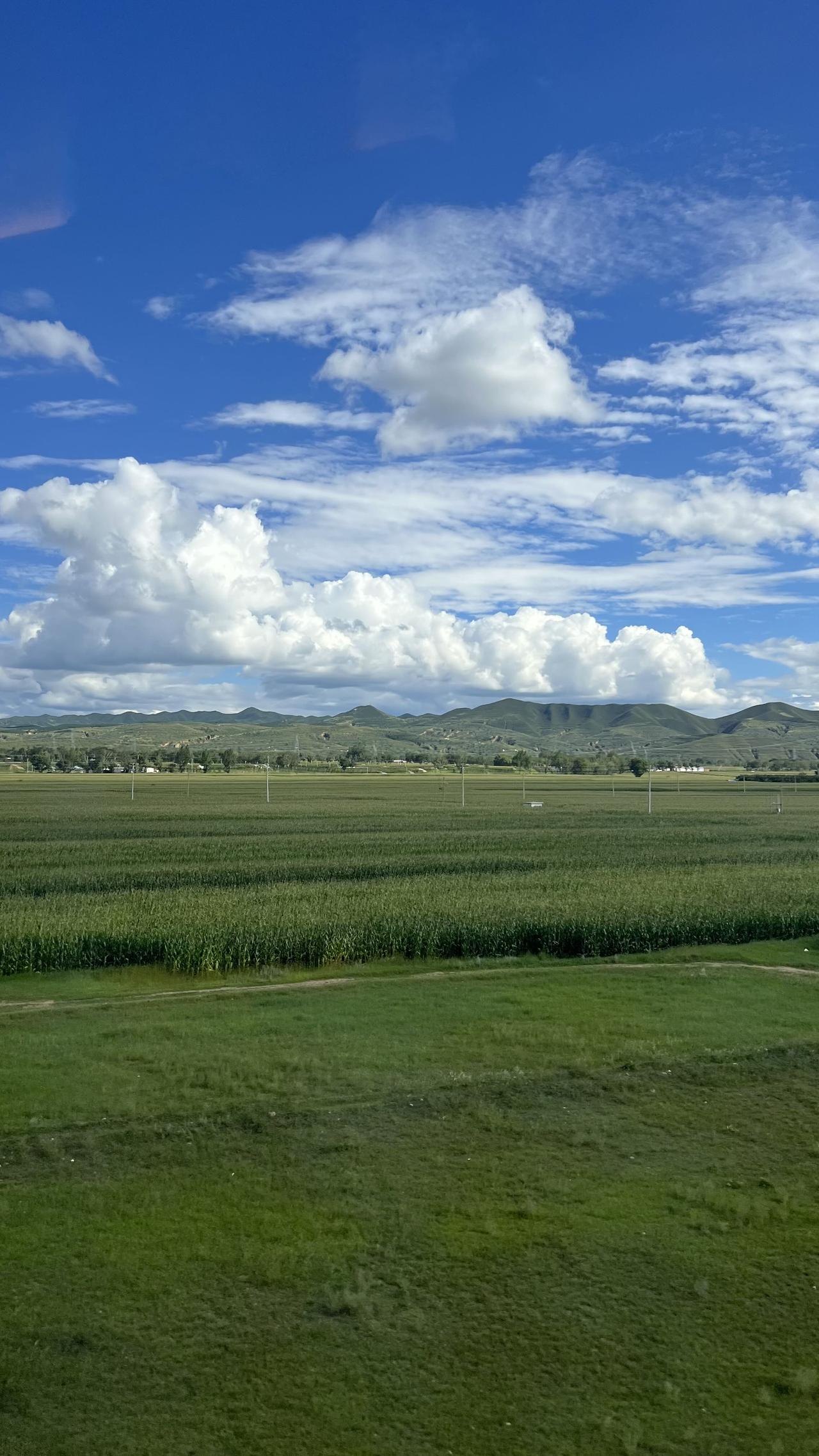 在高铁上的随拍:蓝天白云下的广袤田野,满眼都是绿色沃土,一片宁静与美好。