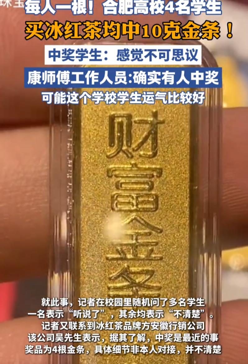 这种捅了奖品窝了?安徽合肥,四名学生到学校的超市内买饮料喝,没成想,几人拧开瓶盖后却不敢相信自己的眼睛,四个人竟然都中奖了,奖品是一根10克金条,厂家:可能几个人运气好 当时,几个学生课间去买水喝。就跟平时一样,冰红茶随便拿了几瓶,拧开盖子,扫码,一个说中了,两个说中了,三个四个全中了 奖品不是再来一瓶,是金条,一根10克的金条 四个人面面相觑,第一反应都是不信,觉得要么是系统出bug了,要么是扫码扫进了什么钓鱼页面。反复查了好几遍,确认就是官方活动,就是一等奖,就是金条 这事儿传出去之后,评论区基本分两派。一派觉得太假了,同一个学校,同一个超市,同一批人,四瓶全中,这概率说出去谁信?怕不是超市自己搞的营销 另一派开始疯狂艾特康师傅官方,要个说法 结果厂家还真出来说话了。康师傅工作人员证实,确实有学生中奖,没有作秀,没有内幕,可能就是这几个人运气好 很多人忽略了关键信息:这批冰红茶本身就在搞活动,金条是实打实的奖品,不是什么虚假宣传。也就是说,金条确实在奖池里,总有人要中。只不过这一次,中的是同一个宿舍或者同班同学的几个人 这就好比买彩票,头奖在某个城市某个网点被买走,大家觉得正常。但如果这个网点一下子出了四个头奖,所有人都会觉得有问题。可彩票确实没毛病,奖池也确实有那么多奖,只是凑巧落在了同一个地方 说穿了,这种极端小概率事件,发生在你身上叫运气,发生在别人身上叫阴谋。人性就是这样,很难接受别人莫名其妙就中了奖,尤其是自己连个瓶盖都没摸到的时候 换个角度想,厂家也挺难做。如果说这是炒作,那金条是实打实送出去的,成本在那摆着。如果说不是炒作,那这运气也太邪乎了,搞得像剧本。最后只能实话实说:奖是真的,人中奖了,别的我也不知道