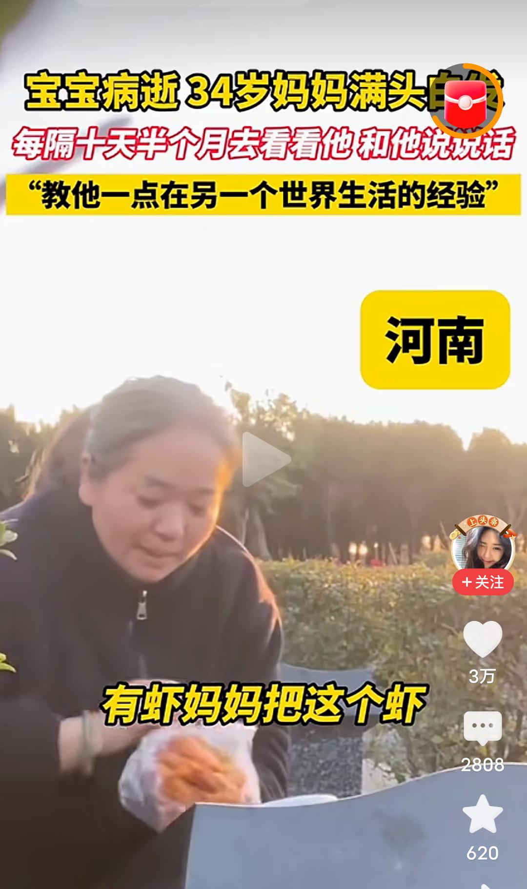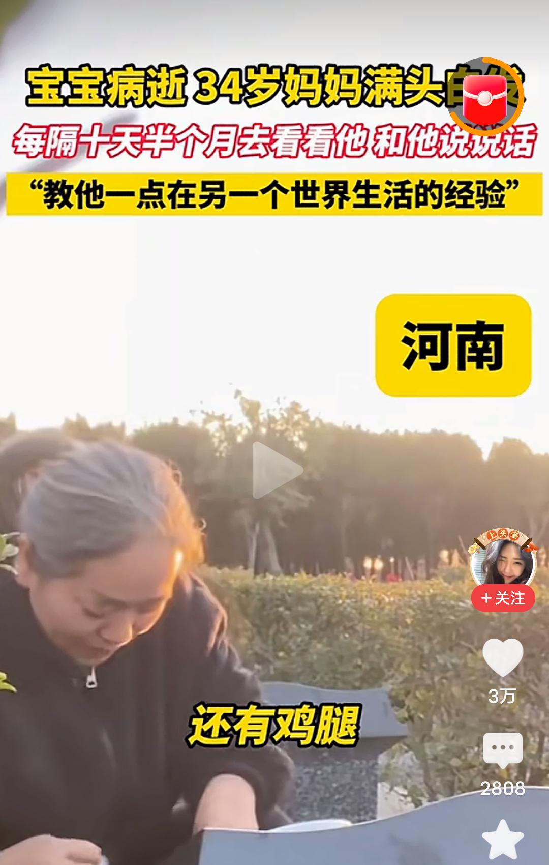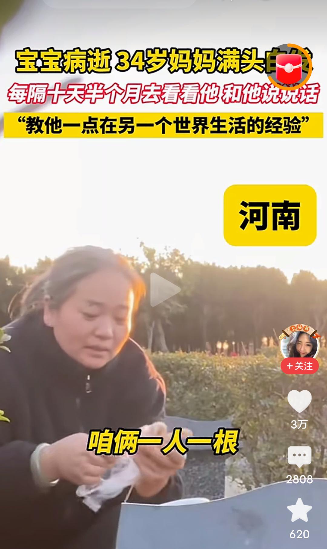 心酸!难受!泪目!发生在河南的一幕,看哭了很多人! 宝宝因病去世,才34岁的妈妈一夜白了头,从此每隔十天半个月就去墓地看看他,和他说说话,教他一点在另一个世界生活的经验,从视频里看到,这位满头白发才34岁的妈妈,给宝宝带了大虾,并帮宝宝剥去虾皮,还带了宝宝爱吃的鸡腿,香肠,并细心的帮宝宝把香肠上的竹签拔掉,又给宝宝打开了酸酸乳…… 我真的看不下去了,也许是年龄大的缘故吧,眼泪不由自主的就流了下来…… 孩子就是妈妈的命,就是妈妈的软肋,就是妈妈的脊梁,孩子没有了,妈妈的魂也丢了。 怎么才能让这个妈妈走出丧子之痛呢?心里的伤口从未愈合,这样过下去实在太疼了。 走不出来,根本走不出来,这就是妈妈对孩子的痛彻心扉的痛和至死不渝的爱!最纯净的,最真实的爱! 母子连心的心痛有多少人能懂,母爱的伟大是装不出来的,在天堂的儿子一定能感受到世间的母爱。 孩子,母亲的爱你感受到了吗?若你有灵,请让母亲放下,不要活在回忆与悲伤里,请让她走出来,来过完她本该拥有的阳光与繁华! 再生一个吧,虽然一个孩子是无法代替另一个孩子的,但是还是想劝这个妈妈再生一个孩子,这样至少人生有了另一个寄托,他不是离开了,只是住进了你心里的最深处,就像他以前在你肚子里孕育着,就当做他住进你心里,重回你身体里了。 一生的爱需要用一生的痛来承担,伟大的母爱。 虽然话语苍白无力,但还是想说,希望这位妈妈能早日走出来!