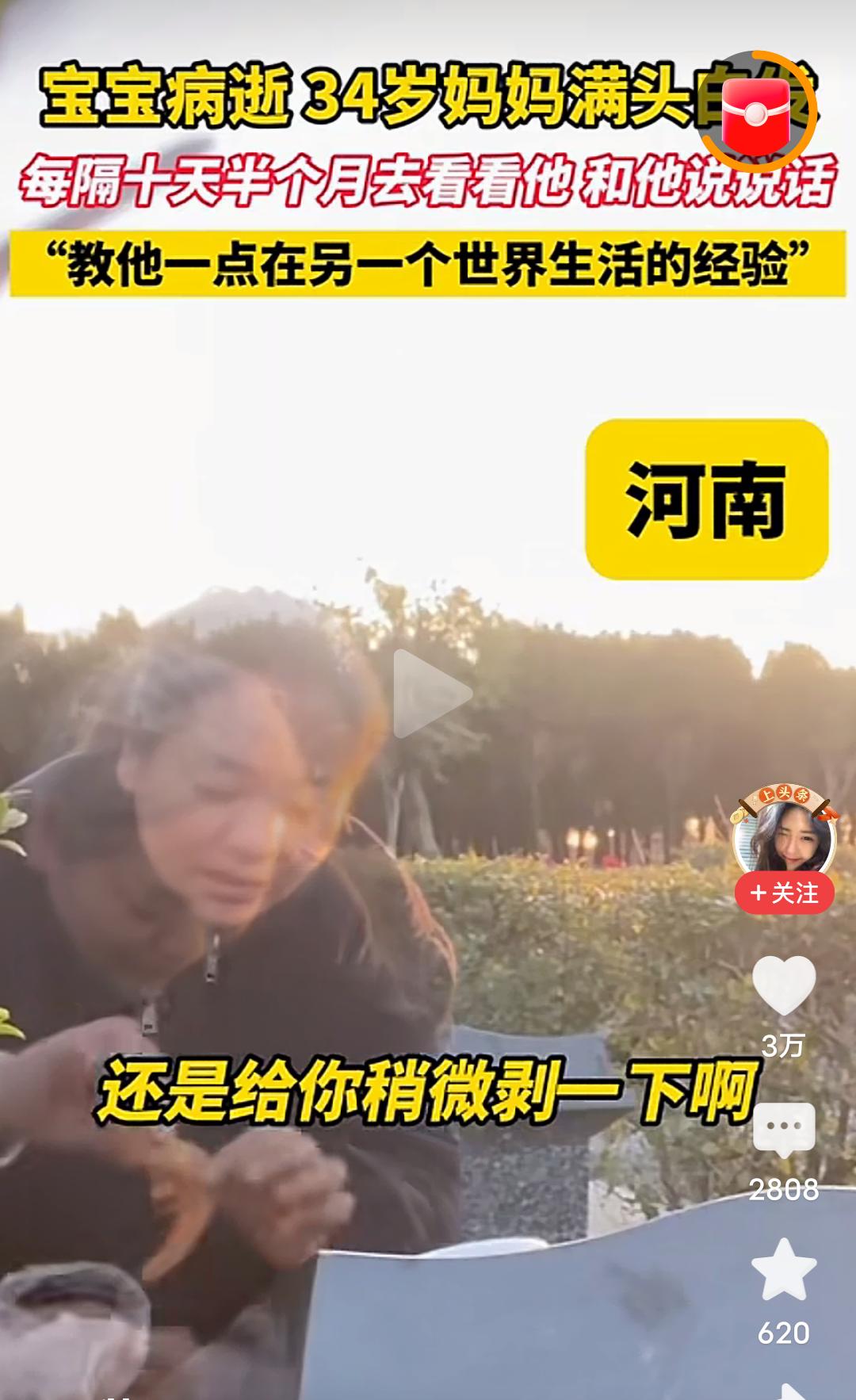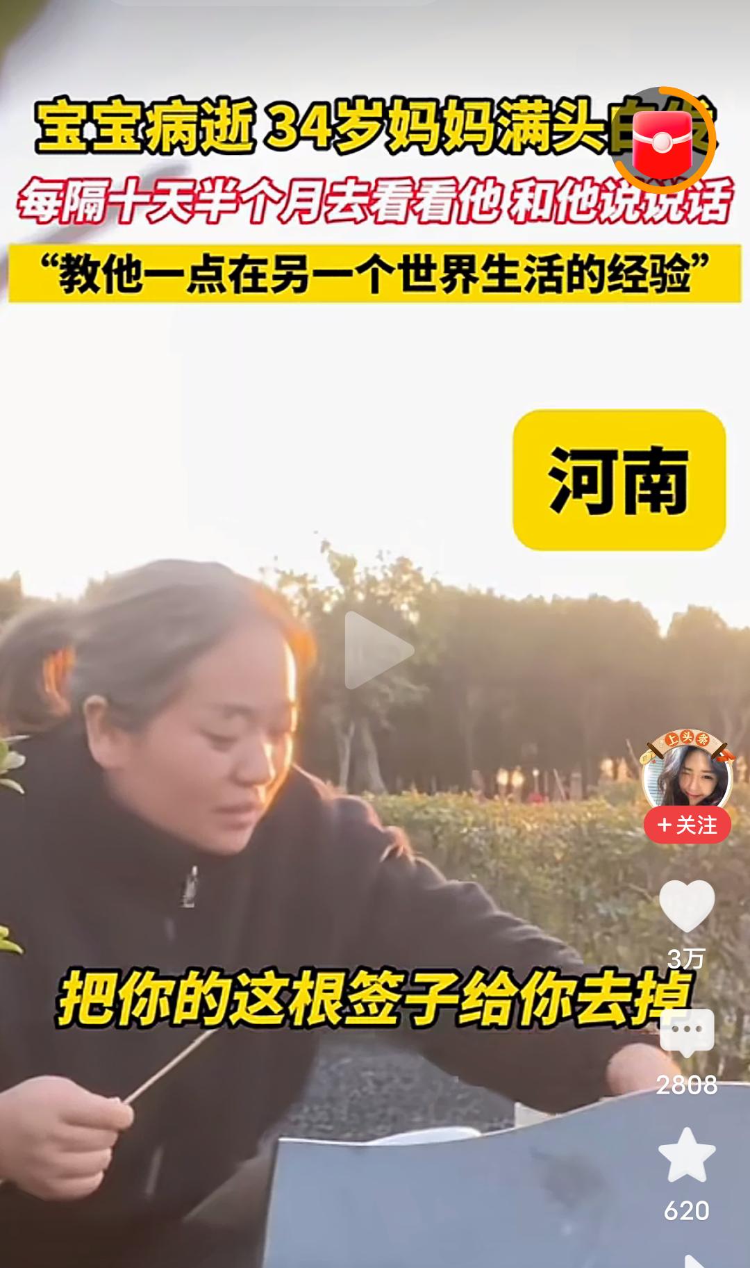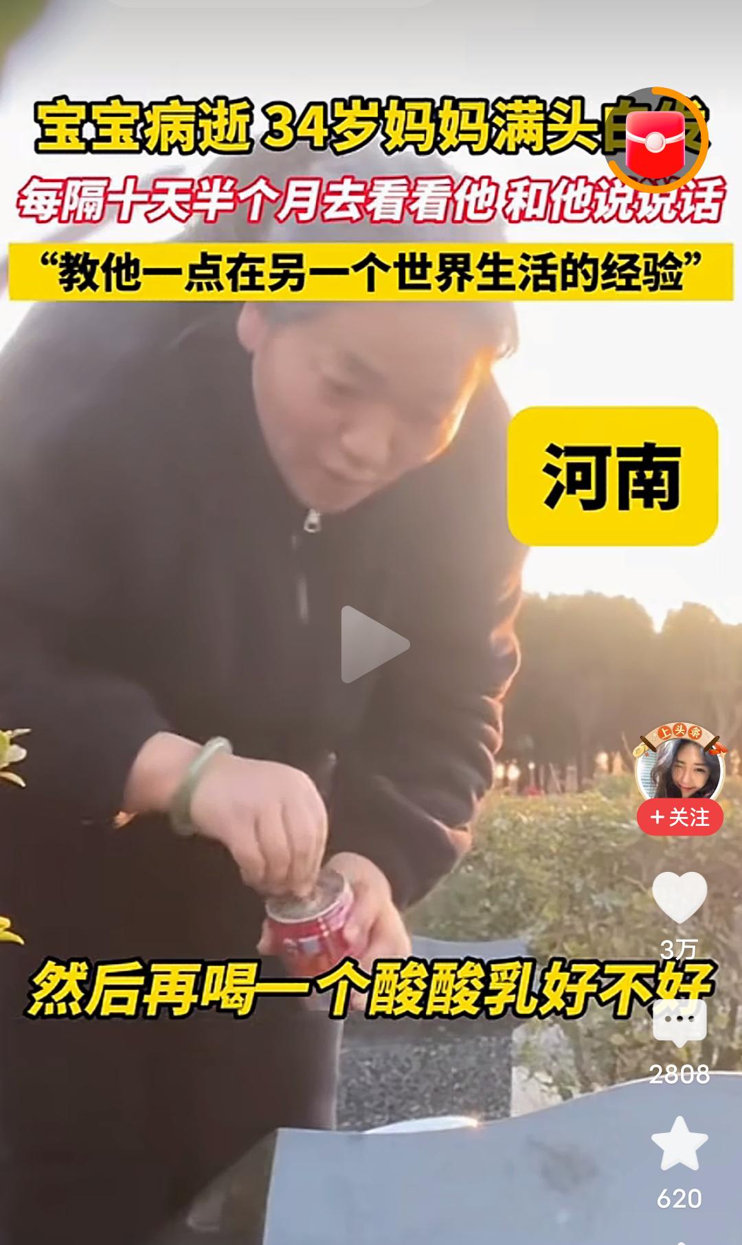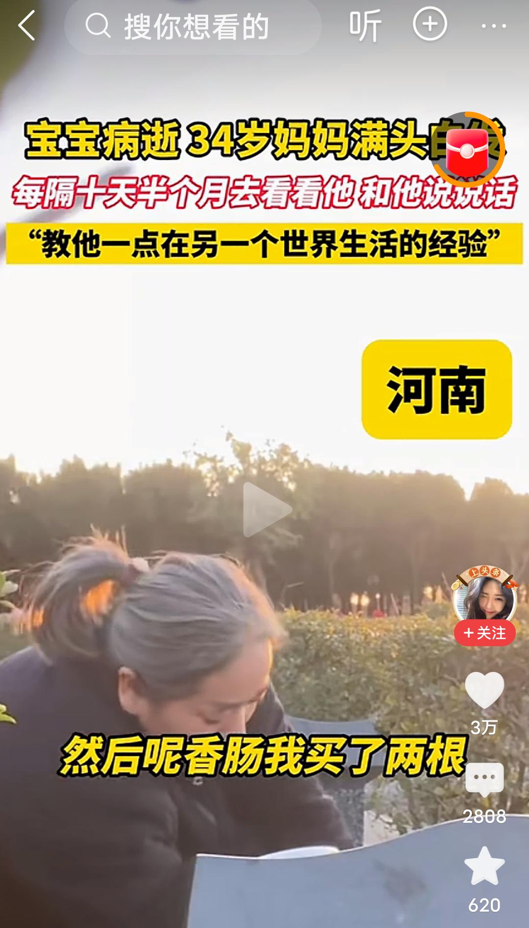心酸!难受!泪目!发生在河南的一幕,看哭了很多人! 宝宝因病去世,才34岁的妈妈一夜白了头,从此每隔十天半个月就去墓地看看他,和他说说话,教他一点在另一个世界生活的经验,从视频里看到,这位满头白发才34岁的妈妈,给宝宝带了大虾,并帮宝宝剥去虾皮,还带了宝宝爱吃的鸡腿,香肠,并细心的帮宝宝把香肠上的竹签拔掉,又给宝宝打开了酸酸乳…… 我真的看不下去了,也许是年龄大的缘故吧,眼泪不由自主的就流了下来…… 孩子就是妈妈的命,就是妈妈的软肋,就是妈妈的脊梁,孩子没有了,妈妈的魂也丢了。 怎么才能让这个妈妈走出丧子之痛呢?心里的伤口从未愈合,这样过下去实在太疼了。 走不出来,根本走不出来,这就是妈妈对孩子的痛彻心扉的痛和至死不渝的爱!最纯净的,最真实的爱! 母子连心的心痛有多少人能懂,母爱的伟大是装不出来的,在天堂的儿子一定能感受到世间的母爱。 孩子,母亲的爱你感受到了吗?若你有灵,请让母亲放下,不要活在回忆与悲伤里,请让她走出来,来过完她本该拥有的阳光与繁华! 再生一个吧,虽然一个孩子是无法代替另一个孩子的,但是还是想劝这个妈妈再生一个孩子,这样至少人生有了另一个寄托,他不是离开了,只是住进了你心里的最深处,就像他以前在你肚子里孕育着,就当做他住进你心里,重回你身体里了。 一生的爱需要用一生的痛来承担,伟大的母爱。 虽然话语苍白无力,但还是想说,希望这位妈妈能早日走出来!