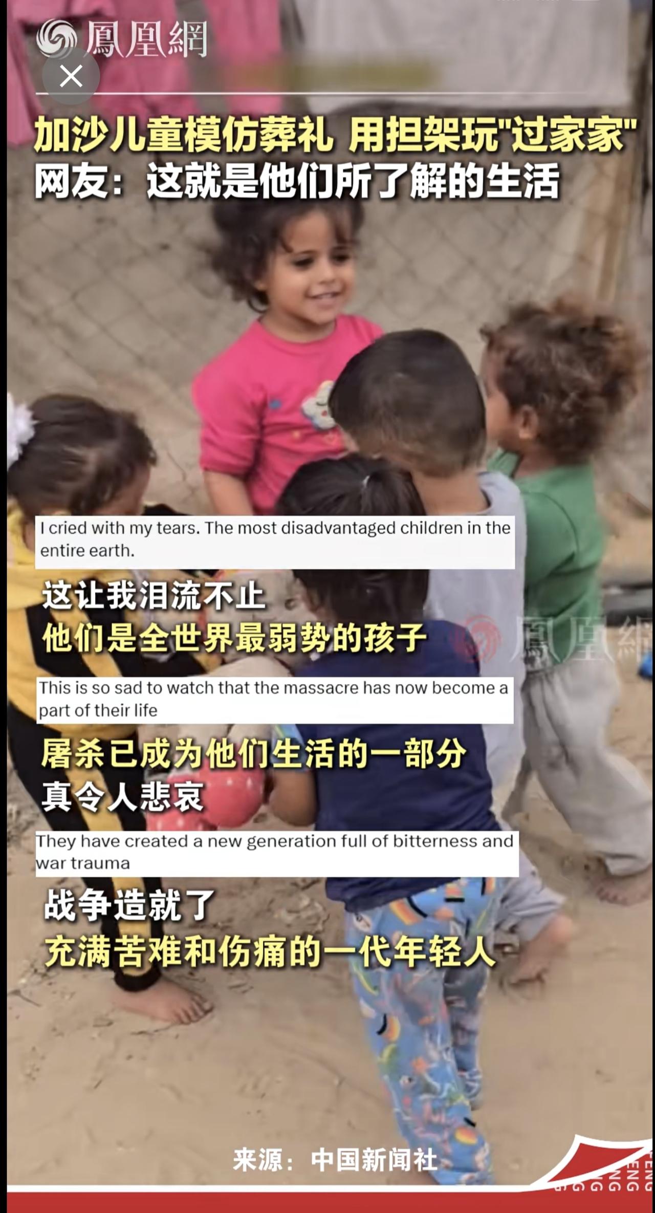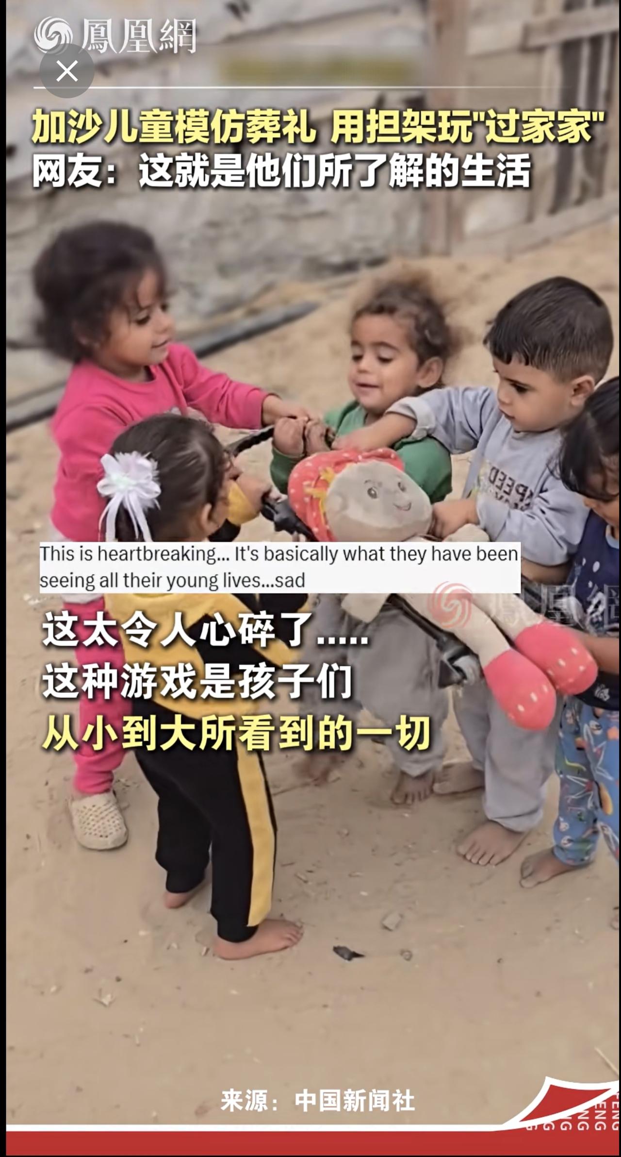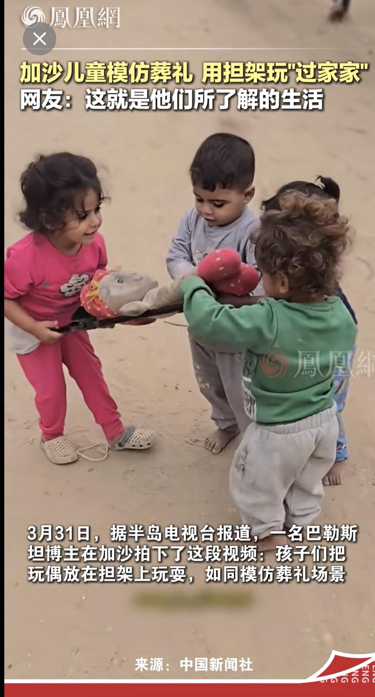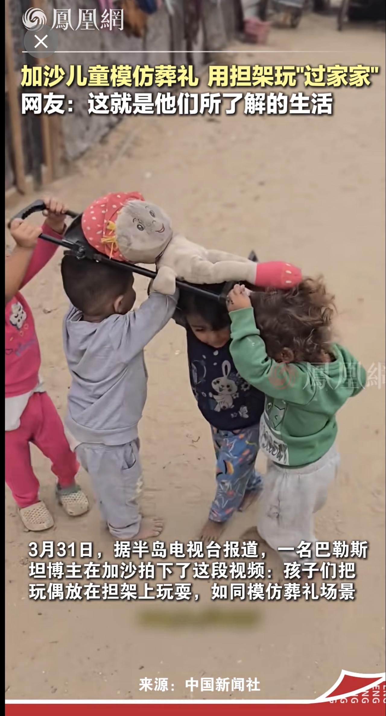 巴勒斯坦博主记录心碎一幕:加沙小孩做游戏,一个“担架”一个旧布偶...网友:战争造就了充满伤痛的一代 国际 儿童