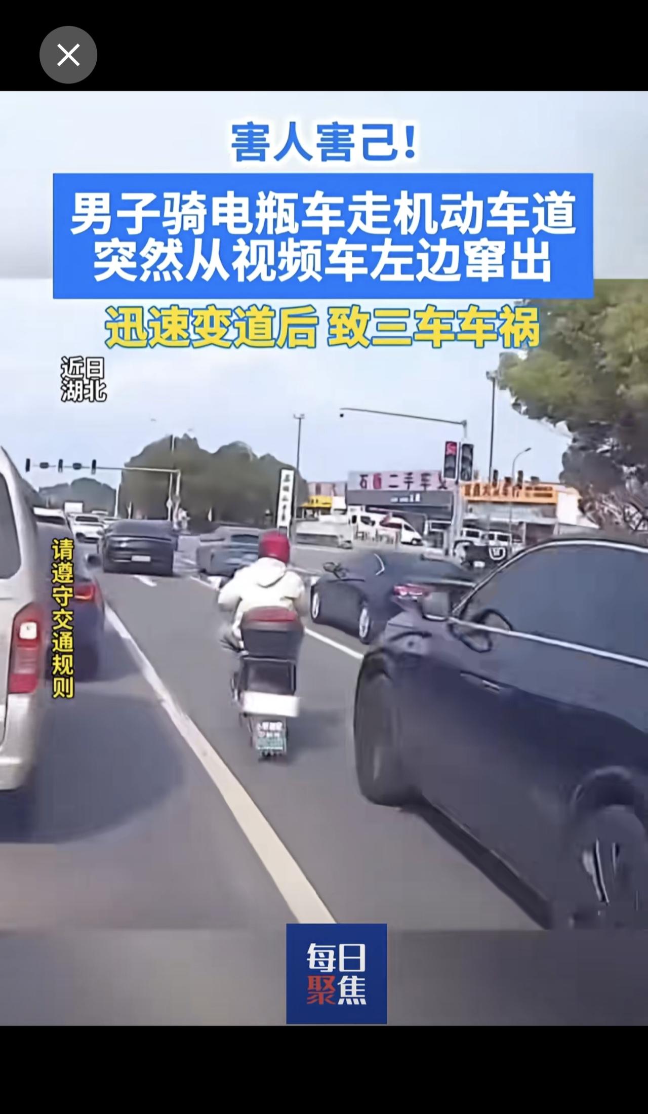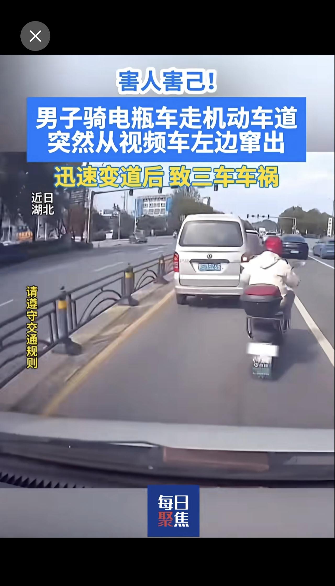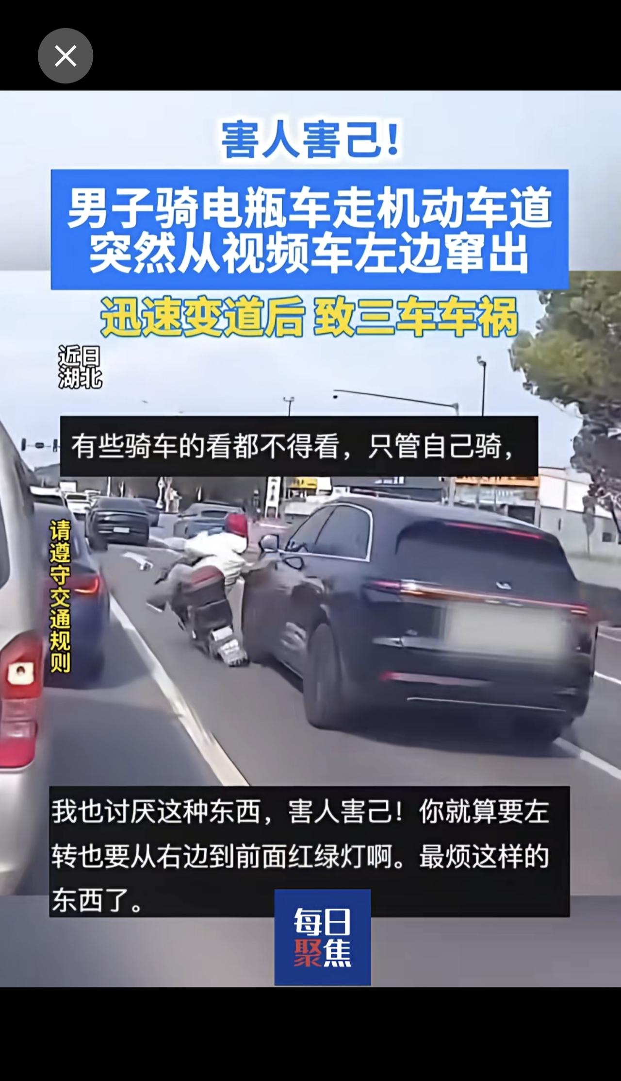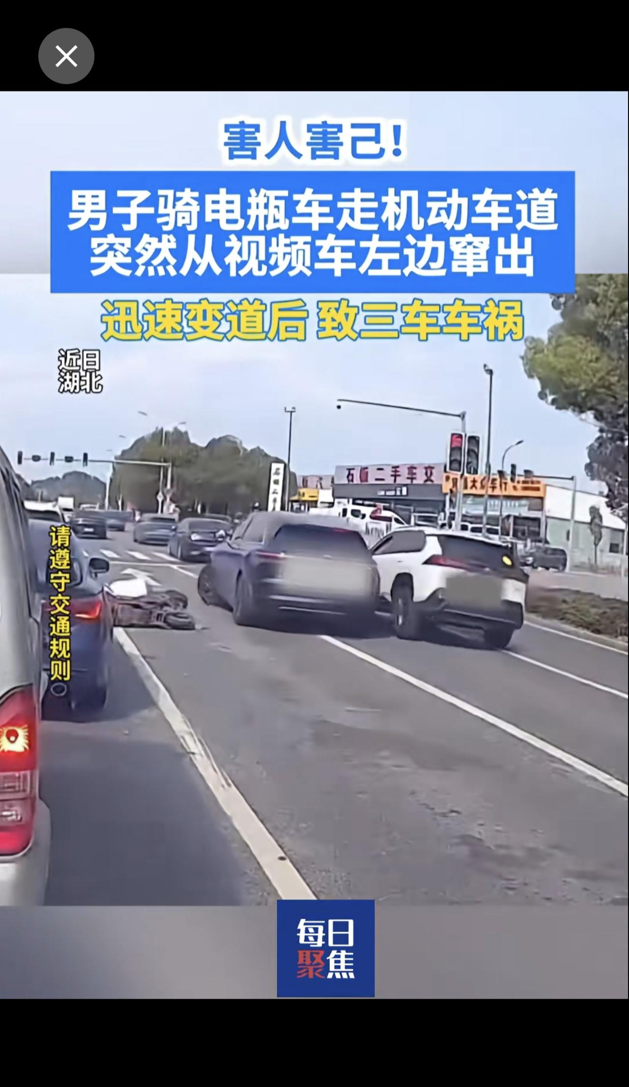 近日,湖北,男子骑电瓶车走机动车道,突然从视频车左边窜出,迅速变道后致三车车祸