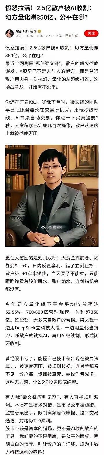 “抓住梁文锋,赔我血汗钱!” 2.5亿散户被AI收割,幻方量化赚350亿,为什么这么多人骂他?抖音一搜一大把讨梁檄文视频! 幻方量化2025年收益均值为52.55%,管理规模超700——800亿元,年净利润达数350亿级。其优势在于将服务器置于交易所机房,利用毫秒级专线和AI算法进行高频交易,同时机构可通过融券实现变相T+0,而散户受T+1限制。梁文锋一边用DeepSeek立科技人设,一边用量化当镰刀,赚散户的钱搞AI,再用AI继续收割散户, 形成闭环收割!普通人玩不过AI,所以,人们骂的不是梁文锋一人,骂的是量化交易,只不过梁文锋是量化的始祖,量化的代表人物,他是量化起家的。有理性网友说:“在我看来炒股就是合法的赌博。 在赌局中,就没见过散户赢庄家的。”有网友说:“抓了一个梁,还有另一个。本质不是技术对错,是市场公平被践踏。”有网友说:“撤单功能应该取消,频繁撤单属于谎骗交易,是证券法严厉打击的,交易所在违反证券法!”更有网友说:“量化是市场的小偷,这么多小偷在是一个极度不正常,当所谓的市场警察睁一只眼闭一只眼的时候,谁还敢带着钱来呢!”量化私募清盘量化科技量化幻方量化大神曦和量化股民达华买方量化亿万支付ai量化策略AI上市潮AI并购潮量化黑幕ai万商汇星广联投分成股民rc亿万倍反还系统