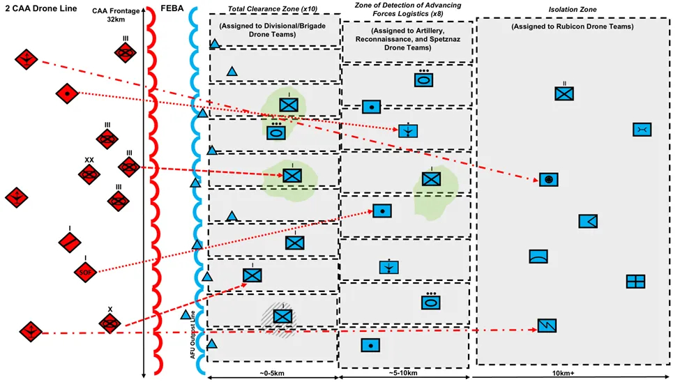 对于敌军前线后方10公里及以外的第三梯队,中部集群修改了第2合成集团军的初始概念,为部队分配了特定扇区。22个“隔离”扇区分配给独立的特种部队旅和"卢比孔河"分遣队。对于第三梯队,中央军队集团分配了3个扇区给“卢比孔-7”分遣队,3个给“卢比孔-中央”分遣队,4个给“卢比孔-第聂伯”分遣队,2个给“卢比孔-8”分遣队,2个给“卢比孔-东方”分遣队。另有4个扇区分配给第3和第24特战旅的“维加”(Vega)火力支援营。后来部署的“卢比孔-DM”(远程布雷)分遣队最初分配了9个区域,用于通过无人航空系统(包括“闪电”型无人机)进行远程布雷。夏末时,中部集群对FPV无人机的每日使用量设置了4000架的上限——包括四轴旋翼型和固定翼型。