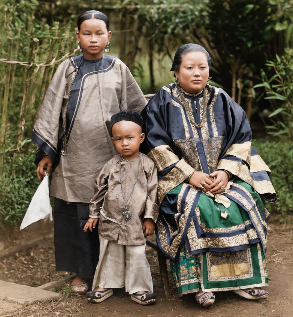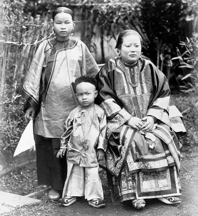 清末,广东一私宅,豪门女眷与少爷的合影 右侧坐主位的年长女性应该是家族主母,她穿着绸缎大襟袄,领口、衣襟、袖口、下摆布满多层镶滚、刺绣、织金装饰,面料华贵、工艺繁复;佩戴金耳环、金项链,彰显豪门身份;坐姿端正、神情肃穆。 左侧站立的年轻女性应该是丫鬟主,只能站立。中间C位的幼童应该是家族嫡子,作为家族继承人,被安排在核心位置。