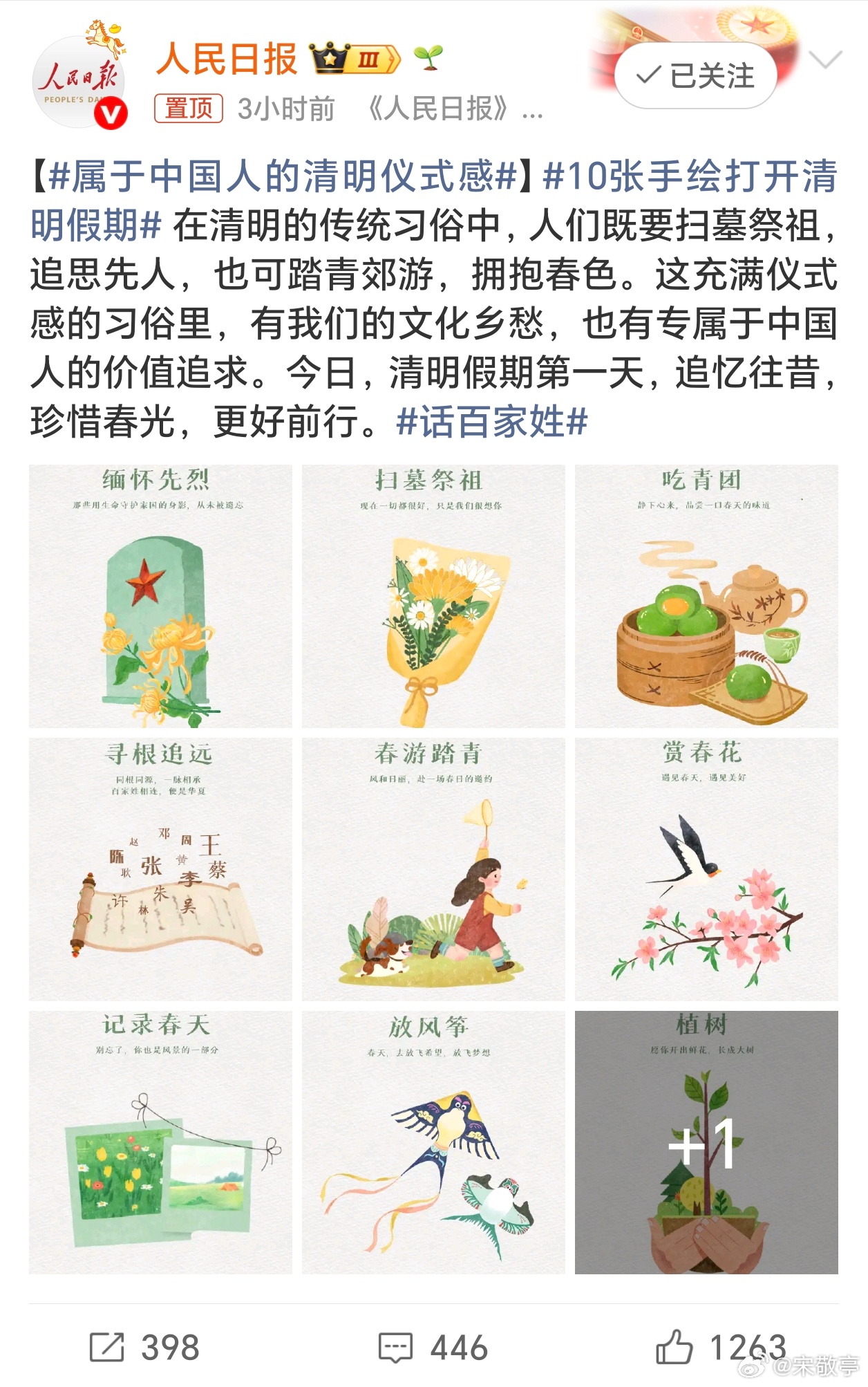 属于中国人的清明仪式感我们这里还是以祭祖为主,天不亮就要出发需为祖坟除草、添新土,擦拭墓碑。祭品以酒、馒头、糕点、水果为主。大家的清明仪式感在哪里,有哪些习俗?