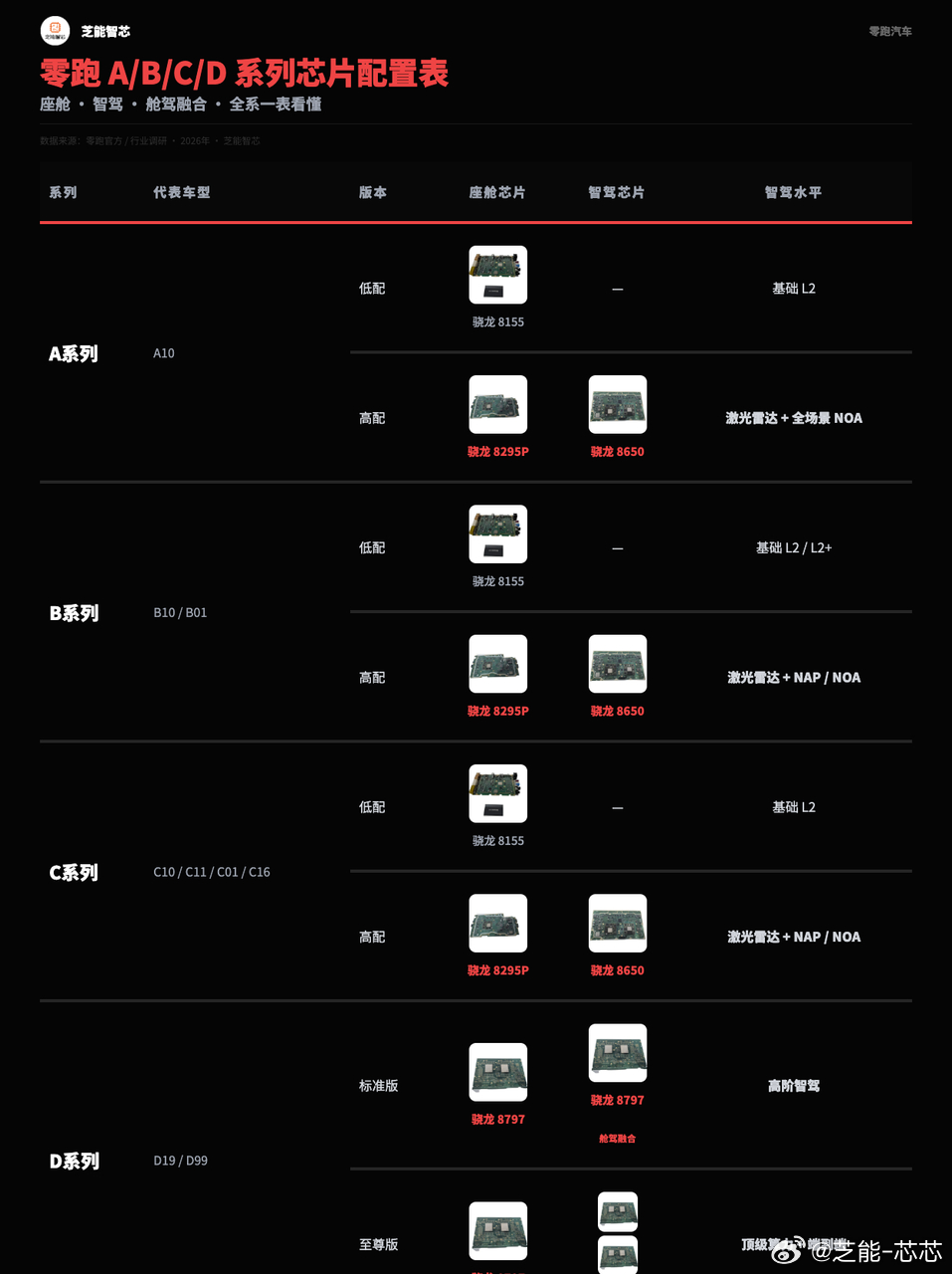 先给结论:零跑的芯片策略很简单——A/B/C分层,D系列统一上融合算力,逐步把“舱驾一体”做成标配。