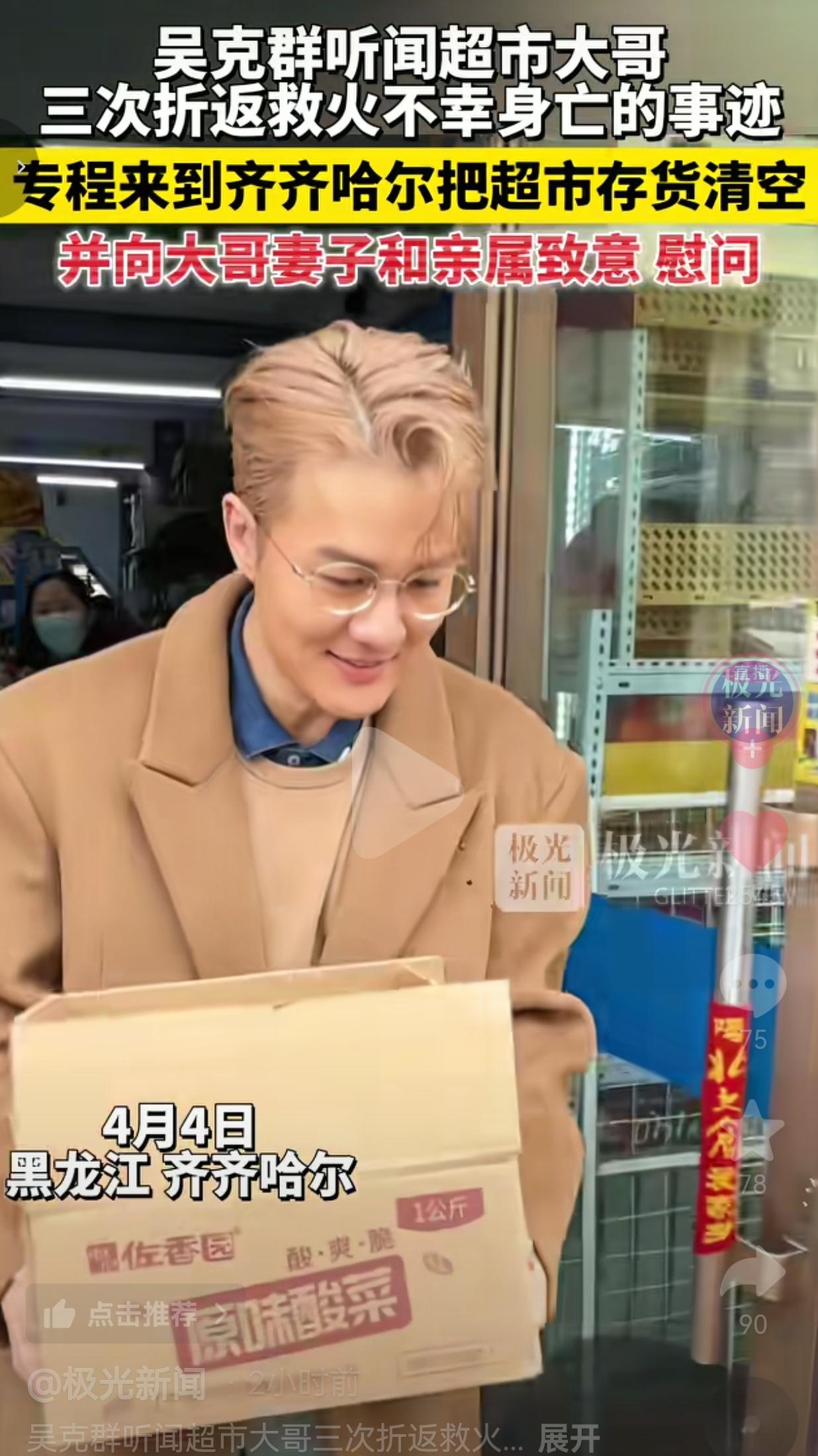 破防了!吴克群专程跑到齐齐哈尔,把救火牺牲的超市大哥的店直接清空,只为给英雄家属一份实打实的温暖。网友:这才是真正的明星该有的样子! 4月4日,黑龙江齐齐哈尔,歌手吴克群的一个举动,直接让全网破防。 事情要从一位超市大哥说起:此前齐齐哈尔一家超市突发火灾,这位大哥为了救人,三次义无反顾地冲进火场,最终不幸壮烈牺牲,只留下了一家超市和悲痛的家人。 吴克群在得知这位英雄的事迹后,二话不说,专程赶到了齐齐哈尔的这家超市。 视频里,他穿着驼色大衣,戴着眼镜,亲自上手搬货,把超市里的存货全部清空,用这种最直接、最实在的方式,给英雄的家人送去了支持。 搬完货后,吴克群还专门向大哥的妻子和亲属致意慰问,全程没有摆一点明星架子,低调又真诚,隔着屏幕都能感受到他的敬意。 要知道,他没有搞任何直播带货,没有拍任何作秀的噱头,就是默默用行动支持英雄家属,这份心意,真的太戳人了! 这事一出来,全网网友都被狠狠感动了,评论区全是泪目: 有的网友说:“这才是真正的明星!用行动致敬英雄,比那些只会上综艺捞钱的强一万倍!” 也有的网友说:“英雄三次折返救火,用命守护大家;吴克群用行动守护英雄家人,双向奔赴太好哭了!” 还有的网友说: “清空超市不是作秀,是给英雄家属最实在的底气!就冲这波,粉一辈子!” 也有的网友说: “英雄不该被遗忘,更不该让英雄家属寒心!为吴克群的善良点赞!” 说实话,我看完这个视频,直接泪目了! 现在多少明星,天天上热搜、炒绯闻、割韭菜,把“明星”两个字当成捞钱的工具,连最基本的正能量都做不到。 可吴克群呢?他没有喊一句空洞的口号,没有拍一条作秀的视频,就是默默跑到齐齐哈尔,用“清空超市”这种最实在的方式,给英雄家属撑腰。 我们总说“英雄不该被遗忘”,可真正做到的人,又有多少?这位超市大哥,三次冲进火场,用自己的命换了别人的生,他是我们所有人的英雄。 而英雄的身后,不能只有冰冷的纪念碑,更要有实实在在的温暖和支持。 吴克群做的这件事,不是什么惊天动地的大事,但它最打动人的,就是这份“说到做到”的真诚。 他用自己的实际行动告诉所有的人:英雄为我们拼命,我们就该为英雄的家人拼命兜底,绝不让英雄流血又流泪! 更难得的是,他全程低调,没有炒作、没有营销,就是默默做事。这种不把公益当秀场的明星,才是真正值得我们追的星! 这件事,从来不是“明星做公益”这么简单,它是整个社会对英雄的致敬,是普通人对善意的共鸣。 我们永远记得,是这些平凡的英雄,用自己的生命守护了我们的平安;我们更要永远做到,用自己的行动,守护英雄的家人,绝不让任何一个英雄,在身后被遗忘、被辜负。 明星的影响力,从来不是用来赚流量、割韭菜的,而是用来传递善意、致敬英雄、温暖社会的。 吴克群用行动给所有公众人物上了一课:真正的顶流,是心里装着别人,用行动温暖世界。 最后,我想说:英雄为我们赴汤蹈火,我们为英雄守护万家!善良从不会被辜负,英雄永远值得被铭记! 对此,你怎么看?