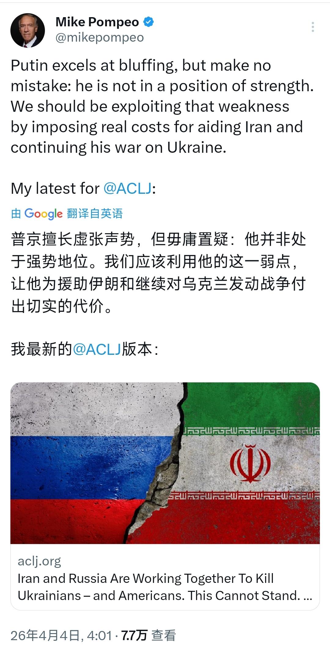 美国前国务卿蓬佩奥今天(北京时间4月4日)发文写道:“普京擅长虚张声势,但毋庸置疑:他并非处于强势地位。我们应该利用他的这一弱点,让他为援助伊朗和继续对乌克兰发动战争付出切实的代价。” [机智]评几句:蓬佩奥还在隔空喊打喊杀,鼓吹抓住所谓普京的“弱点”对俄施压,可这番激进表态不过是其霸权思维的自我感动,早已跟不上特朗普政府的现实算计。特朗普对乌克兰的兴趣本就建立在“美国优先”的利益算计上,如今一边喊着不再直接资助乌克兰、把援乌成本甩锅北约,一边将对乌武器调往中东填补对伊作战缺口,甚至拿停援要挟欧洲站队,其对乌态度的降温肉眼可见。蓬佩奥的嘴炮再响亮,也拗不过特朗普重中东轻乌东、重实利轻盟友的战略选择,乌克兰不过是美国霸权棋局中随时可弃的棋子。