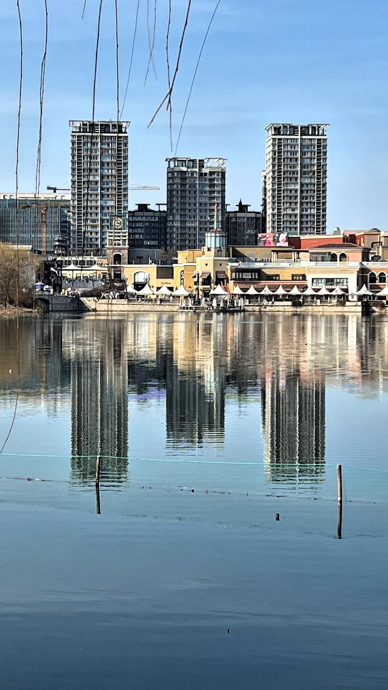 春日赏景:远拍北京朝阳公园湖畔现代建筑群,倒影如画,静谧宜人。