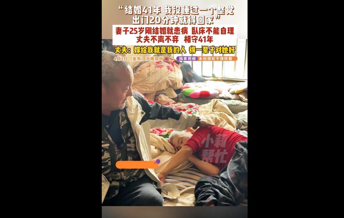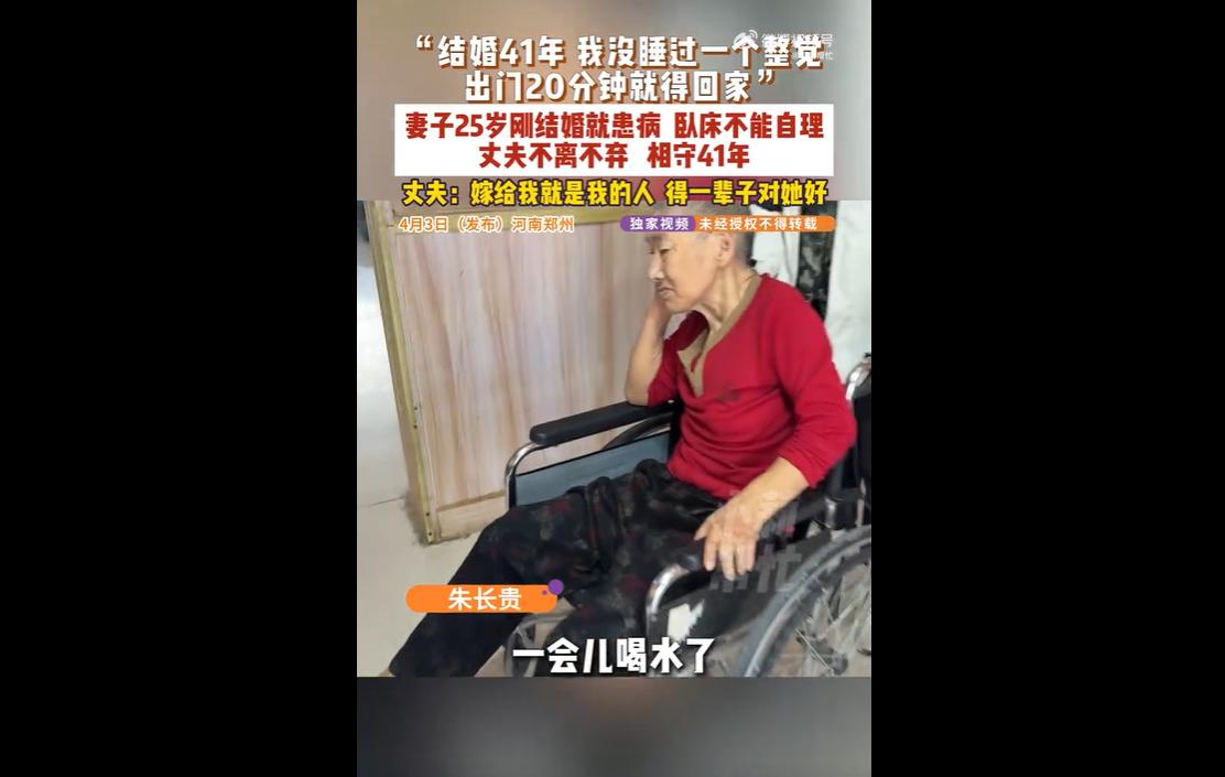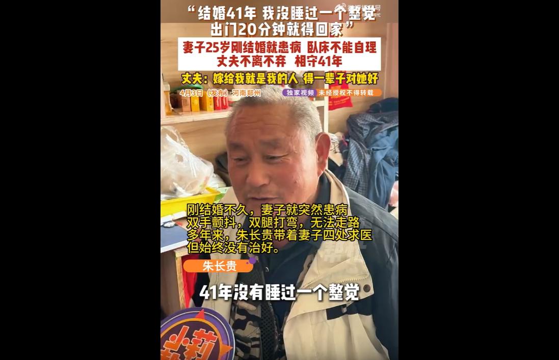 河南郑州朱长贵与患病妻子结婚 41 年,妻子婚后即卧床无法自理,他花费百万求医、日夜照料,拒绝离婚,用一生坚守兑现承诺,感动众人。 妻子 25 岁刚结婚便患上怪病,全身抖动、生活无法自理,人生刚步入新阶段就陷入黑暗。 对朱长贵而言,这本是沉重打击,他本有无数理由选择放手,甚至有人劝他离婚开始新生活,可他始终没有动摇。一句 “嫁给我就是我的人,得一辈子对她好”,朴实无华,却重逾千斤。 41 年里,他没睡过一个完整觉,出门不敢超过 20 分钟,喂水、喂饭、按摩、翻身,件件亲力亲为。为给妻子治病,他前后花费上百万,四处奔波求医,日子清贫却从未抱怨。 在很多人计较得失、权衡利弊的婚姻里,他不计成本、不求回报,只凭一份责任与真心,撑起了妻子的整个世界。 有人说他太傻,为一个病人耗尽一生;可更多人被他深深打动,因为这份不离不弃,正是现代社会最稀缺的真情。 婚姻不只是共享喜乐的结伴,更是共担风雨的承诺。许多夫妻能同甘却不能共苦,遇到疾病、困难便选择逃避,对比之下,朱长贵的坚守更显珍贵。 他用行动告诉我们,爱情与婚姻从不是短暂的激情,而是长久的陪伴与担当。 疾病可以摧毁身体,却摧不垮真心;岁月可以磨平棱角,却磨不灭坚守。 41 年如一日的照料,早已超越了普通夫妻之情,变成刻在骨血里的亲情与责任。