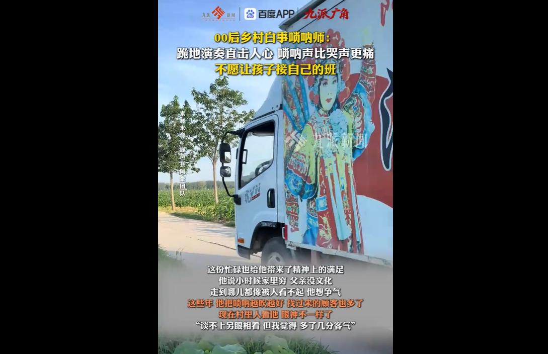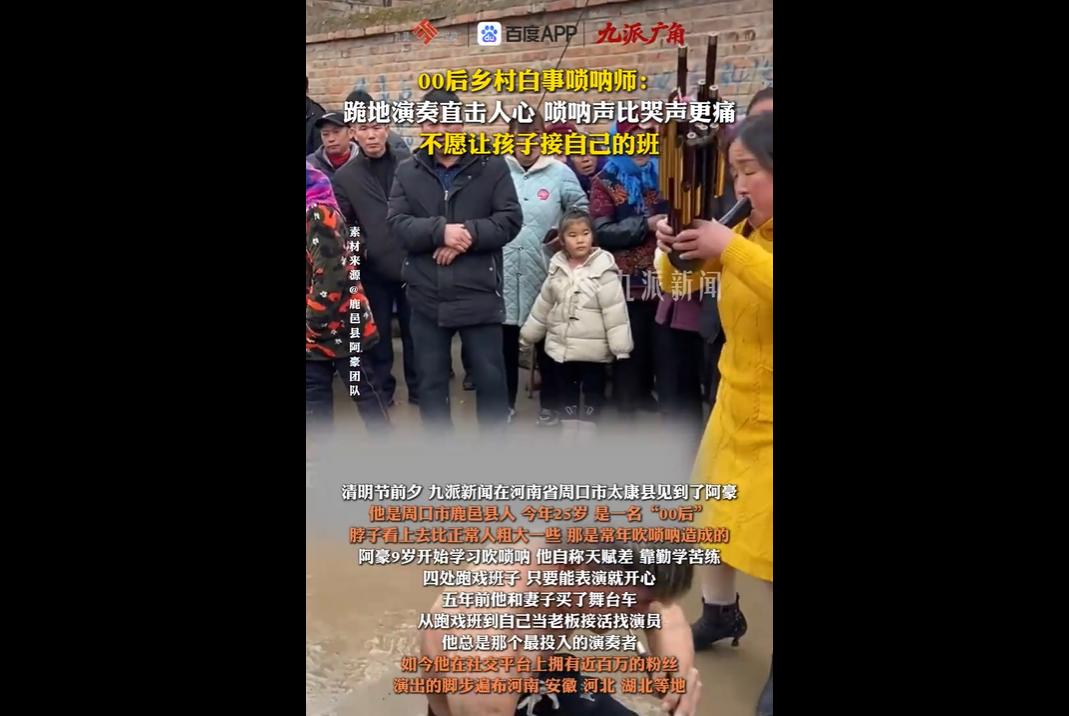 豫东00后唢呐师阿豪,9岁学吹唢呐,常年勤学苦练,五年前和妻子创业组建团队,主要从事白事送灵演奏。 2022年因妻子拍下其跪地吹奏的视频意外出圈,如今拥有近百万粉丝,九成订单来自社交平台。 他坚守本心、尊重各地习俗,以悲切曲调替逝者家属宣泄哀思,在坚守手艺的同时,也留有陪伴家人的遗憾。 阿豪的唢呐之路,满是勤学与坚守。 9岁起步,自认天赋不佳,便以勤补拙,四处跑戏班子积累经验,哪怕只是能有表演的机会,也满心欢喜。 五年前,他和妻子置办舞台车,从跟班演出到自己当老板,每一场白事演奏,他都全情投入,常年吹奏留下的粗脖子,是他坚守手艺最真实的印记。 这份不浮躁、不敷衍的态度,在快节奏的当下,显得格外珍贵。 唢呐于他,早已不只是一门谋生的手艺,更是慰藉人心的媒介。 白事之上,逝者家属的哀思难以言说,千言万语都藏在心底,而阿豪的唢呐声,便成了最好的出口。 他替人哭、替人喊,把那些来不及说的牵挂、放不下的不舍,都融进悲切的曲调里,陪着家属熬过最难的离别时刻。 那位一年内接连送走双亲的阿姨,执意高价请他演奏,只因他的调子“能吹到人心底”,这便是对他手艺最好的认可。 意外出圈的背后,是他不迎合、守本心的坚持。没有精修剪辑,没有刻意炒作,只是妻子随手拍下的现场片段,却因扎实的功底和饱满的情感,让他收获了近百万粉丝,九成订单来自社交平台。 面对外地高价邀约,他婉言拒绝,只因尊重各地习俗,不愿敷衍每一份信任,这份“君子爱财,取之有道”的坚守,更显难得。 然而,这份坚守的背后,也藏着他不为人知的遗憾。 常年奔波演出,一个月在家待不了一周,没能好好陪伴一双儿女,对奶奶的离世没能送最后一程,许诺孩子的承诺也迟迟未能兑现。 他深知这行的辛苦,不愿孩子重走自己的路,便拼命忙碌,想为孩子多挣一份保障,这份为人父、为人孙的愧疚与担当,更让人心生共情。 阿豪的故事,是传统手艺传承的缩影,也是普通人努力生活的写照。 他以唢呐为翼,在烟火人间里坚守热爱,用手艺慰藉人心,在谋生与坚守中,平衡着责任与遗憾。他不追求惊天动地,只愿用自己的坚守,让唢呐这门古老的手艺,继续传递温暖与力量,也让每一份离别,都能有一场深情的告别。 愿他在坚守热爱的同时,能多些时间陪伴家人,弥补遗憾,在传承手艺的路上,越走越远。