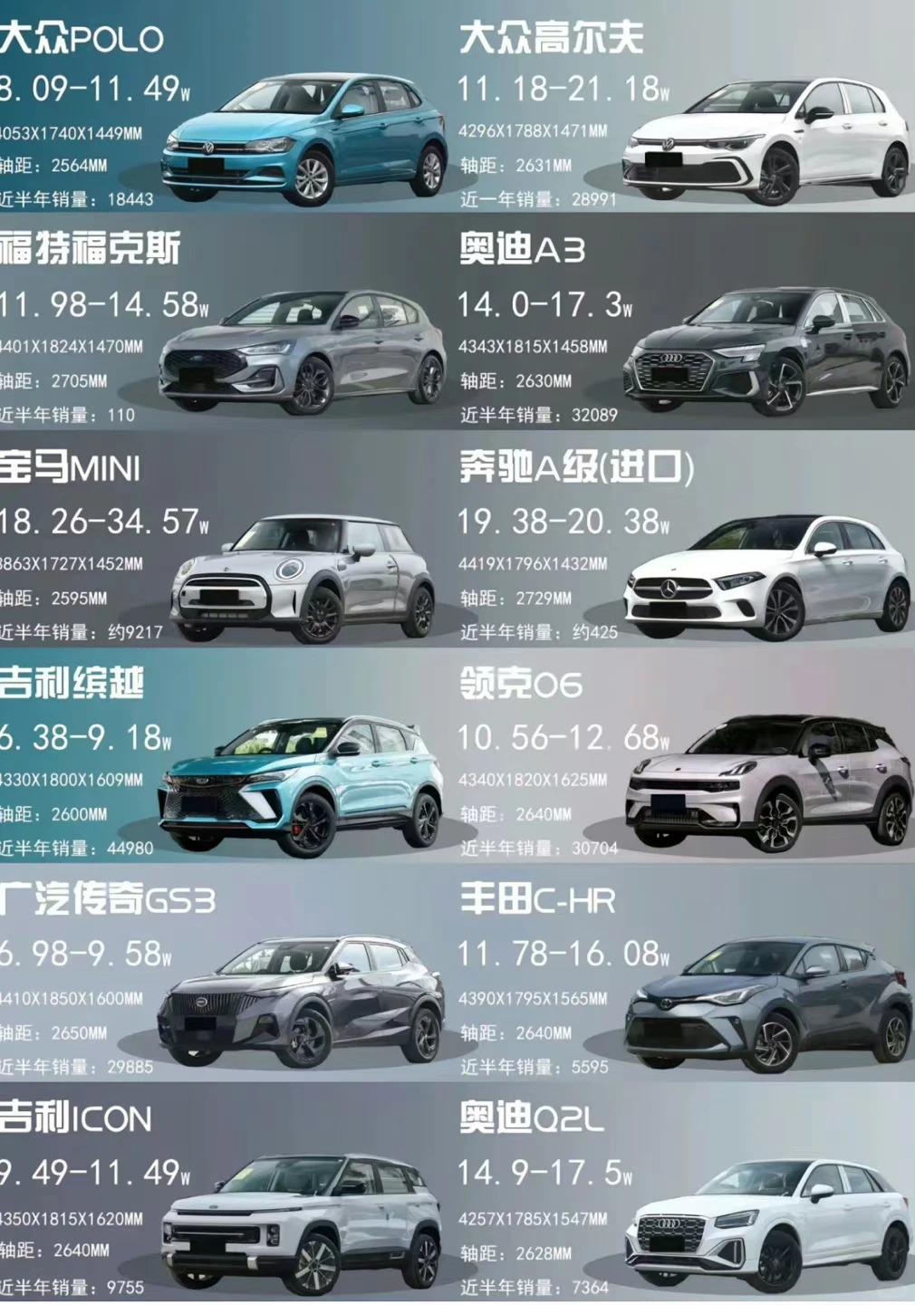 12 款热门小车横评✨ 谁才是年轻人的第一台车? 家人们!今天直接把 12 款热门小车拉出来遛遛,从合资到国产、从燃油到入门豪华,一次性给你讲明白! 先看合资燃油党:大众 POLO 和高尔夫是经典两厢,POLO8 万出头就能拿下,适合城市代步;高尔夫 11 万起,操控和空间更均衡,是德系粉的情怀之选。福特福克斯现在销量有点拉胯,但操控底子还在;丰田 C-HR 颜值在线,就是后排空间有点紧凑,适合单身 / 小情侣。 豪华入门款:奥迪 A3、Q2L,还有宝马 MINI、奔驰 A 级,预算 14 万 + 就能冲豪华标!MINI 颜值直接拉满,女生看了走不动道;A3/Q2L 适合想入豪华门的打工人,面子里子都有。 国产性价比王:吉利缤越、ICON,领克 06,传祺 GS3,直接把价格打下来!缤越 6 万多起,近半年销量近 5 万,是真・国民小车;领克 06 颜值配置双在线,10 万出头就能拿下,年轻人闭眼冲不亏! 总结一下:预算 8 万内选 POLO / 缤越 / GS3;10-15 万冲高尔夫 / 领克 06 / 奥迪 Q2L;15 万 + 直接上 A3/MINI,颜值豪华一步到位~【来自懂车帝车友圈】