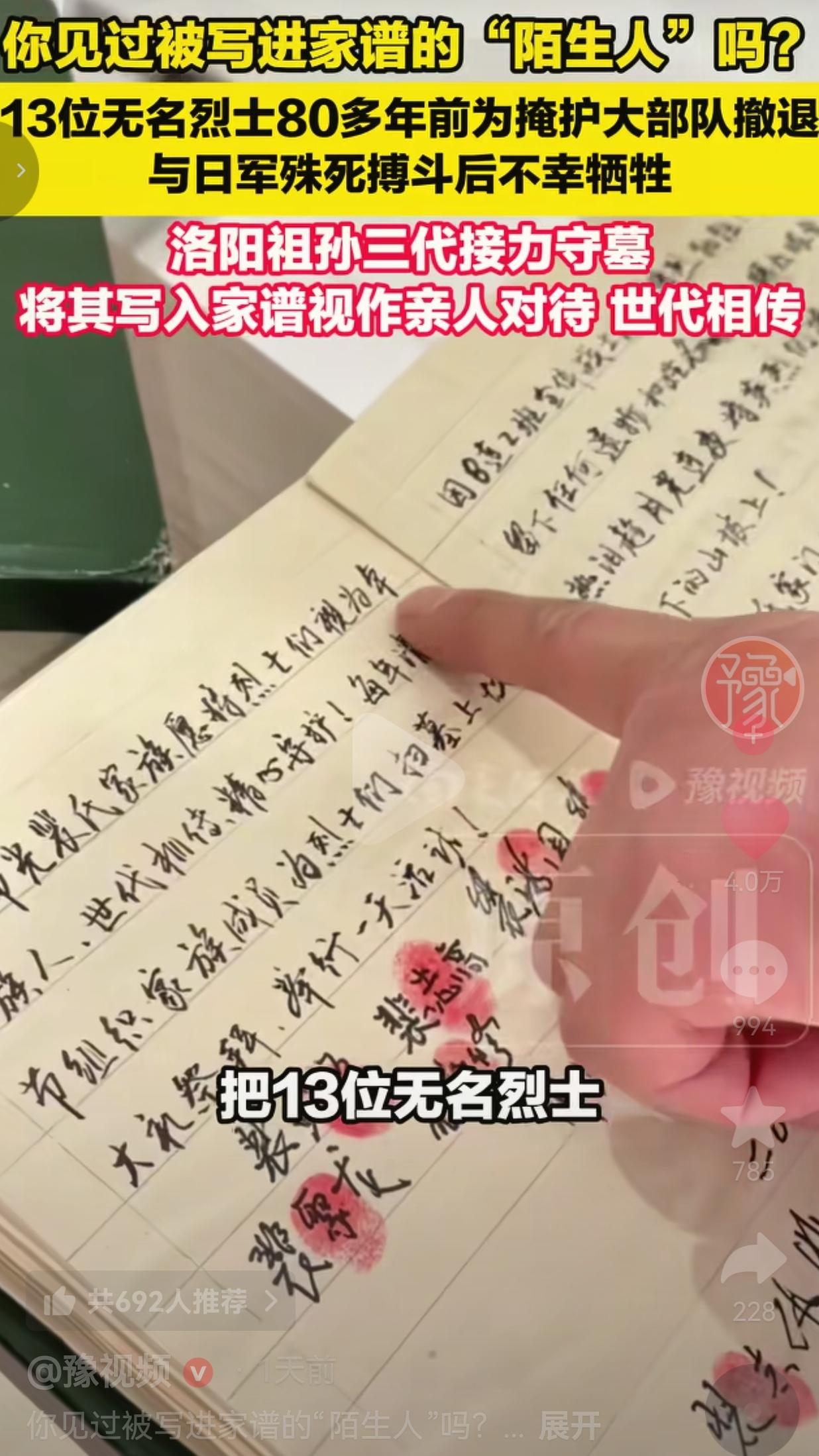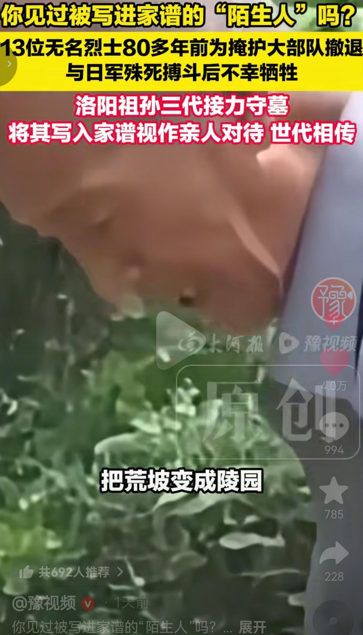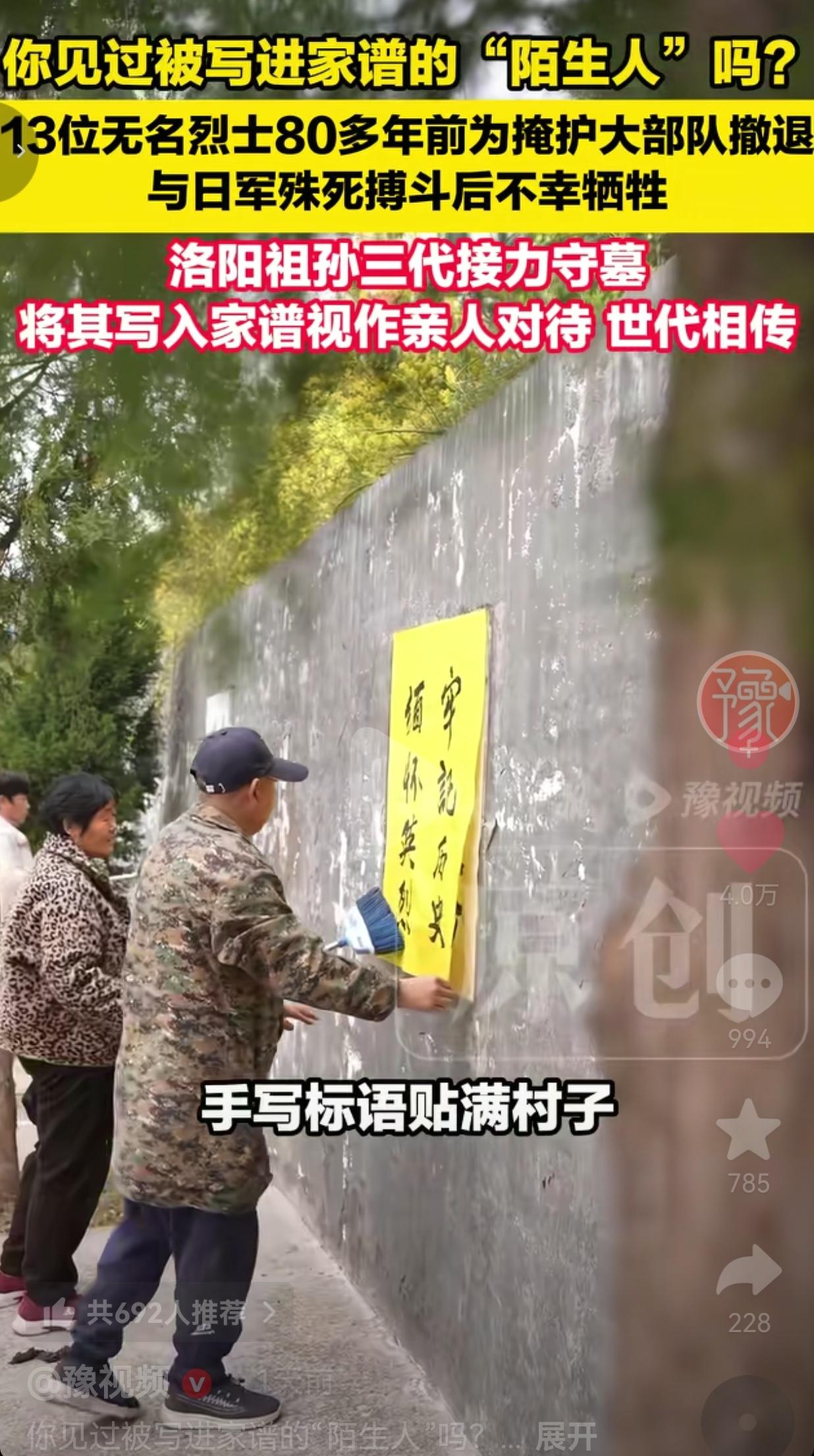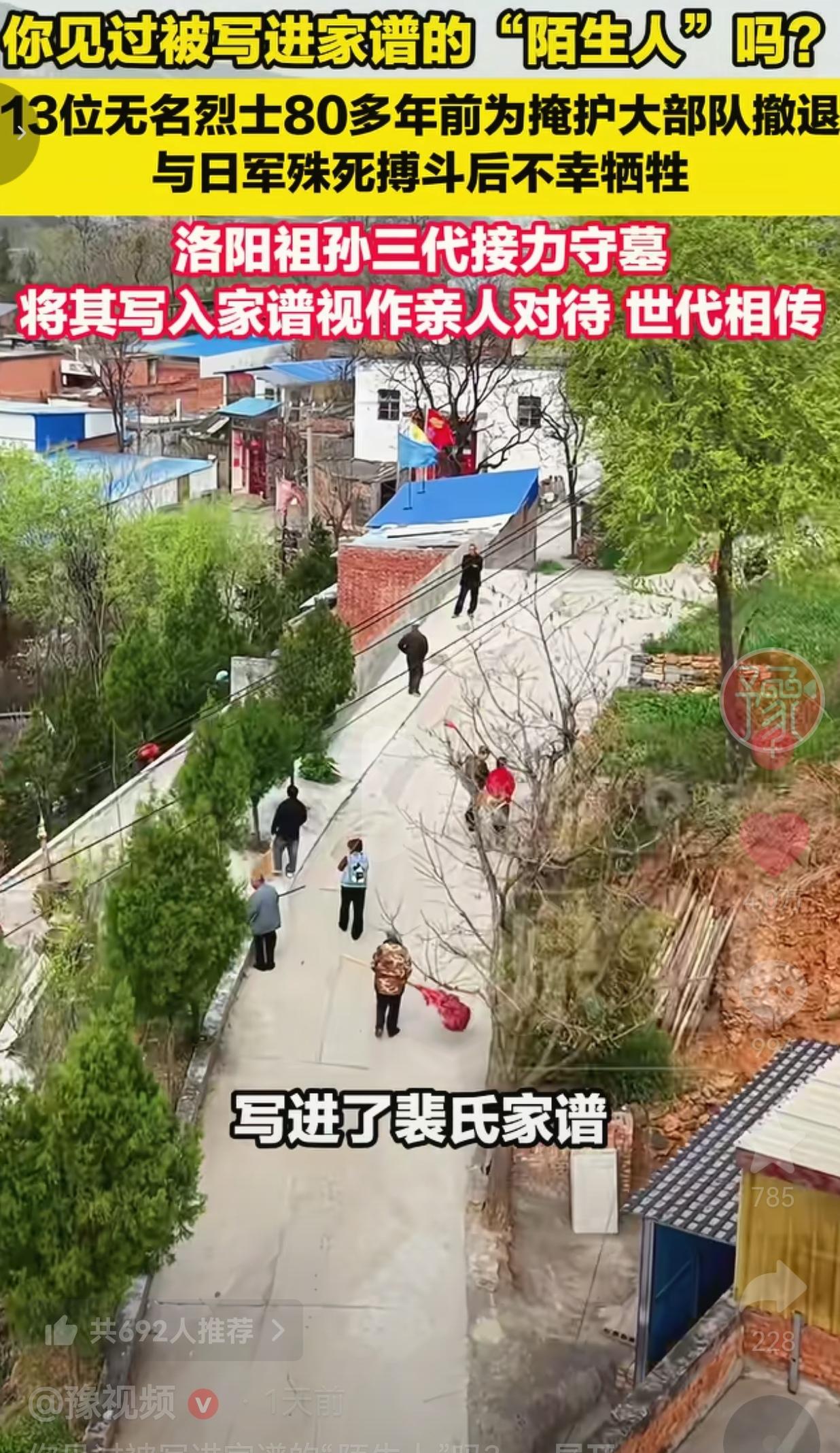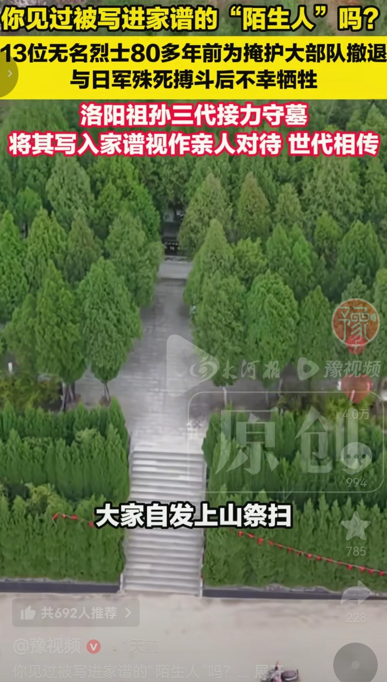 破防到泪崩!你见过被写进家谱的“陌生人”吗?河南洛阳一家三代人,用整整80年的坚守,给13位无名烈士守墓,还把烈士们写进自家家谱,当成亲人世代供奉! 80多年前,抗日战争最惨烈的岁月里,13位年轻的八路军战士,为了掩护大部队安全撤退,毅然选择留下来,和日军展开了殊死搏斗。 战斗结束后,13位勇士全部壮烈牺牲,没有留下姓名,没有留下籍贯,甚至连一张照片都没有,就那样静静地长眠在了洛阳偃师佛光村的山坡上。 当时21岁的村民裴麦闹,亲眼目睹了战士们的牺牲,亲手安葬了这些英雄。 从那天起,他就给自己立下了一个誓言:这辈子,一定要守好这些烈士的墓,绝不让英雄们孤单。 这一守,就是一辈子。裴麦闹一个人修墓、种树、除草、祭奠,把原本荒草丛生的山坡,一点点修成了整齐的烈士陵园。他逢年过节就去扫墓,给烈士们摆上祭品,就像对待自己的亲人一样。 临终前,裴麦闹把全家人叫到身边,千叮咛万嘱咐,要求子孙后代必须接力守墓,世世代代守护这些无名英雄。 更让人泪目的是,裴家直接把13位烈士郑重写进裴氏家谱,明确规定:将烈士们视为本家族人,世代相传,用心守护! 就这样,裴麦闹走了,儿子接着守;儿子老了,接力棒传到了孙子裴伟超手中。祖孙三代,整整80年,风雨无阻,从未间断。 后来,这份守护,也慢慢从一家之事,变成了全村之心。后来村民们自发加入,每到清明就扛着扫帚、提着水桶上山祭扫,墙上贴满“牢记历史、缅怀英烈”的标语。 孩子们也在烈士墓前举行入队仪式,听着英雄故事长大,把感恩刻进骨子里。 如今,裴家后人依旧年年组织扫墓祭拜,村里的年轻人也纷纷表态,会把这份承诺一直传下去,绝不让英雄被遗忘。 这事一出来,全网网友瞬间破防了,评论区全是泪目的话语: 有的网友说: “这才是中国人刻在骨子里的感恩!英雄从未远去,我们永远铭记!” 也有的网友说:“家谱是一个家族最神圣的东西,把无名烈士写进去,这是最高的敬意!破防了!” 还有的网友说:“三代人守墓80年,全村人接力守护,这不是义务,是刻在骨子里的信仰!向裴家、向佛光村致敬!” 也有的网友说:“13位无名英雄用命护我们周全,裴家用一生还他们安宁,全村人用传承让他们永生,双向奔赴太好哭了!” 我们总说“英雄不该被遗忘”,可真正用一辈子、用三代人、用一整个村子去践行这句话的,才最值得我们用真心去尊敬。 裴家祖孙三代,虽然没有惊天动地的壮举,也没有豪言壮语,就用最朴素的行动,守了英雄80年,把荒坡变成陵园,把陌生人当成家人。 家谱是什么?是一个家族的根,是血脉传承,是只有至亲至爱才能入册的神圣存在。裴家把13位素不相识的无名烈士,堂堂正正写进家谱,当成亲人对待,这是何等胸怀,何等敬意! 13位战士,当年都是和我们一样的年轻人,他们本可以回家、娶妻生子,可他们为了国家、为了我们,选择牺牲,连名字都没留下。 而裴家,用80年坚守给了英雄一个家;佛光村的村民,用代代相传,给了英雄永恒的纪念。 现在很多人天天追明星、刷流量、为琐事争吵,可真正该被我们刻在心里的,是这些用命换和平的英雄,是这些用一生守大义的普通人! 裴家做的不是什么大事,但最打动人的,就是这份说到做到、世代相传的真诚。他们用行动告诉我们:英雄为我们赴死,我们就该用一生守护英魂,绝不让英雄流血又流泪! 而全村人的接力,更是让我们明白:这份感恩,从来不是一个人的事,是整个民族刻在骨子里的信仰! 这件事,从来不是“一家三代守墓”这么简单,它是中华民族精神最真实的见证,是中国人刻在骨子里的感恩与担当。 我们今天的和平,不是天上掉下来的,是无数像这13位无名烈士一样的英雄,用生命换来的。 我们对英雄的铭记,也从来不是一句口号,而是像裴家这样,一代又一代坚守,一村又一村传承,用行动兑现承诺。 英雄无名,但精神永存;守护无声,但信仰永恒。 正是因为有这样的英雄,有这样守护英雄的普通人,我们的民族才能生生不息,我们的国家才能繁荣富强。 我们永远不会忘记,是谁为我们挡住黑暗;我们永远会用行动,守护英雄荣光,让英雄故事代代相传,永不磨灭。 最后,我想说的是:英雄无名,山河为证;守护无声,世代相传!这,就是中国人的信仰!