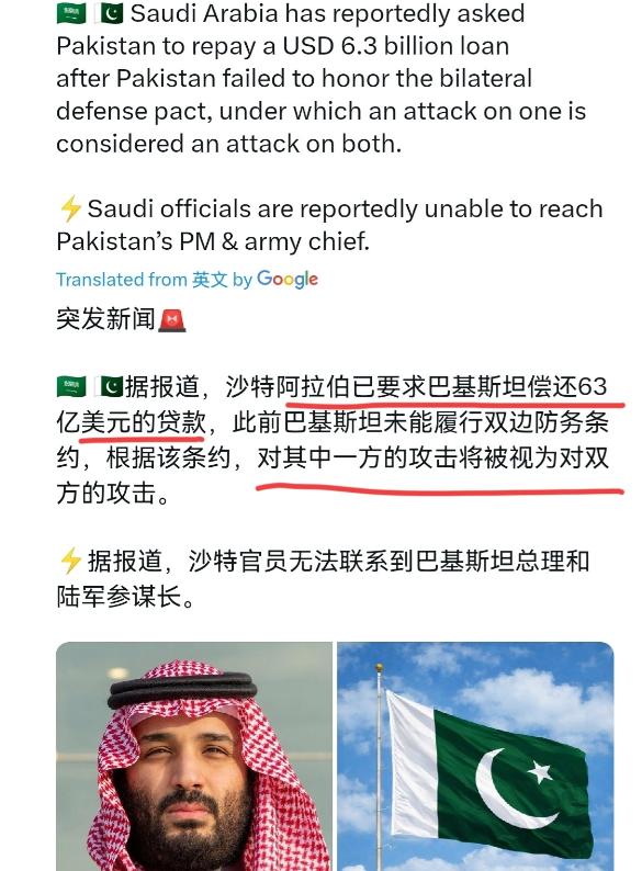 没想到巴基斯坦与沙特的关系会闹到这一步!沙特对巴基斯坦进行上门逼债!4月3日,根据外媒报道,外媒称,沙特阿拉伯要求巴基斯坦偿还63亿美元的贷款。因为巴基斯坦未能履行双边防务协议,根据该协议,对一个国家的攻击被视为对两个国家的攻击。 说白了,沙特上门逼巴基斯坦还63亿,看似是讨债,实则是“金钱换安全”的同盟彻底破裂,太现实。 要知道,4月3日外媒消息,沙特正式要求巴基斯坦立即偿还63亿美元贷款,理由就是巴方没履行共同防务协议。当初白纸黑字约定,攻击一国等同攻击两国,如今沙特遭袭,巴基斯坦却按兵不动,活像拿了钱不办事,太不地道。 可这绝非单纯债务纠纷,而是利益同盟的彻底撕破脸。2025年9月两国签战略防御协议,本质就是交易:沙特出钱给贷款、搞投资,巴基斯坦出军队、提供安全保护伞。美伊冲突升级、伊朗打击沙特后,这份协议成了试金石,巴基斯坦只口头表态,没派兵、没启动联防,等于安全承诺作废。 其实,巴基斯坦也有难言之隐。主力全盯着印度,根本抽不出兵力支援中东。伊朗又是周边大国,真出兵帮沙特对抗伊朗,等于引火烧身,陷入多线作战。经济本就濒临崩溃,再卷入中东战火,国家直接崩盘,权衡利弊只能违约。 说实话,当初沙特给巴基斯坦63亿,就是买军事保障。如今自身遭袭、美军靠不住,指望巴基斯坦顶上去,结果被放鸽子。要钱是假,逼巴基斯坦表态是真,要么履约出兵,要么还钱解约,不想再养“不看门的保镖”。 更关键的是,这暴露所有“金钱同盟”的脆弱。没有共同安全威胁、只有利益交换的联盟,一遇危机就散伙。巴基斯坦顾自身安危,沙特求经济回报,双方都以本国利益为先,所谓“兄弟情谊”在生存面前一文不值。 要清楚,历史上这类同盟总以翻脸收场。当年伊拉克与科威特“金钱换安全”,最后因债务纠纷爆发海湾战争;如今沙特与巴基斯坦,同样因“安全换金钱”违约反目,历史逻辑太相似。 而未来,关系基本没挽回余地。巴基斯坦要么砸锅卖铁还钱,经济直接崩溃;要么硬扛到底,彻底得罪沙特,失去中东最大金主。沙特大概率会冻结所有援助、撤走投资,甚至联合其他海湾国家孤立巴基斯坦。长期看,这会彻底改变南亚与中东格局,巴基斯坦失去重要靠山,沙特安全更没保障,两败俱伤,代价太沉重。 说到底,沙特逼债就是战略同盟的死亡判决书。这场“金钱换安全”的交易,从一开始就埋着分裂种子。危机一来,各自保命、互相抛弃,没有谁对谁错,只有国家利益至上。这不是简单讨债,而是国际政治最冰冷的真相:没有永远的朋友,只有永远的利益。 以上是小编个人看法,如果您也认同,麻烦点赞支持!有更好的见解也欢迎在评论区留言,方便大家一同探讨。
