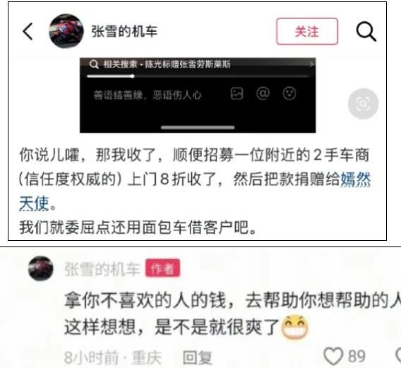 豪车估计越来越难卖了, 张雪,把标哥送的1300万劳斯莱斯卖了, 张雪峰,每天都雷打不动开小电驴上班。 张雪人狠话不多,没想到在用车方面也是讲究一个实在,面对陈光标送的“中国唯一、价值1300万”的26款劳斯莱斯幻影,张雪转手八折就卖了,直接把一千万的折价捐给嫣然基金。 张雪峰用车也讲究一个方便,他曾无数次提及到,除了极端天气外,他每天就骑着小电驴送女儿上学,骑着小电驴上下班,只因省时间、不塞车。曾经有一次,有朋友约上他去一个五星级酒店吃饭,他还是开着小电驴去,以至于保安都不让他进去。 张雪、张雪峰两个人告诉我们一个道理,以前的老板即使贷款也要买一辆豪车充门面,但现在不一样了,企业信用更看重的是老板个人的魄力与实力,尤其是现在信息差被抹平了,很多人都知道豪车可以是摆拍,可以是长租,也可以是二手便宜货。 现在的老板越来越在意的是,与其花大钱充胖子,还不如把钱花到研发上,花到改善员工福利上,甚至可以捐给慈善基金。 估计未来的豪车越来越难卖了,因为老板们的消费观念变了。