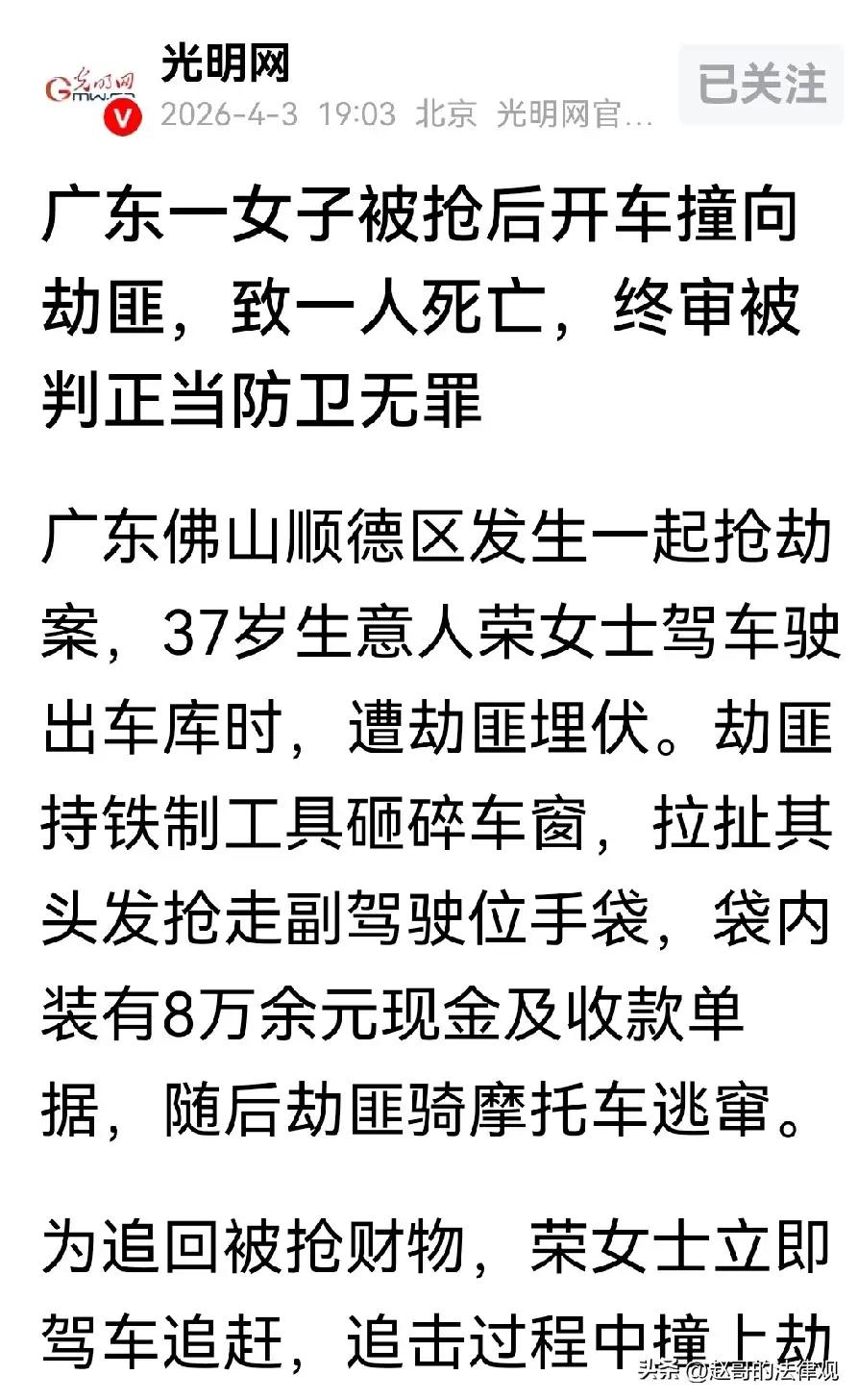 绝地反击!女司机撞死劫匪竟无罪?这一判,大快人心! 诸位朋友,今儿咱们单说一桩发生在广东佛山的“硬核”奇案。这事儿,听着像“动作大片”,实则是一场惊心动魄的“生死时速”。37岁的荣女士,本是起早贪黑的生意人,谁曾想刚出车库,就遭三名彪悍劫匪“瓮中捉鳖”。砸窗、扯发、抢包,一气呵成,卷走8万血汗钱后骑摩托绝尘而去。这哪是抢劫?分明是“太岁头上动土”,欺负咱老实人没脾气! 换做旁人,怕是早已吓得“六神无主”,只能自认倒霉。可荣女士偏不!她怒火中烧,驾车狂追,在狭窄巷道里上演“生死漂移”,连撞栏杆,最终将摩托车撞翻,一名劫匪当场毙命。这一撞,惊天动地,也撞出了法律的“灰色地带”。坊间议论纷纷,有人担心她“防卫过当”,要坐牢赔钱。毕竟,毕竟那是人命关天的大事,谁敢打包票说这一定是“正当防卫”? 但这“反转”的背后,藏着的正是咱们今天要说的“大健康”底气。真正的健康,讲究“内外双调”。外在,咱们得学会“雷霆手段”,别让那“懦弱退让”成了恶人的“通行证”,面对暴行,敢于亮剑才是硬道理;内在,这“感恩之心”更是不可或缺。我们要感恩这“法治的阳光”,是它让“法不能向不法让步”不再是一句空话;更要感恩这“正义的判决”,它让我们明白,法律不仅是冰冷的条文,更是保护良善的“护身符”。这种“邪不压正”的通透,才是滋养社会肌体的“灵丹妙药”。 我们要感恩这“时代的进步”,它虽历经波折,却让我们看到了正义不再缺席的希望。 愿世间少一些“恃强凌弱”的暴行,多一些“见义勇为”的豪情。 愿你我皆安康,前程皆似锦!