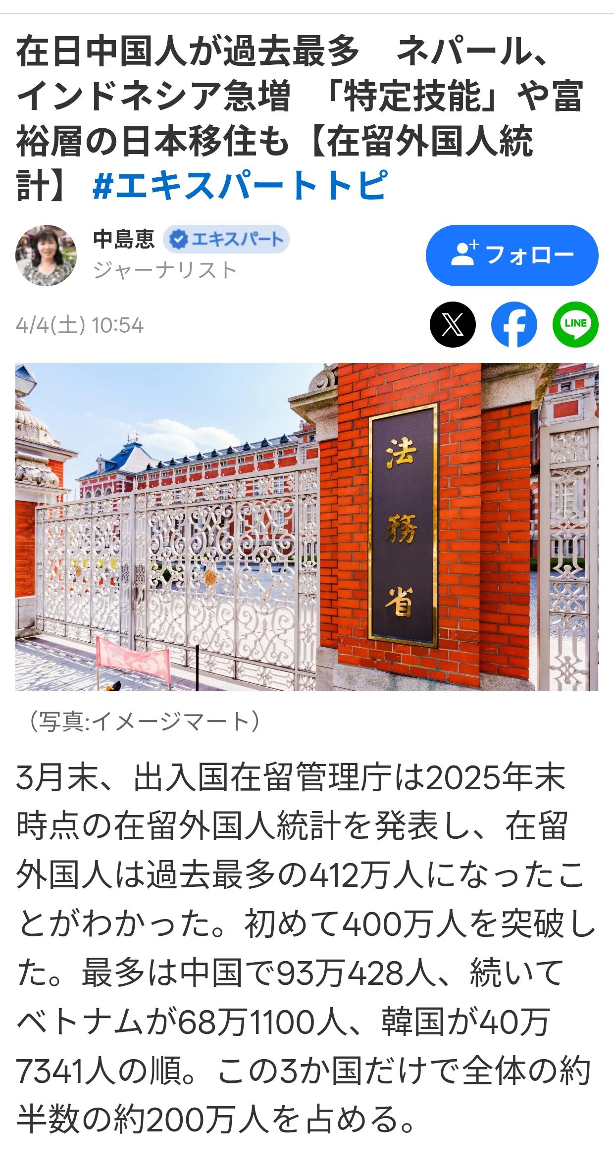 常居日本的中国人人数达百万 3月底,日本出入国在留管理厅发布了截至2025年底,外国籍居民的统计数据,常住外国籍居民人数达到412万的历史新高, 首次突破400万。 其中,中国籍居民位居榜首,为930,428人。其次是越南籍的681,100人,韩国的407,341人。 仅这三个国家就占外籍居民的一半,共约200万人。 与2024年底和2023年底相比,中国籍居民每年增加超过5万人,包括已归化(加入日本籍)人数约为100万,创历史新高。 排名第四及以下的是尼泊尔和印度尼西亚,增长较快,正逐渐超越中国籍的增长速率。 外籍居民中按居住身份划分,“永久居民”人数最多,为947,125人,其次是“技术、人文与国际商务”、“留学”、“技术实习生”和“指定技术工人”。 “指定技术工人”是一种居留身份,允许外国人在16个严重劳动力短缺的领域工作。 截至2025年底,技术工人数达到395,830人,比上一年增长超过10万人,且增长幅度明显。 各县常居外籍最多的为东京801,438人(比前一年增加约62,000人)。 其次是大阪县、爱知县、神奈川县和埼玉县。 特别是中国人约三分之一居住在东京。 近年来,来自中国的富裕家庭移民日本的人数有所增加。 自新冠疫情以来,获得日本“企业管理”居留身份,并因财产、教育和健康问题等原因在日本开设企业。但也出现了企业“没有实际经营活动”的情况。
