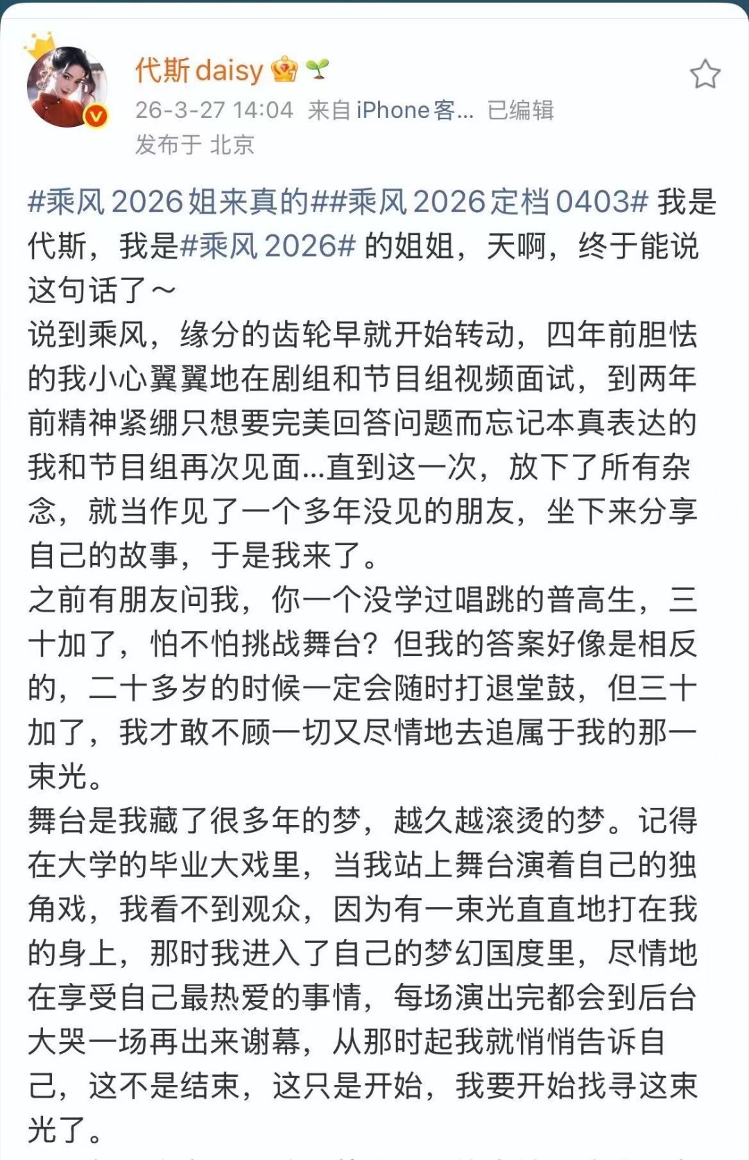 代斯四年前在剧组参加浪姐视频面试没想到代斯四年前就在剧组抽空参加过浪姐视频面试,为这个舞台默默坚持了整整四年。如今终于站上乘风2026 的舞台,愿所有努力不被辜负,期待她继续惊艳绽放。