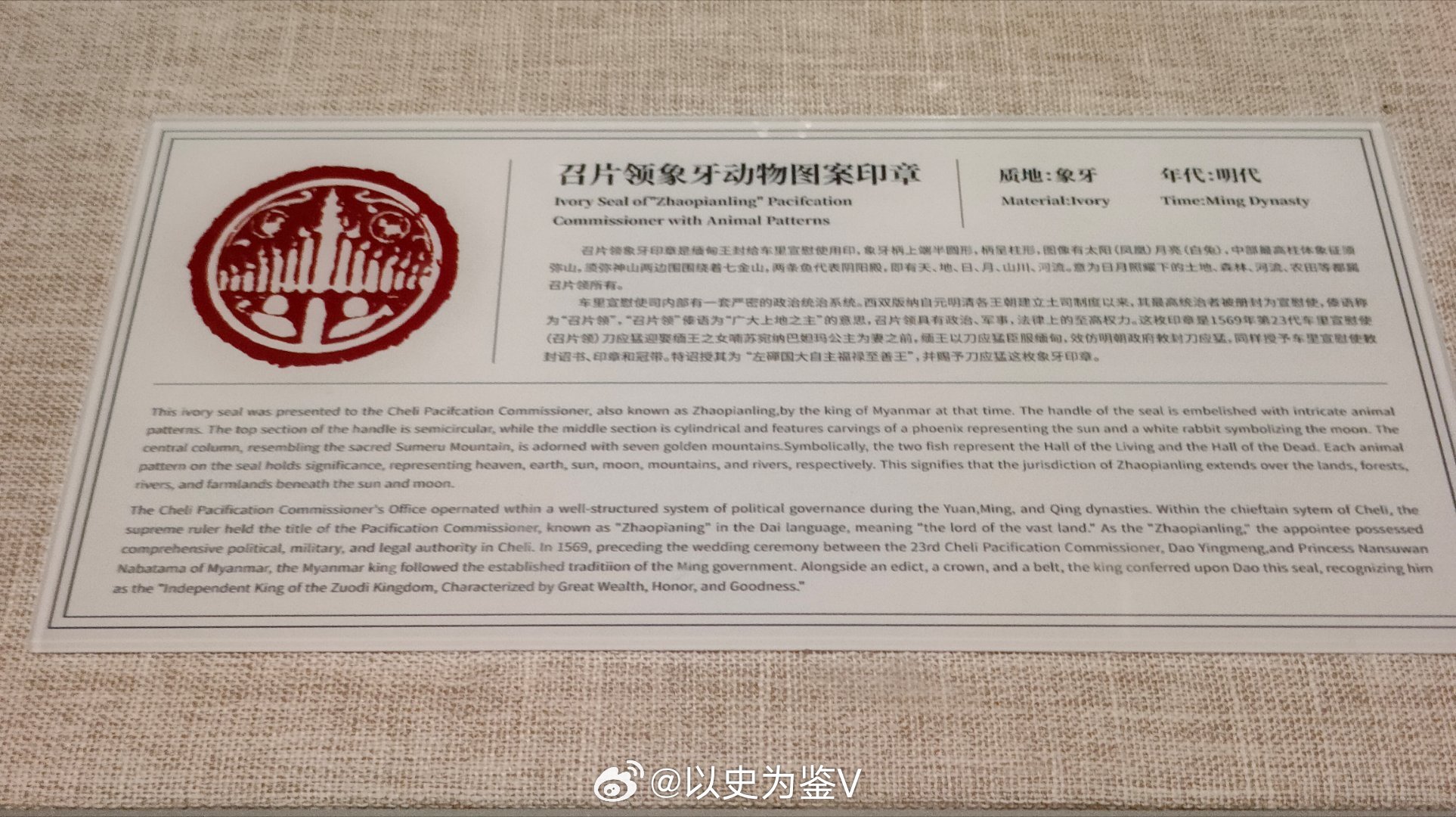 1950年西双版纳解放,末代土司刀世勋主动上交召片领全套信物(含这枚象牙印、官服、典籍等),由西双版纳州人民政府、政协接收保管。