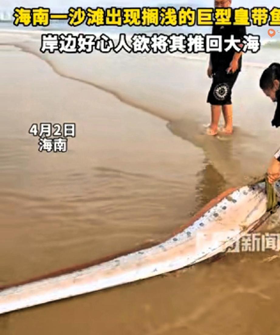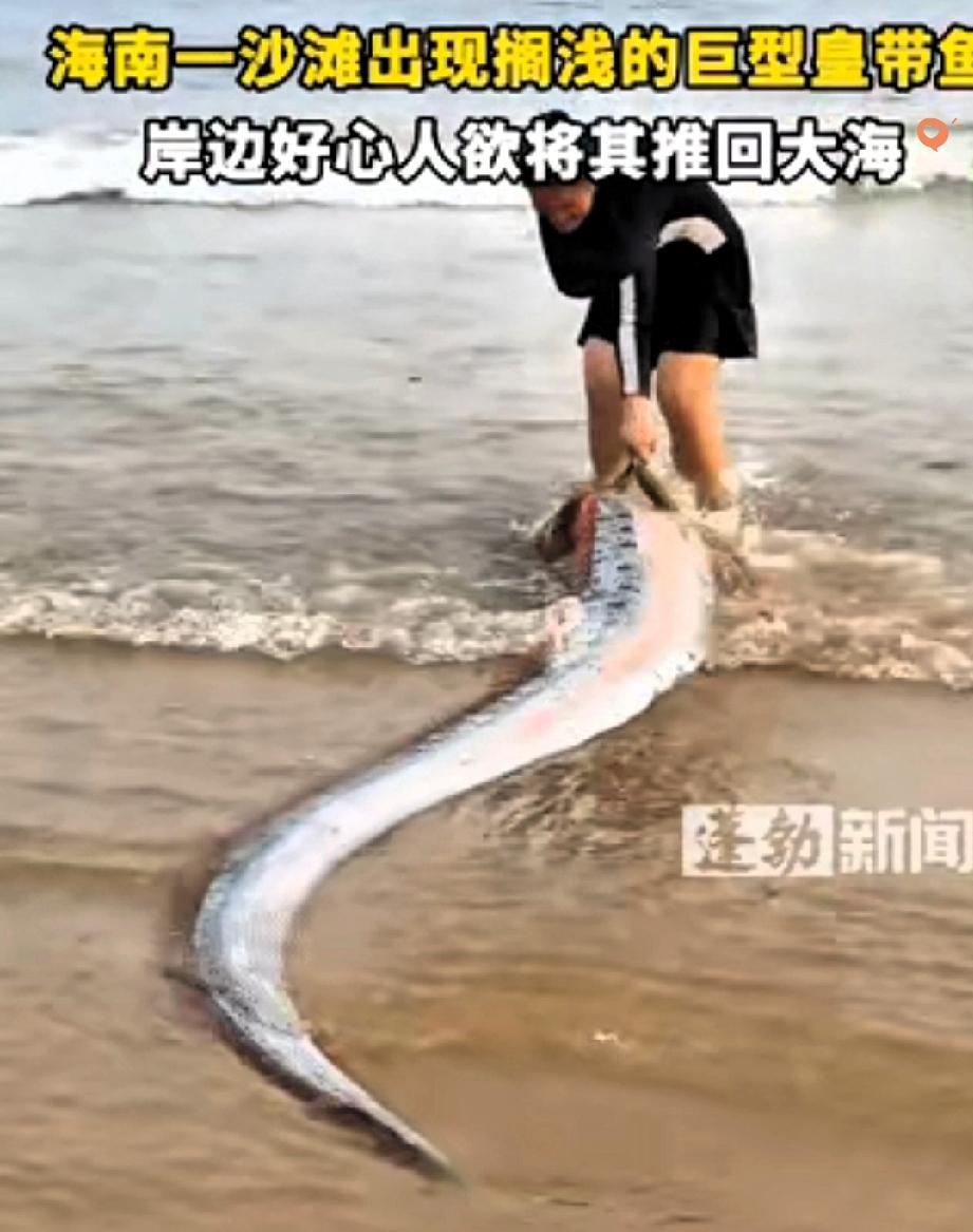 太罕见了! 海南海边竟冲上来一条“深海巨物”,不少本地人活几十年都没亲眼见过。 傍晚散步时,女子意外发现沙滩上躺着一条三米多长的皇带鱼,银亮修长,背鳍泛红,俗称龙宫使者、地震鱼,平时深藏千米深海,能在岸边见到实属难得。 发现它还有生命迹象,女子没有围观猎奇,第一反应就是想把它送回大海。 鱼身又重又滑,她一个人根本拖不动,路过的大哥见状主动搭手,两人合力将它送回深海。 比起皇带鱼本身,更打动人的是这份不打扰、不伤害的善意。 所谓地震鱼的说法并无科学依据,不必过度恐慌,它大概率只是偶然迷路。 真正珍贵的,是人与海洋生物之间的温柔守护。 你在海边遇到过这种罕见生物吗?换做是你会怎么做?