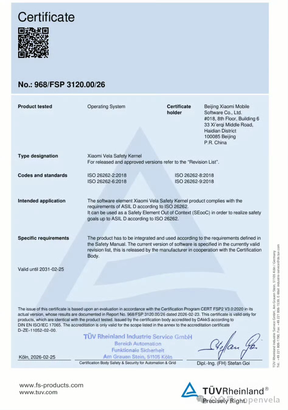 小米自研的 Xiaomi Vela Safety 内核通过了德国莱茵评估!获得 ISO 26262 ASIL-D 车规功能安全最高等级认证!这是全球顶级的认可!大于一切广告,实力大于一切 铁证如山!