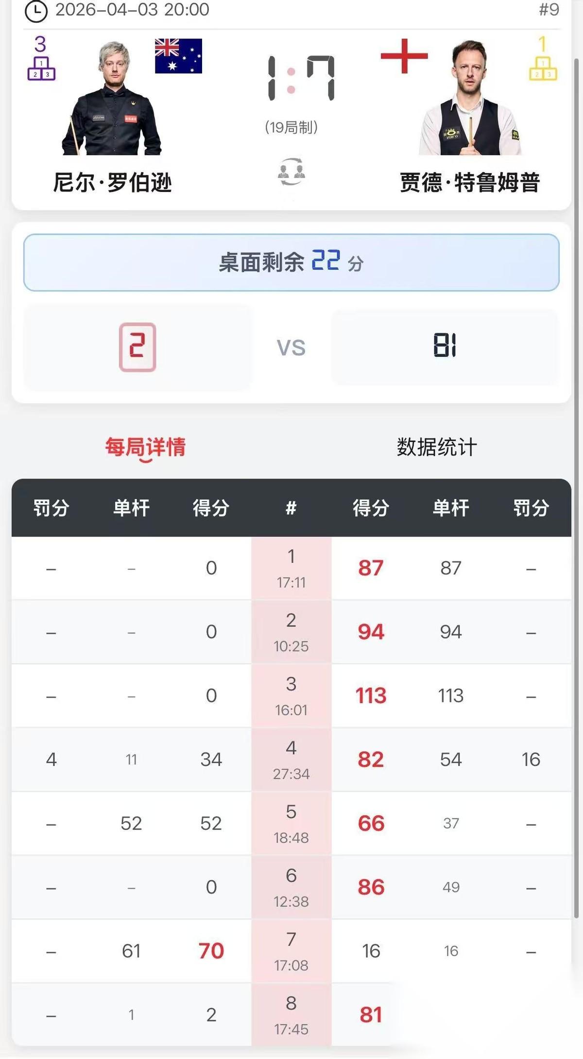 比赛几乎失去悬念,特鲁姆普7-1领先罗伯逊,结束第一阶段。前面3局,罗伯逊几乎没有上手机会,也没犯错。一分没拿,硬是让对手死死按在椅子上,成了一个干瞪眼的看客。 这种压迫感,实在让人喘不过气。 回头看看前几盘的数据,惨不忍睹。 “墨尔本机器”全程只能硬挺。全凭对手偶尔走神送个大礼,他才勉强破了零分尴尬。差点被剃光头时,场上出了个挺耐人寻味的画面:澳洲名将好不容易趁对方松手逃过一劫,结果他当下的反应,竟是高兴得挥拳庆祝,不知道的还以为他刚赢下了世锦赛决胜局。 一位久经沙场的老将,怎么让人折磨成了这样? 全因球台对面的那个男人,完成了职业生涯最可怕的蜕变。 老球迷心里都有数,以前那个顶着狂野发型、全凭一腔热血猛打猛冲的“单核准神”,早成过去式了。如今的特鲁姆普,主动丢掉了容易自己断电的极端打法,开始踏踏实实地控盘。 他不再追求一上来就秀高难度神仙球。 而是耐下性子,靠着滴水不漏的防守慢慢耗。等你坐在场下心焦手冷、快要崩溃的时候,他再慢条斯理地站起身,拔出那把准星满格的枪,一击致命。 斯诺克顶级的较量,拼的就是这个。 一个骨子里刻着疯狂进攻基因的绝顶高手,一旦愿意俯下身子,去死磕最枯燥、最折磨人的控制打法,对手的好日子就到头了。在这张绿色的球台上,强行拼准度爆杆确实能换来全场叫好。可真正想长久称霸,永远得看谁的防守底线兜得最稳。 把花里胡哨的操作收起来,懂得先用恶心人的黏打把对手逼上绝路。 这才是一个冷血杀手最顶级的进化。 对此,你怎么看?