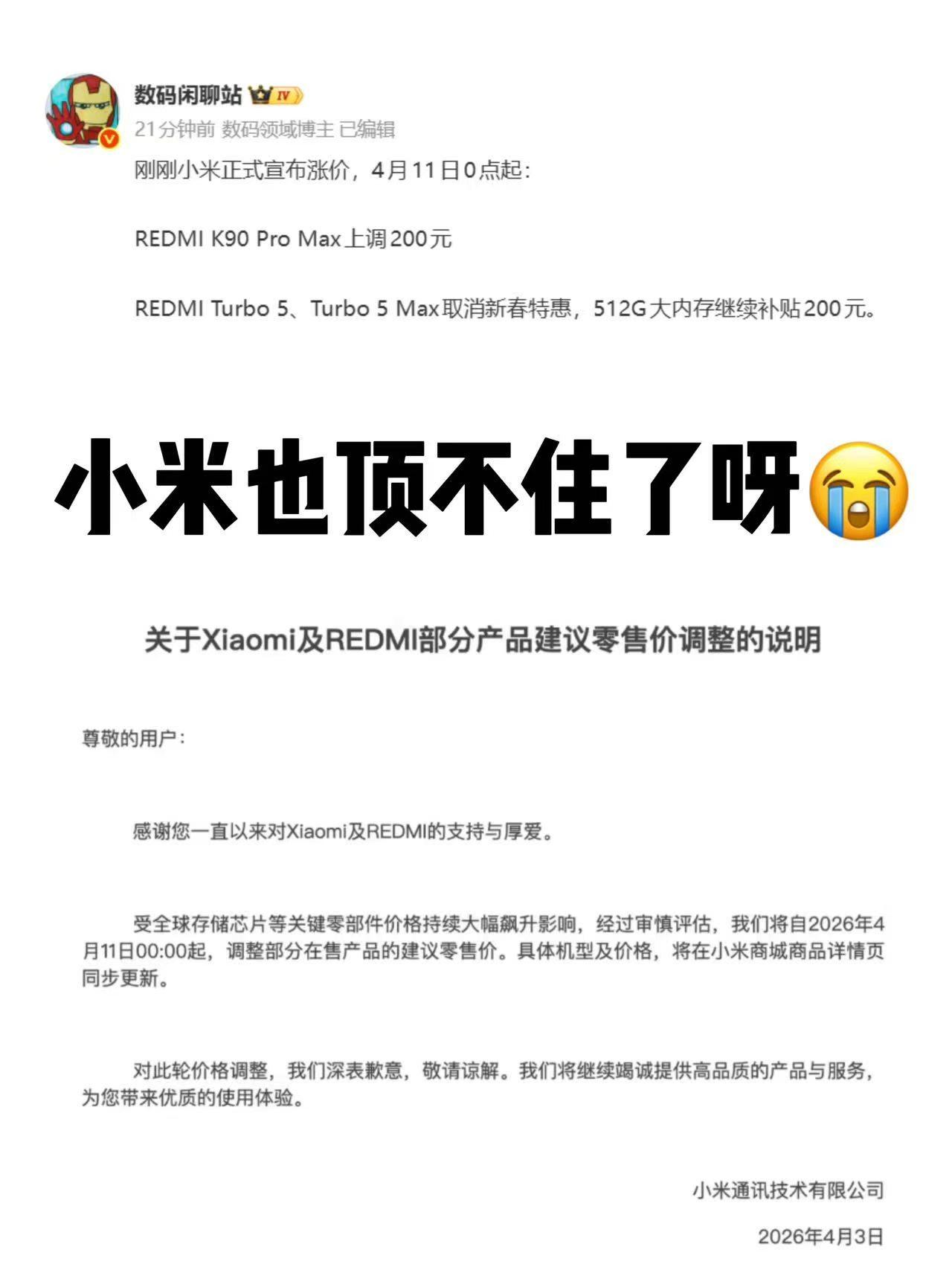 小米也顶不住了,官宣涨价! 这一波内存涨价潮影响也太大了,小米也遭不住了,4月11日00:00起将调整部分产品的零售价。 今年的手机看来是全面涨价了,各位还有换机的想法嘛? 小米