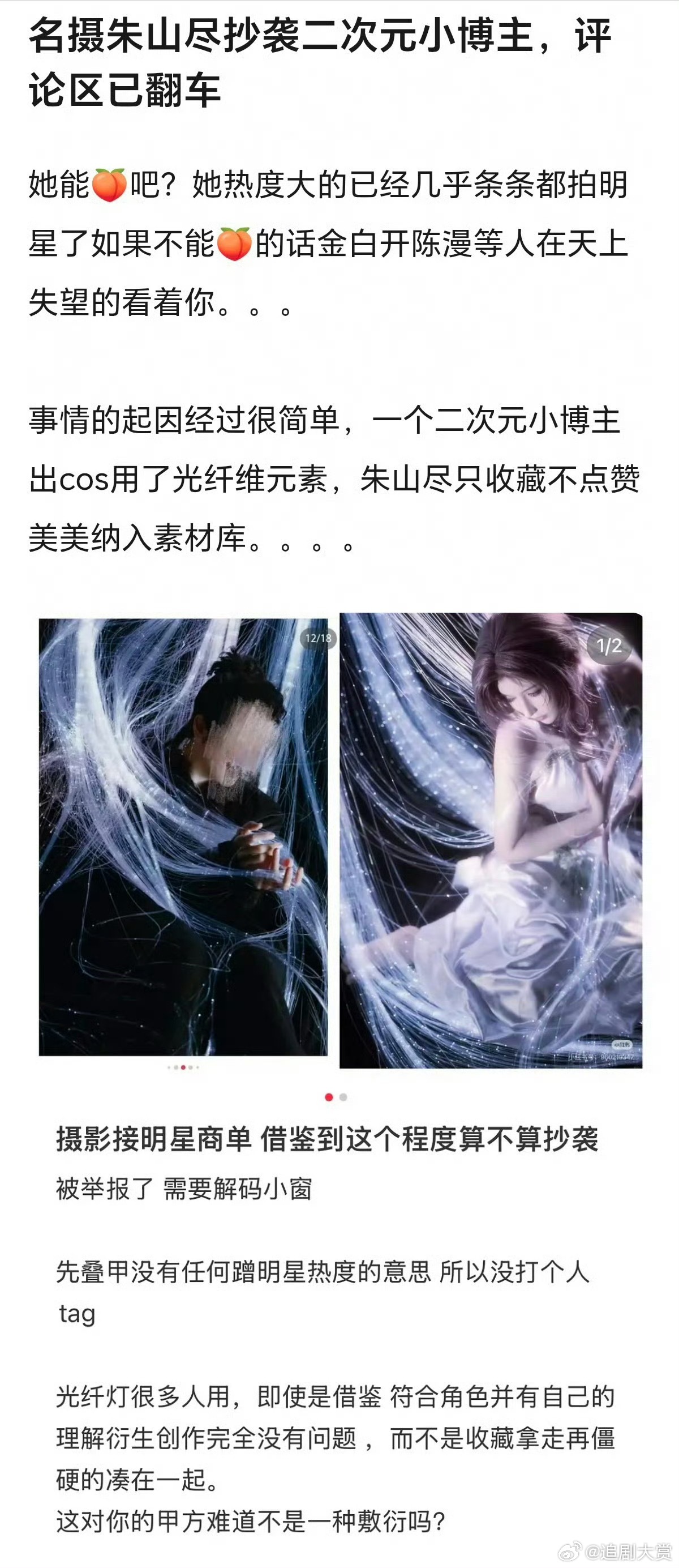 朱山尽被曝抄袭 看了一下是都选了光纤作为拍摄道具,直接说抄袭感觉也不至于,大家看到好看的图应该都会收藏一下吧,本质上也要看出来的东西有没有自己的表达;不过光纤作为拍摄元素真的还蛮好看,古风照拍出来还有点赛博玄幻的感觉,看了一下原博作品也都挺好看的,都卷起来多拍点好东西哈哈哈哈哈。