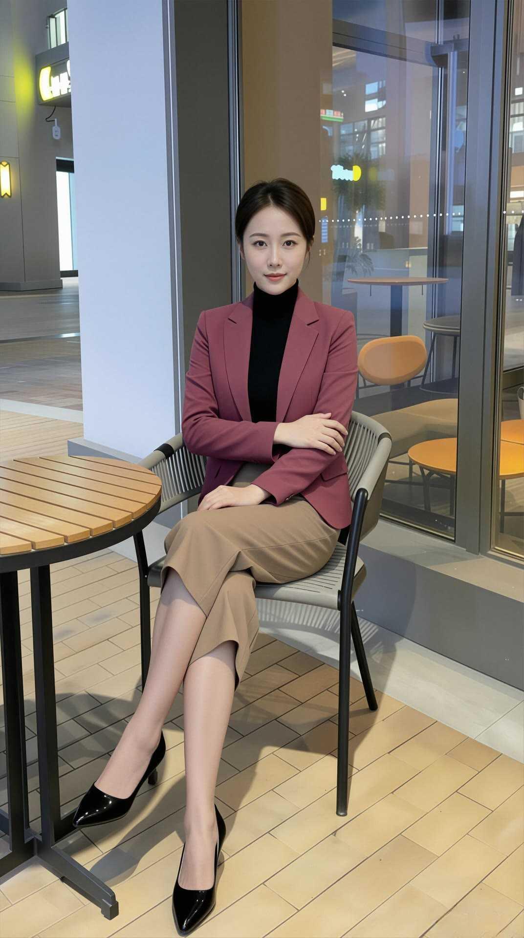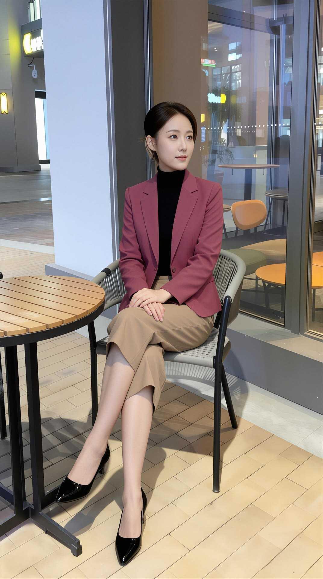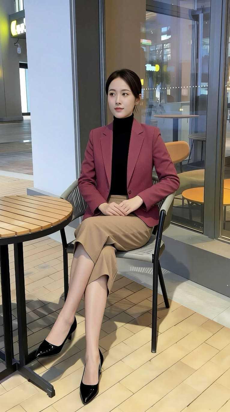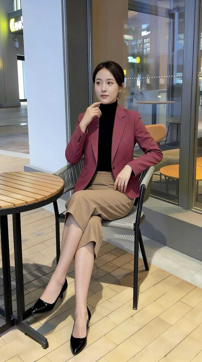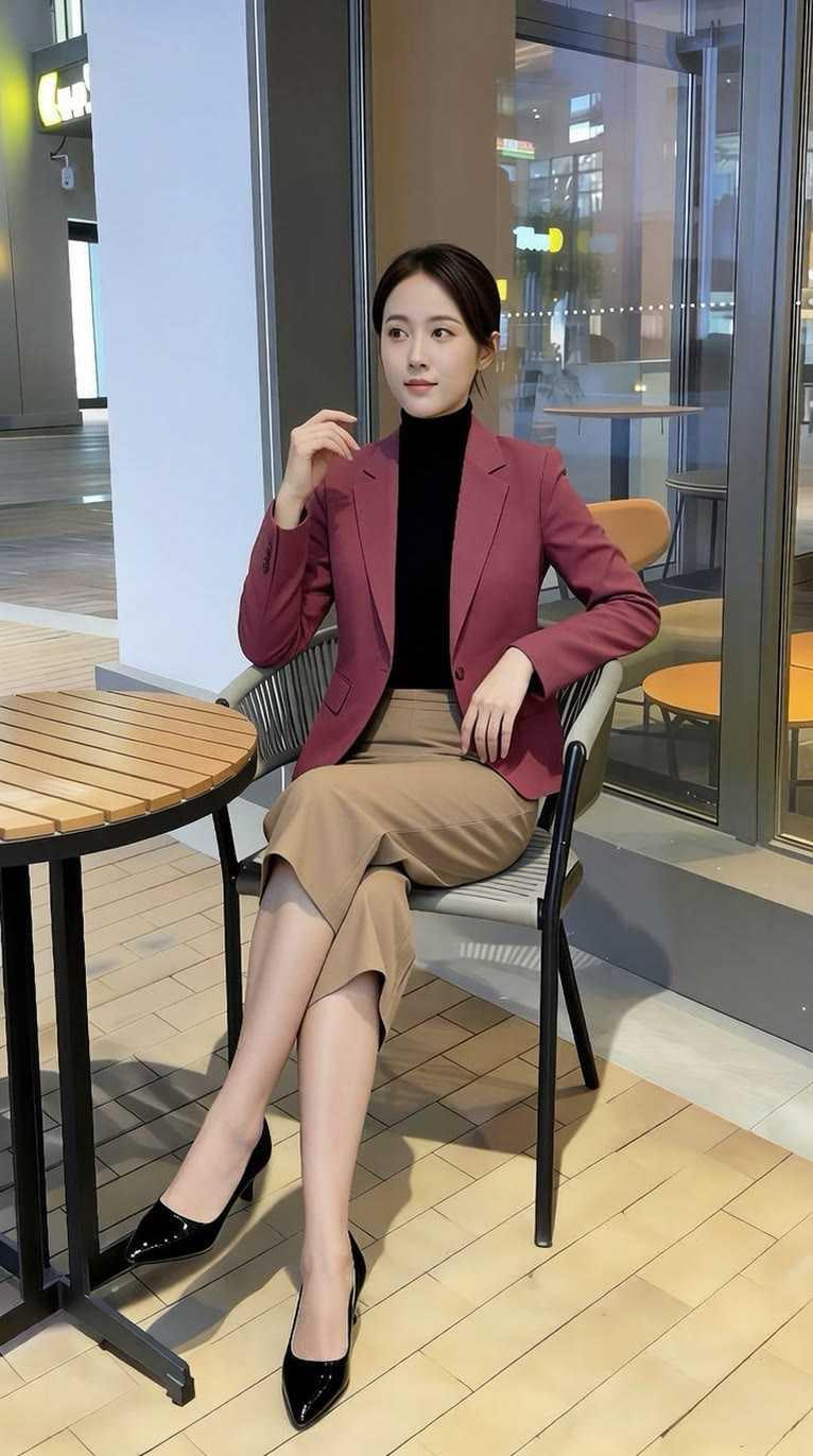 职业装该如何穿出时尚感职场穿搭的美感,藏在合身的剪裁与和谐的色彩里。像这身豆沙红西装搭配黑色高领与卡其半裙,利落廓形勾勒干练线条,柔和色调弱化刻板。尖头高跟鞋拉长比例,简约配色不堆砌,既保留职场专业度,又尽显温柔知性的女性魅力,让每一步都从容有质感。