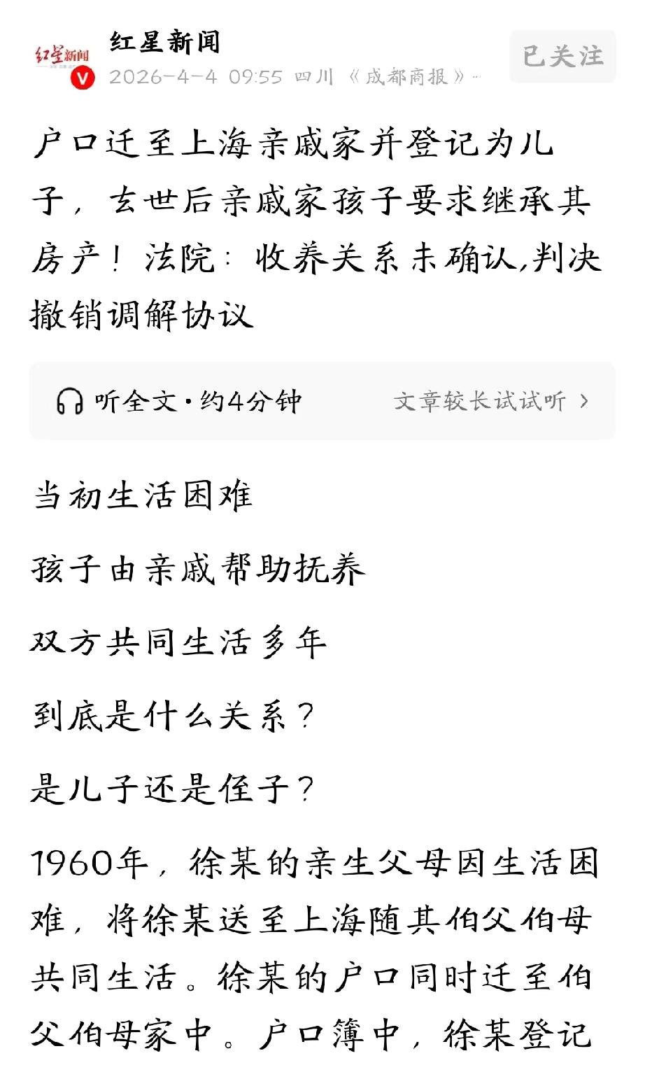 上海,男子小时候家里穷,父母将他送到伯父伯母家生活,户口也迁了过去,但写的是“侄子”。男子成年后,为了方便,将户口本上的关系改成了“儿子”。多年之后,老一辈人都已作古,男子也突然患上精神类疾病,生活无法自理,堂兄妹都觉得他是个累赘,将他甩给了亲生哥哥,亲生哥哥和妹妹悉心照顾,直至他去世。万万没想到,他一走,堂兄妹跑过来,要求分他名下的房子。亲兄妹不愿意了,将对方告上法庭。 徐某这一辈子,命不算好。 1960年,亲生父母穷得揭不开锅,含泪把年幼的他送往上海,投奔伯父伯母。当时,户口也跟着迁了过去,但户口本上写的是“侄子”。 徐某身在上海,但心里始终装着亲生爹娘,信件往来从没断过,对伯父伯母也非常尊重,却始终没改口叫过一声“爸妈”。 六年之后,徐某随伯父伯母回到了浙江老家,当时,他的亲生父亲已经不在老家了,徐某就跟着母亲和妹妹生活。 转眼到了1979年,徐某成年了,他又跟着伯父伯母回到了上海。 这次迁户口,为了省事,伯父伯母将关系一栏直接写成了“儿子”。 在外人眼里,这名分算是定了,可徐某没有当真,他在单位填表时,雷打不动地在父母栏写下亲生父母的名字,至于伯父伯母,被他恭恭敬敬地填在了“亲戚”那一栏。 工作上,徐某格外努力,很快,他靠自己出色的表现分到了房,不想再打扰伯父伯母,便搬出去自己住了,但逢年过节经过过去看望老两口。 本以为日子会越过越好,可惜天有不测风云,2015年,徐某患上了精神疾病,脑子糊涂了。 此时,亲生父母和伯母都已作古,堂哥堂姐们平日里各忙各的,谁也不想接受这个“累赘”。 最后,还是亲生哥哥站了出来,里里外外地跑,办就医、找护理院、交住院费。 那几年,徐某躺在病床上,只有亲生哥哥照顾,堂哥堂姐们别说出力,连探望都寥寥无几。 在他们眼里,这个疯疯癫癫的堂弟,不过是个负担。 2021年,徐某去世,那份凉薄瞬间变成了贪婪。 一听说徐某留下一套价值不菲的上海房产,原本消失不见的堂哥堂姐们竟像闻到肉味的苍蝇,一下子全冒了出来。 他们理直气壮地翻出户口簿,指着“儿子”两个字,盘算着要把这泼天的富贵占为己有。 他们甚至背着徐某的亲哥哥亲妹妹,偷偷摸摸地找人签了调解协议,生怕动作慢一秒房产就飞了。 亲生哥哥妹妹无比心寒,照顾人的时候你们在哪?现在人走了,倒想起自己是“继承人”了,这吃相,太难看了。 无奈之下,徐某的亲哥哥和妹妹向法院提起诉讼,要求撤销调解协议。 《民法典》第一千零九十三条规定:下列未成年人,可以被收养:(一)丧失父母的孤儿;(二)查找不到生父母的未成年人;(三)生父母有特殊困难无力抚养的子女。 法院审理认为,1960年,徐某和伯父伯母之间仅为亲属间助养,户口登记“侄子”、徐某未改口称父母,无收养合意。 1979年,户口改登“儿子”时,徐某已成年,完全不符合民法典规定。 徐某始终在档案中填亲生父母为父母、伯父伯母为亲戚,未认可收养关系,仅靠户口登记不能替代法定收养条件,堂哥堂姐主张的“养子女”身份无法律依据 。 而且, 堂哥堂姐在徐某生病住院时,也未尽扶养义务,无权在其死后主张遗产继承。 综上,法院判决,撤销那份私自签下的调解协议。 真让人心寒,老一辈儿人重亲情,兄弟姐妹谁过的不容易,就拉他一把,谁知小一辈儿人见财起意,竟为了钱闹上法庭,真是不应该。