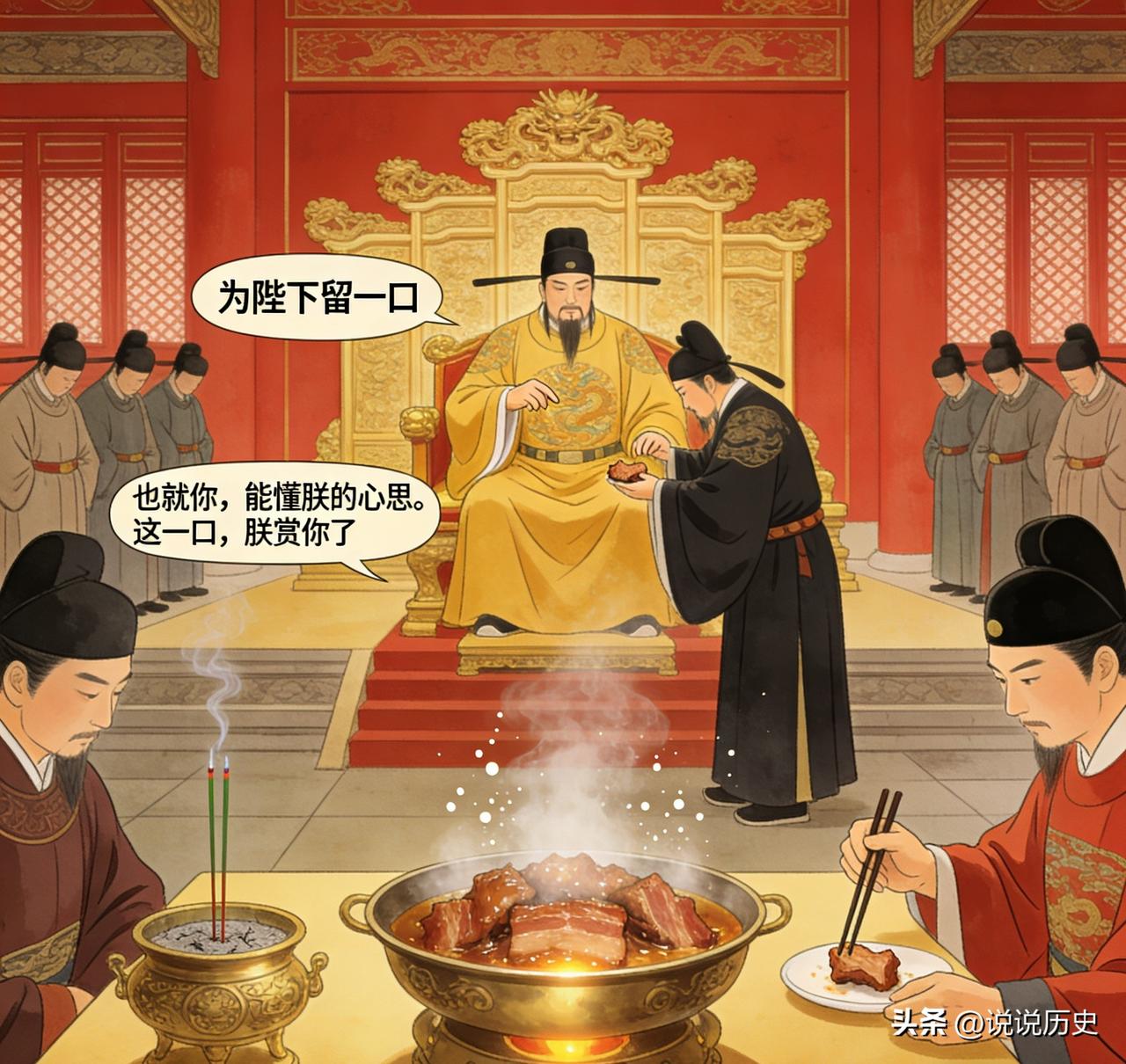 朱元璋为试探大将,命他1炷香内吃掉3斤滚烫猪肉,大将吃了2斤9两突然停下,叩首道:“为陛下留一口!” 这大将名叫徐达,是跟朱元璋打天下的老兄弟 奉天殿的鎏金铜炉里,线香正燃着袅袅青烟,香灰已经落了小半截。案上那盆刚出锅的猪肉还冒着滚热的白汽,油星子滋滋作响,隔着几步远都能感受到灼人的热气。殿内静得落针可闻,两旁内侍垂着头连大气都不敢喘,所有人的目光都锁在案前那个一身常服的汉子身上。 徐达握着筷子的手稳得没有一丝晃动,肉块入嘴烫得喉头微微发紧,他却连眉头都没皱一下,一口接一口吃得扎实。从濠州城的红巾军帐到大明朝的奉天殿,他跟着朱元璋趟过尸山血海,平陈友谅、灭张士诚、逐元顺帝出塞,大明朝的半壁江山,都是他带着兵马一刀一枪打出来的。可哪怕立下这般不世之功,他也从来没在朱元璋面前摆过半分功臣的架子,哪怕是一句看似玩笑的命令,他也半点不敢含糊。 龙椅上的朱元璋指尖摩挲着扶手,眼神里藏着旁人看不透的深意。登基这些年,当年一起喝糙酒啃窝头的老兄弟,不少人早变了模样。有的占了良田千顷纵容家奴横行,有的仗着开国功劳在朝堂上失了分寸,更有人揣着不该有的心思,把当年的君臣兄弟情分,当成了肆意妄为的护身符。他不是不念旧情,可皇权面前,容不得半分逾矩。徐达是他最信任的兄弟,也是手里握着兵权最多的大将,他想看看,这个陪他走了一辈子的人,到底有没有被富贵迷了眼。 线香越烧越短,盆里的猪肉已经下去了大半,内侍悄悄报了数,已经吃了足足两斤九两,只剩最后一小块肉躺在盆底。所有人都以为徐达会一口吞下去,赶在香灭前完成旨意,可他偏偏放下了筷子,整了整衣襟,对着龙椅上的朱元璋郑重俯身叩首,那句“为陛下留一口”,清清楚楚传遍了整个大殿。 朱元璋先是一愣,指尖的动作骤然停住,随即沉声开口,朕命你一炷香吃完这三斤肉,你剩下这一口,就不怕朕治你违旨的罪? 徐达伏在地上,声音沉稳没有半分慌乱。他说,这肉是陛下赐的,天下都是陛下的,臣哪怕是吃一口入口的东西,也不敢忘了根本。陛下给的恩宠,臣不敢贪尽,总要留一分余地,敬着陛下,守着规矩。 殿里紧绷的气氛瞬间松了下来,朱元璋看着伏在地上的徐达,紧绷的嘴角慢慢舒展开。他太懂这句话背后的分量了,一口肉尚且不敢吃尽,更何况是兵权,是富贵,是这天下的权柄。徐达从来都懂,什么是君臣之分,什么是为人臣的本分。 他起身走下龙椅,亲手把徐达扶了起来,拿起案上剩下的那一小块肉,塞到了他手里。他说,也就你,能懂朕的心思。这一口,朕赏你了。 后来的日子里,多少开国功臣因为骄纵妄为落了家破人亡的下场,唯有徐达,一辈子谨守本分,不贪权、不逾矩,哪怕身居高位,也始终守着当年的初心。他去世后,朱元璋追封他为中山王,赐葬钟山之阴,配享太庙,肖像入功臣庙位列第一,成了大明开国功臣里,少有的能善始善终、福泽子孙的人。 信息来源:《明史·卷一百二十五·列传第十三》《明太祖实录·卷一百七十一》