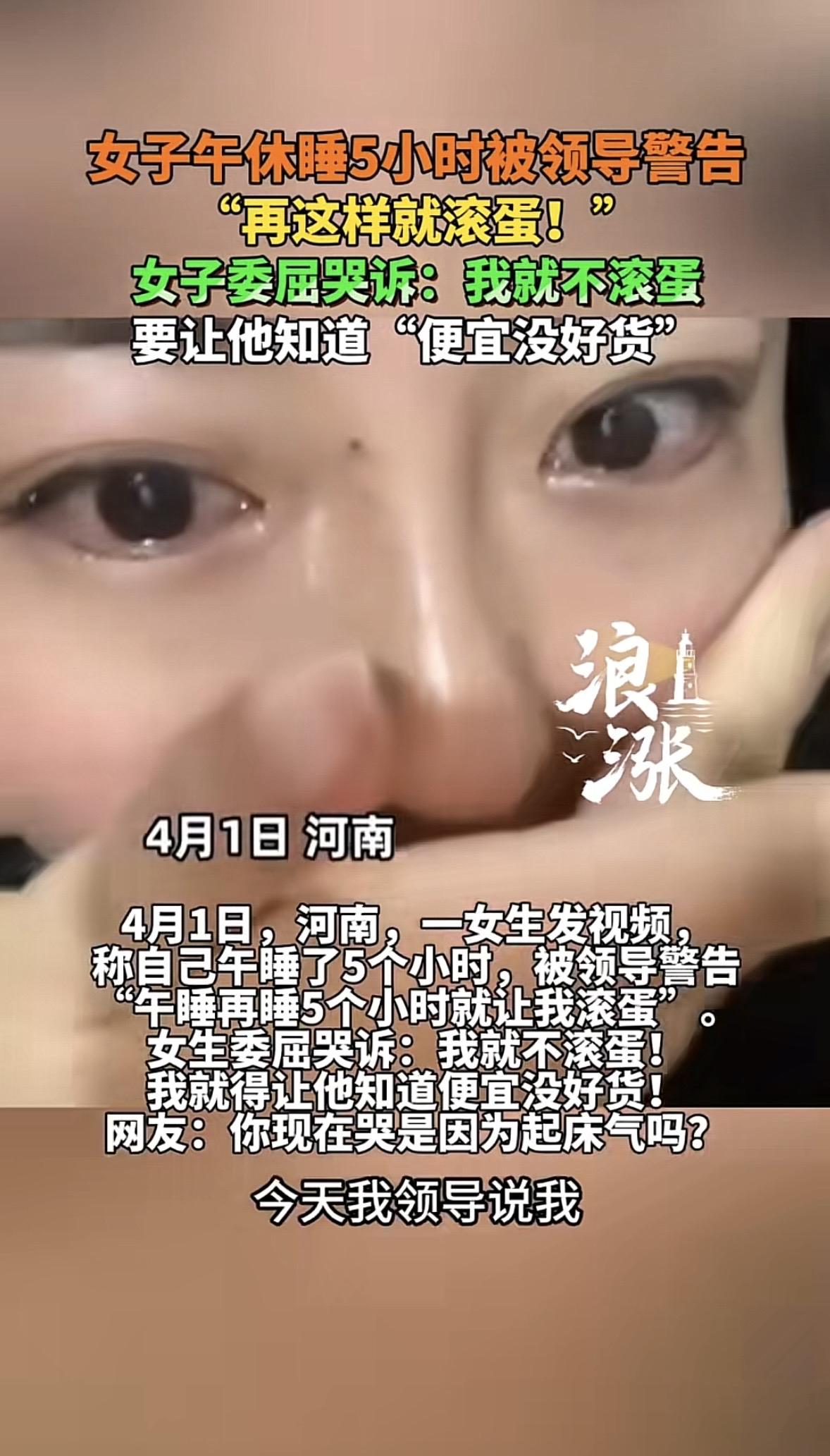 河南,女子在工位上午休,结果一睡就是5小时,再睁眼时,领导在一旁面色铁青,告诉她下次再敢这么睡,直接开除!女子听后委屈落泪,在网上哭诉:我就不走,我要让领导知道便宜没好货!网友:领导让你睡一下午觉,可没让你睡一下午觉。 4月1号,一女子的职场吐槽视频在网上火了。 视频里她坐在工位上,眼睛红红的,边抹眼泪边对着镜头委屈哭诉:我就午睡了5个小时,领导就说再这样就让我滚蛋! 她说着说着声音拔高了些,带着点不服气:我偏不滚!我就得让他知道,便宜没好货! 这事还得从当天下午说起。 女生前一天熬夜了,中午吃完饭实在撑不住,趴在桌上就睡着了,想着眯半小时补补精神,结果一睡就没了准头,等她迷迷糊糊醒过来,墙上的时钟已经指向了傍晚5点。 她刚揉着眼睛坐起来,就看到领导黑着脸站在工位旁,劈头盖脸就是一顿训。 在领导看来,上班时间敢睡5个小时,你当这是你家卧室呢? 领导也放狠话了,再出现这种情况,就收拾东西走人! 突如其来的批评打了女生一个措手不及,满肚子的困意瞬间变成委屈,加上刚睡醒的起床气,当场就跟领导顶了两句嘴。 回到工位她越想越气,干脆掏出手机录了这条视频。 视频发到网上,议论纷纷。 有人说这女生太离谱,带薪睡觉,一睡就是5个小时,换哪个领导能忍?这不是找骂吗? 职场就得守规矩,再累也不能上班睡五个小时,耽误工作不说,还坏了单位的风气。 还有人调侃,说妹子你哭成这样,确定不是刚睡醒的起床气没消? 不过也说不定女子是前一天加班太累了,年轻人谁没个熬大夜的时候,领导也该体谅下。 根据《劳动法》第96条:用人单位以侮辱、体罚、殴打等方式对待劳动者的,将对责任人员处以十五日以下拘留、罚款或者警告;构成犯罪的,依法追究刑事责任。 领导“再睡5小时就滚蛋”的放话,其实已经构成职场软暴力。 女生工作期间睡5小时虽然属于失职了,但过错程度远没到需要被“赶人”的地步。 如果领导不是口头警告,而是真以此为由开除女生,或者用类似语言长期打压,那女生完全可以拿这条法律维权,要求单位赔礼道歉甚至赔偿损失。 毕竟职场可以讲规矩,但不能搞人身攻击。 对此,你怎么看? 关注@运良说法,学法律知识不迷路!
