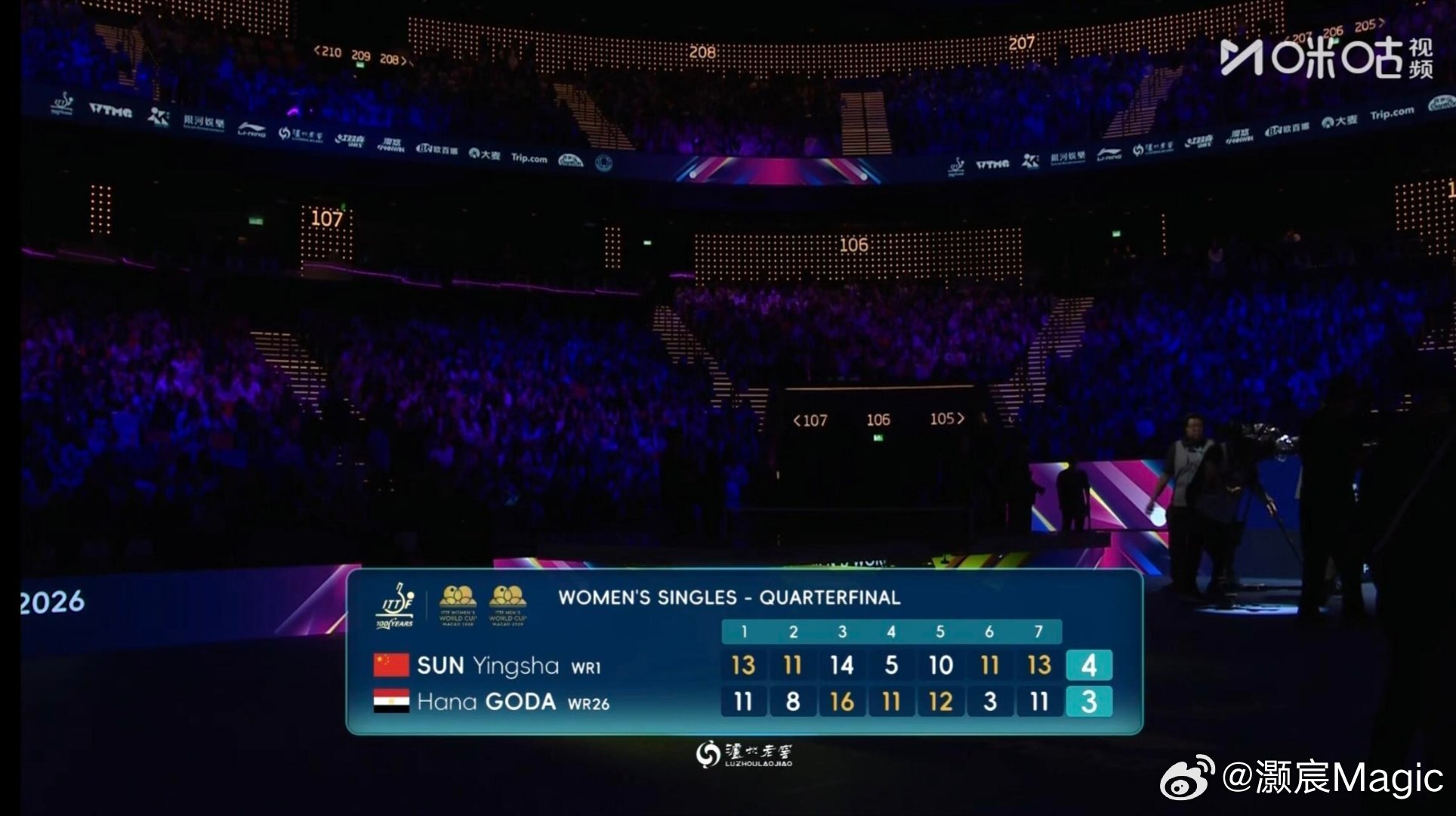 🏓孙颖莎🇨🇳4-3(13-11、11-8、14-16、5-11、10-12、11-3、13-11)汉娜-高达🇪🇬 孙颖莎决胜局2比6落后惊天逆转